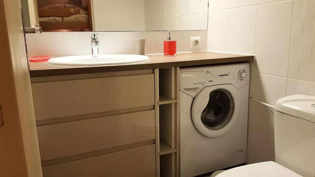 - The main room is divided into 2 spaces: the living room with a sofa bed and the kitchenette with its dining area