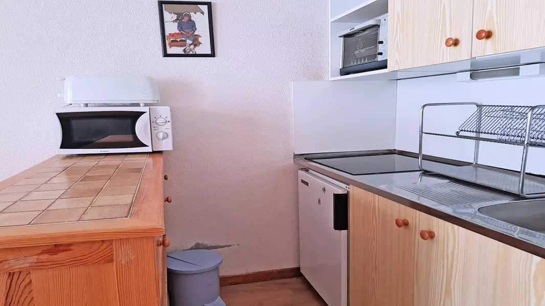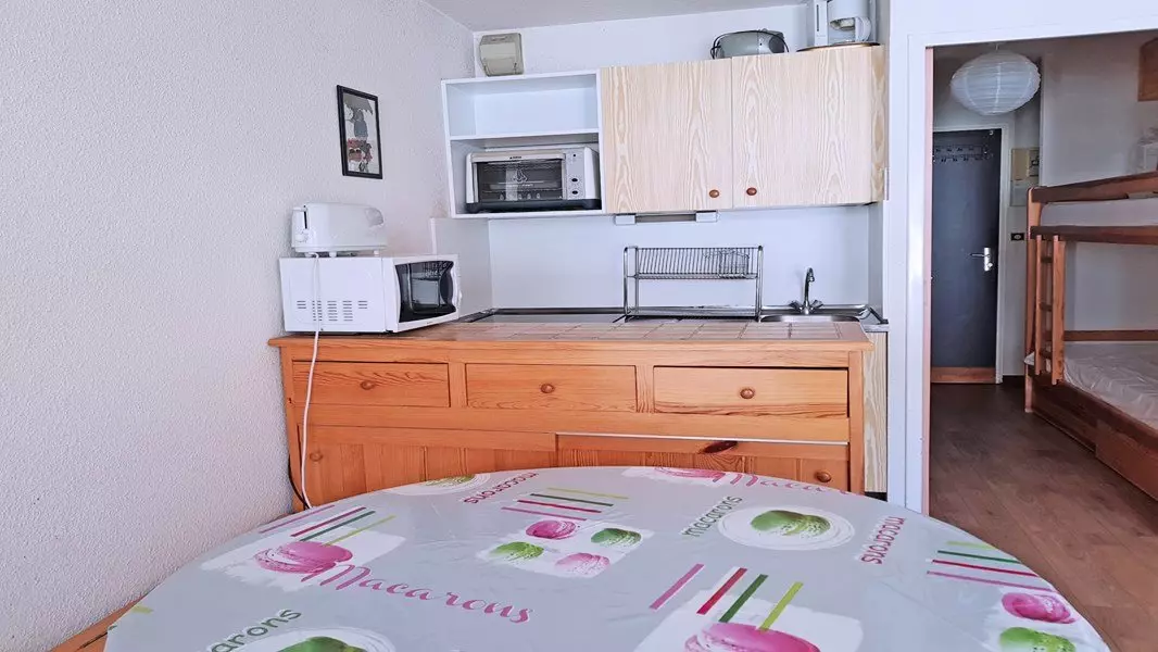 Equipped kitchenette: 2-burner electric hob, mini-oven, filter coffee maker, electric kettle and toaster
