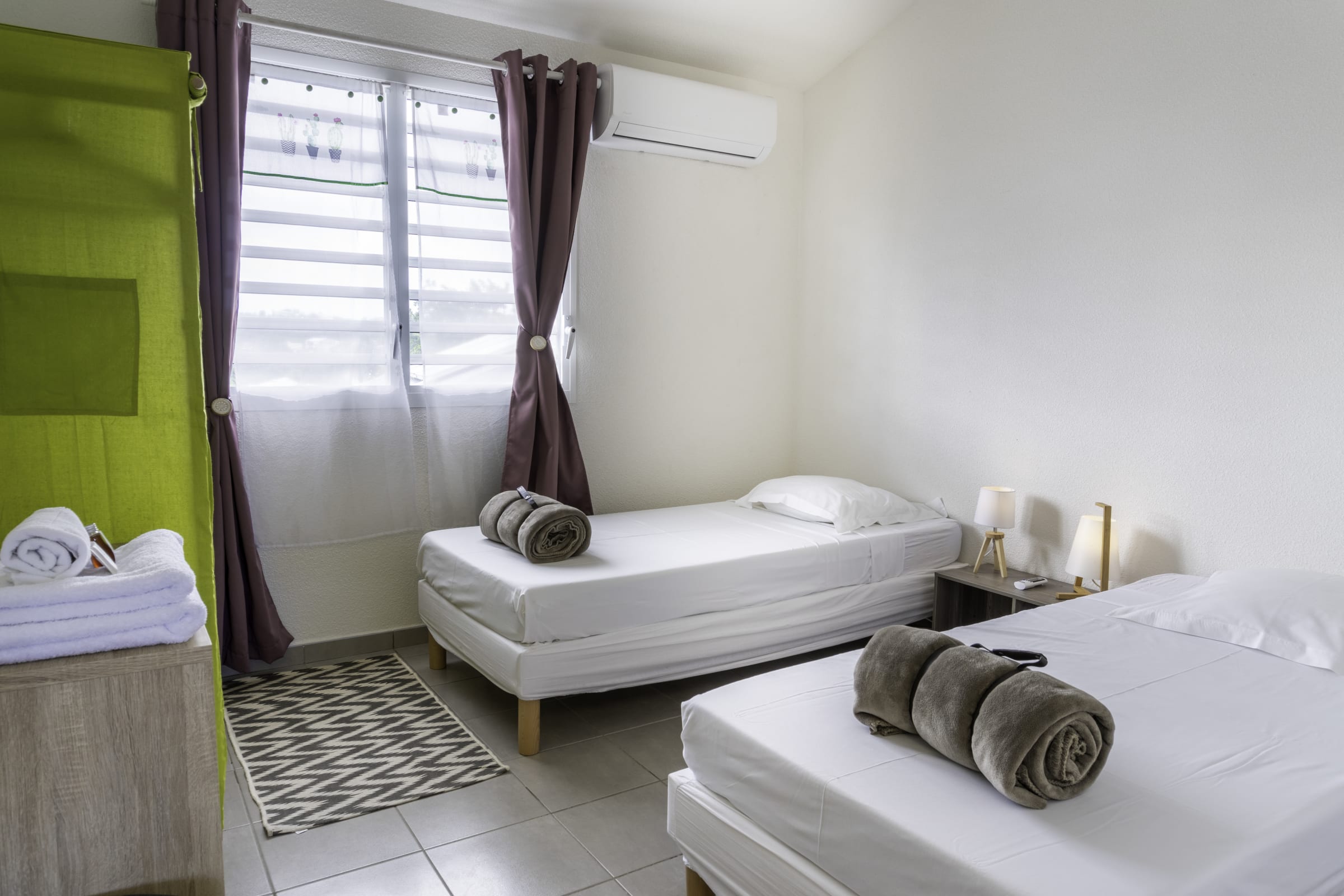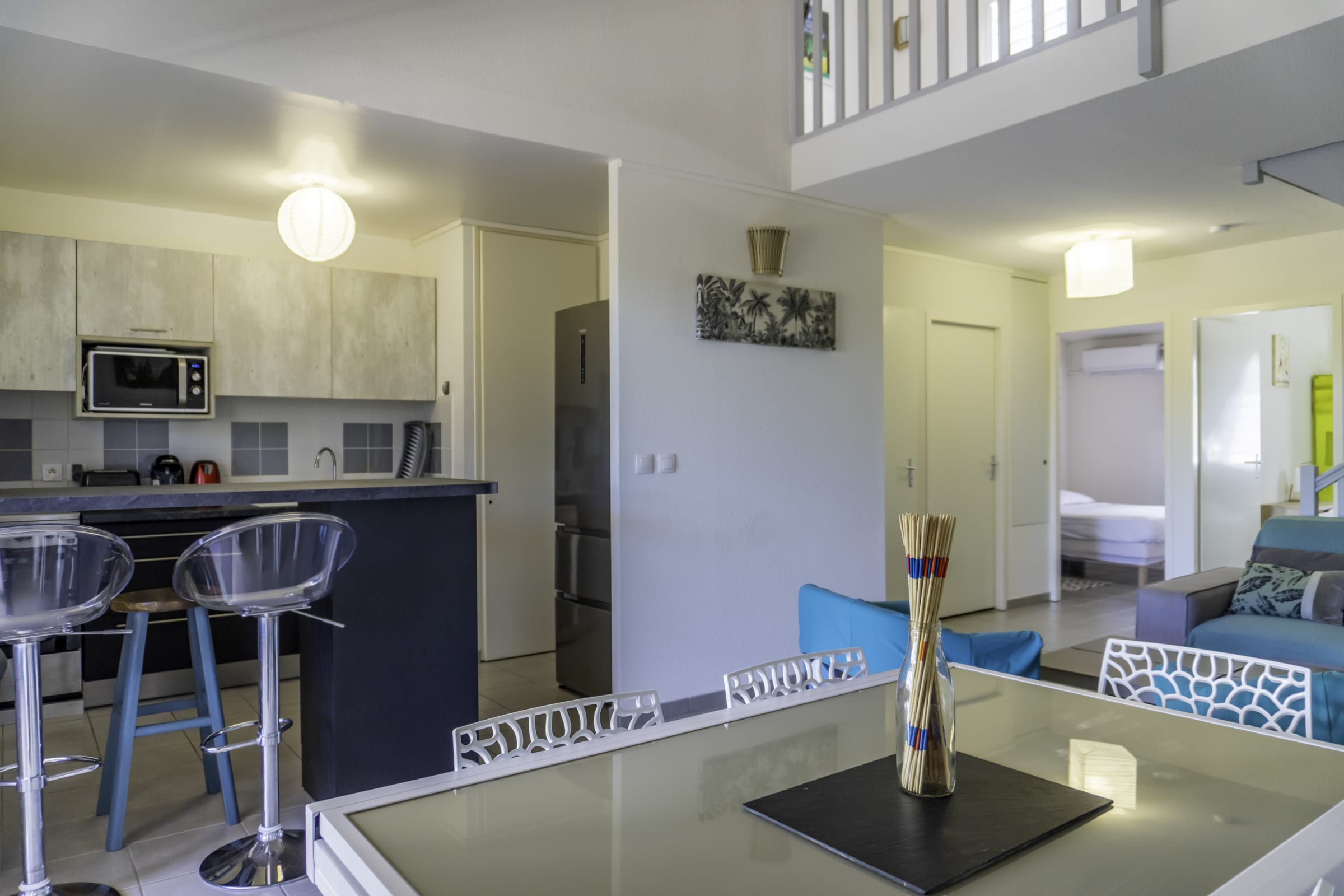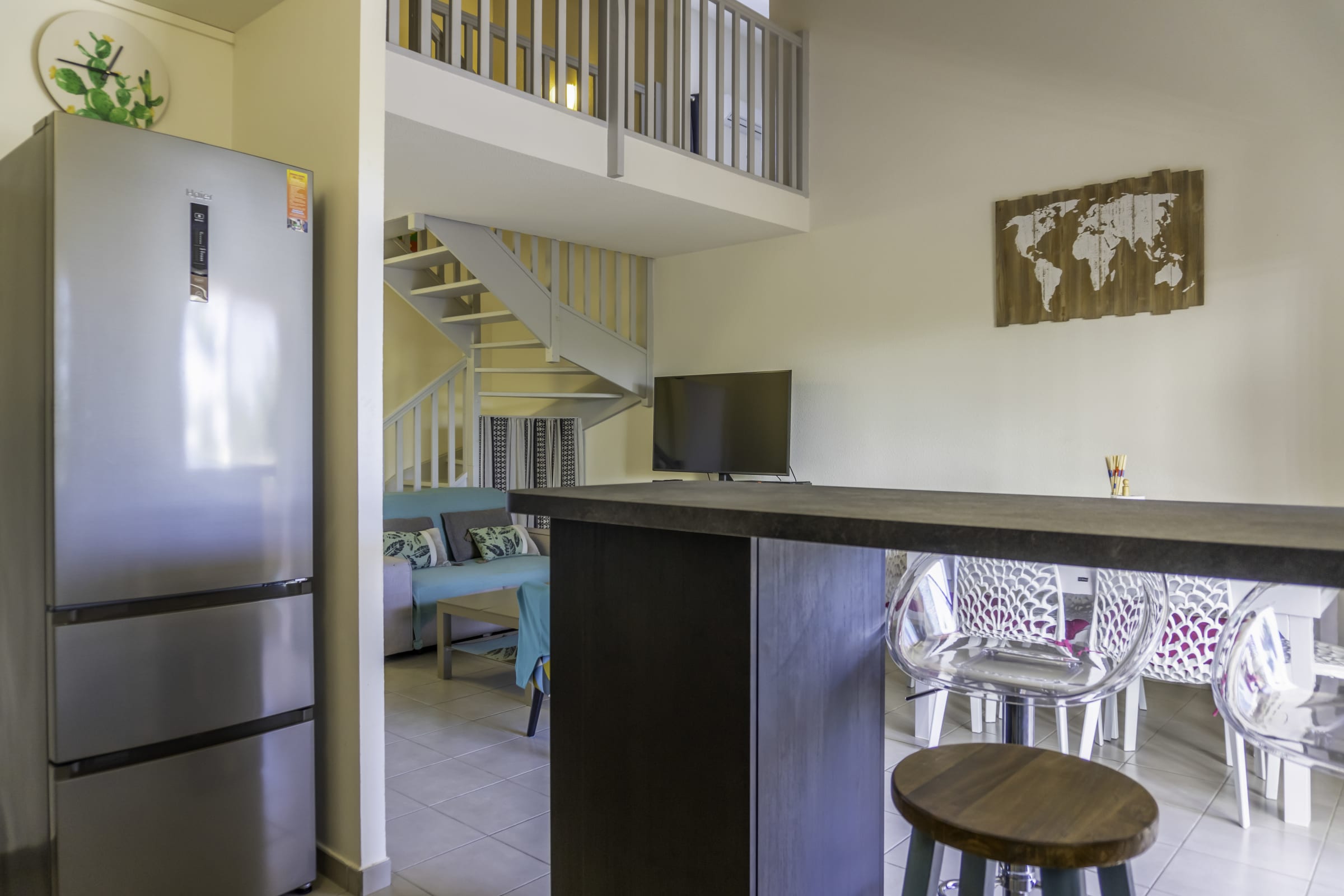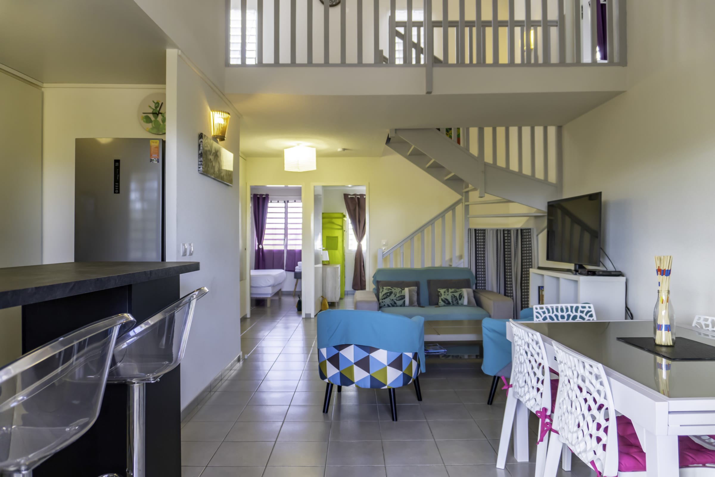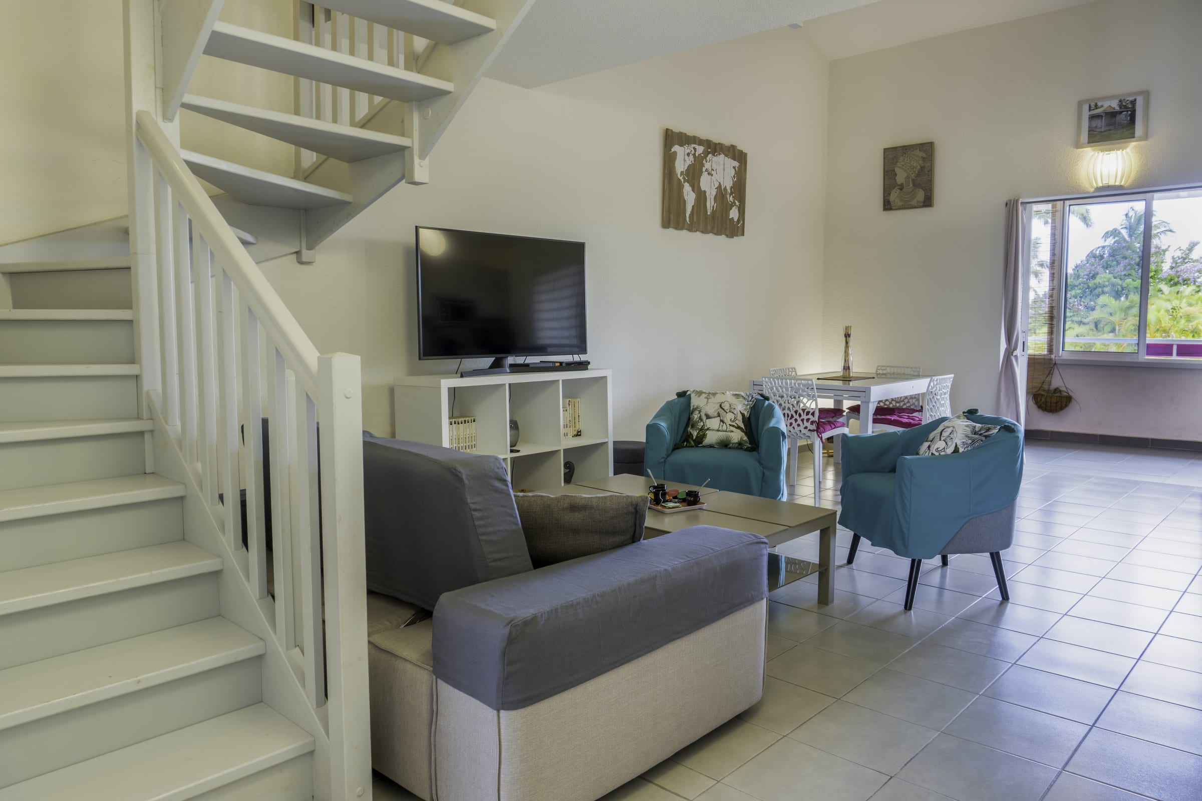 Welcome to the Orchid Dan apartment, your warm and welcoming duplex in the heart of Guadeloupe. Spread over 86m2 on two levels, discover a welcoming living space that can accommodate up to 6 people in the utmost comfort. Equipped with a modern, fully-equipped kitchen, you can prepare tasty dishes using local produce from the surrounding area.