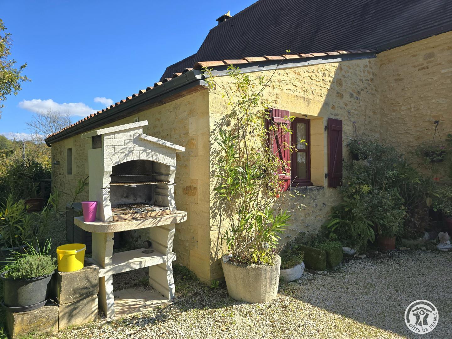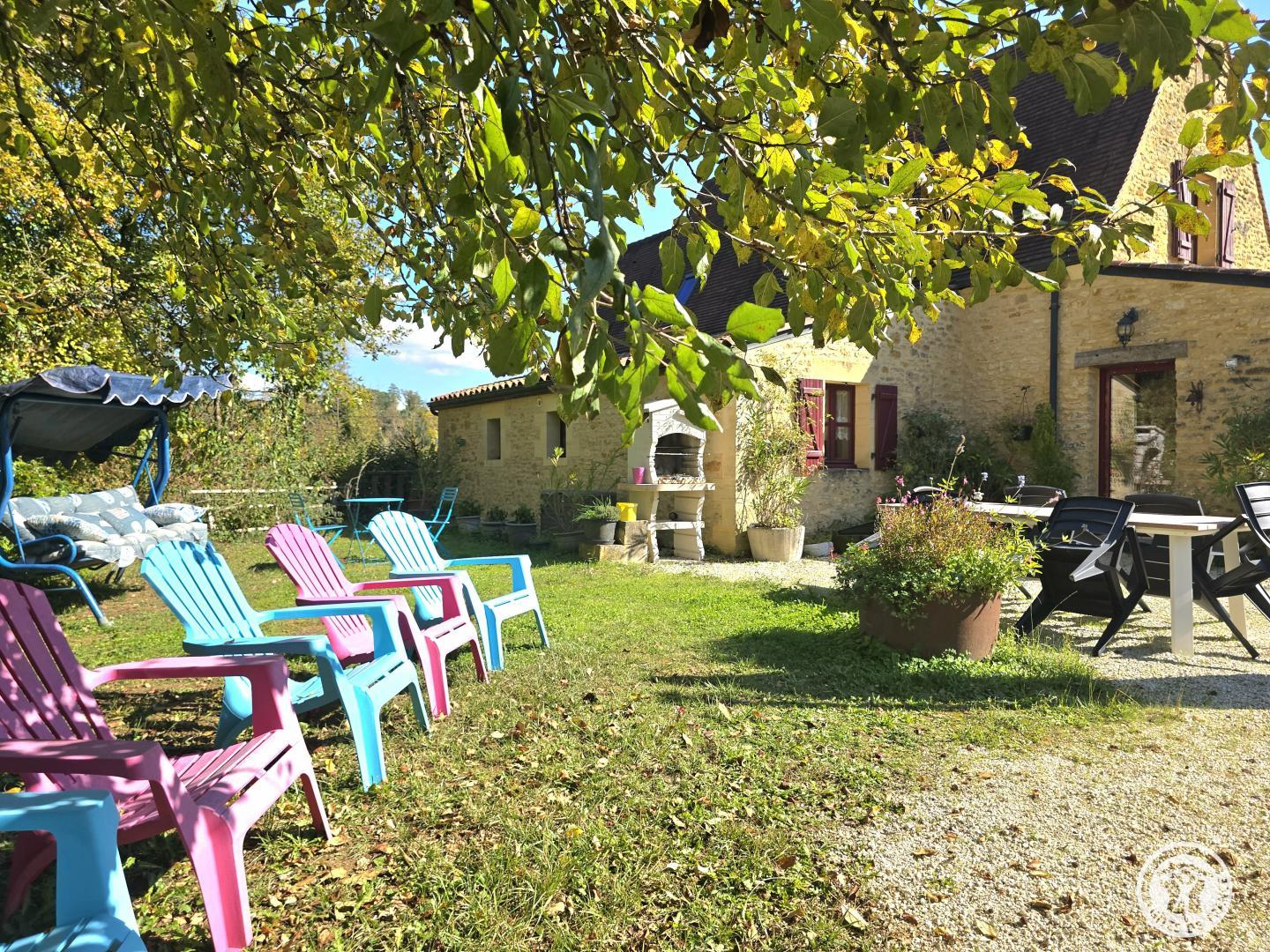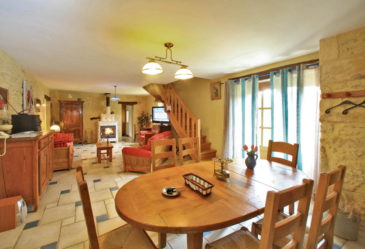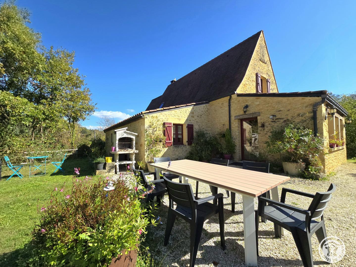 1 km from Proissans (Bakery-Pastry/Butcher-Caterer/Restaurant) and 5 km from Sarlat (All shops), independent house of 132 m2 separated from the owner's house by a terrace. Ground floor: Kitchen. Living room with lounge area and Wi-Fi internet connection. 1 bedroom: 1 bed 140. Bathroom, shower. Separate toilet. Laundry room. Veranda. Upstairs: Lounge area. 2 bedrooms: 2 beds 90 and 1 bed 160. Shower room. Separate toilet. Gas central heating and heating by ceramic wood-burning stove (wood provided). Private unfenced land of 2000 m2 with terrace, garden furniture, sun loungers, barbecue and plancha and shared unfenced land of 2500 m2. Household linen (tablecloth and tea towel), wood and electricity included. Bathroom linen €5/person/change. Sheets €10/bed/change. End of stay cleaning €50. Heating €10/day. Baby equipment: 1 cot with bars, 1 high chair, 1 baby bath, 1 changing table. Old restored barn on a property offering a beautiful ensemble of stones and typical Périgord flagstones in a calm, green and wooded environment (oaks) surrounded by meadows and cultivated fields. near a small stream (Enéa) and 200 m from a fishing pond. You will enjoy visiting Sarlat, classified as a 'Town of Art and History', a medieval town with an exceptional architectural heritage (medieval residences and Renaissance hotels). 10 km from the Dordogne Valley and its castles. villages. bastides... 20 km from the International Center for Parietal Art Lascaux 4 in Montignac.