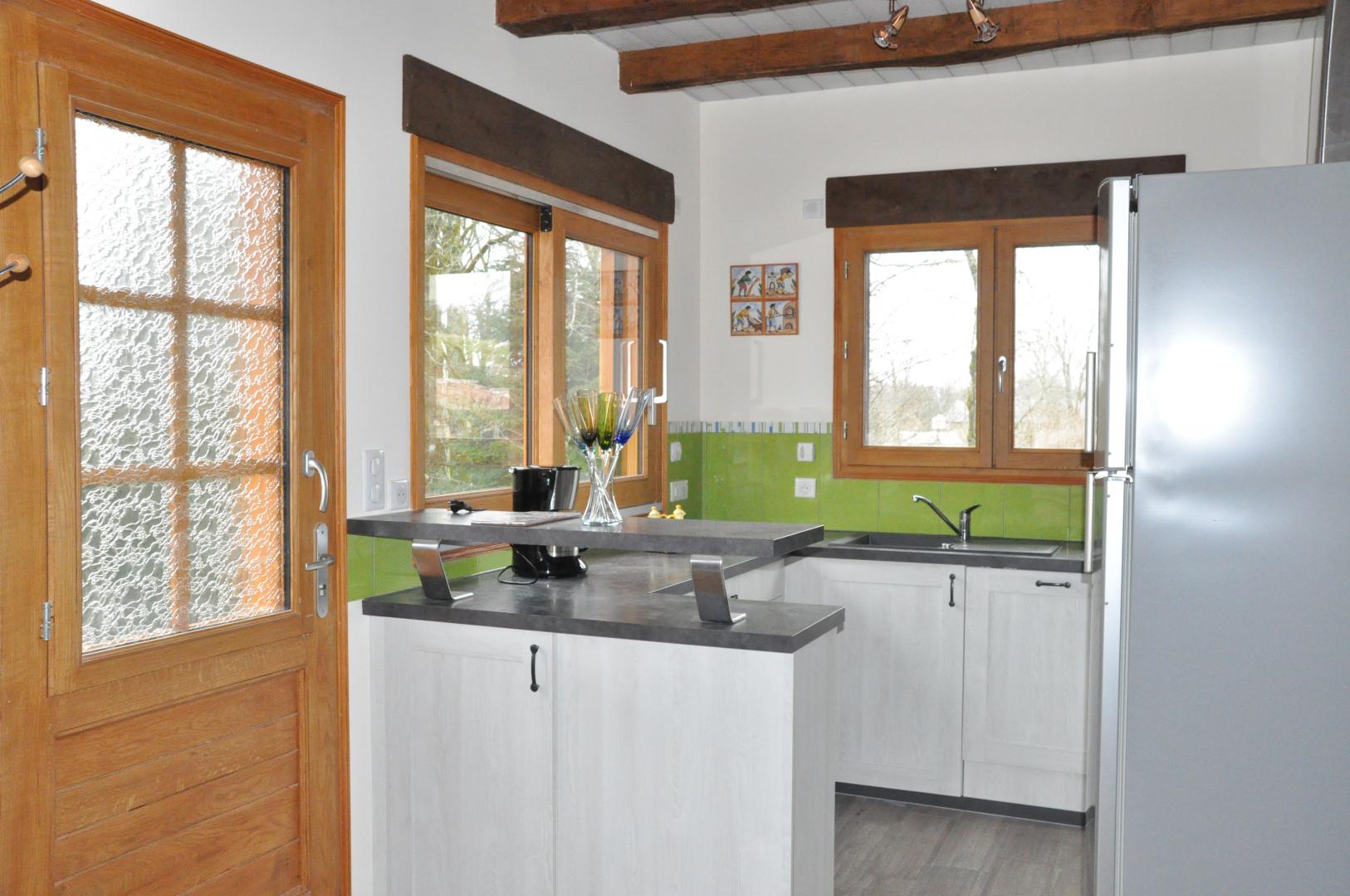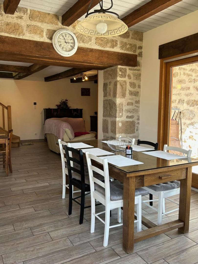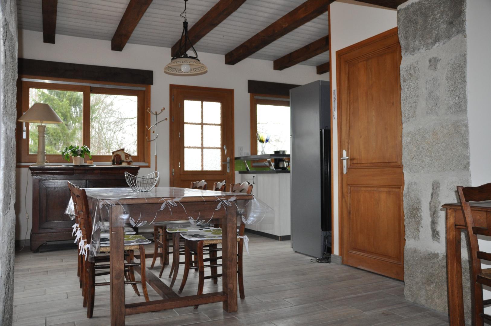 Large living room with dining area and living room, old fireplace (cantou) with electric fireplace, integrated kitchen area. A bedroom on the ground floor (1 double bed), A shower room and 1 toilet also on the ground floor. A bedroom upstairs (1 double bed), a mezzanine (2 single beds). . Beautiful semi-covered terrace, with beautiful wooden table and barbecue. This cottage entirely created by the owners, from the walls to the frame, required 3 years of work. From felling to sawing and drying the wood for the joinery and the frame. Everything was produced locally. The owners will be very happy to welcome you to our quiet and pleasant cottage! This cottage in the heart of the Plateau de Millevaches is ideally located for magnificent hikes. Walk around the cottage in the heart of nature, cross-country ski trail 2km away, fishing, walking, mountain biking, mushroom picking, come and discover various activities! Every summer you can discover the festive markets of local producers!
