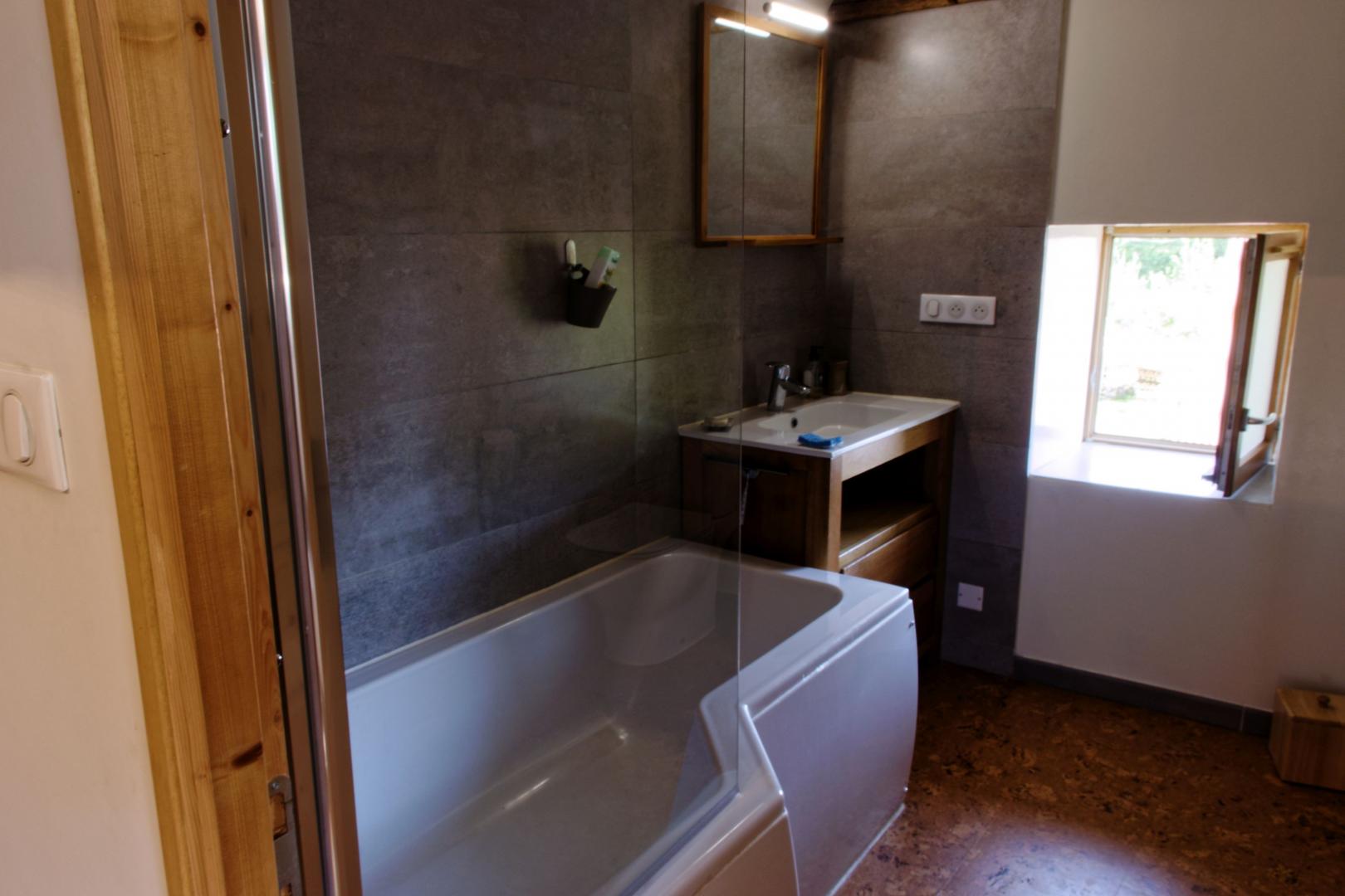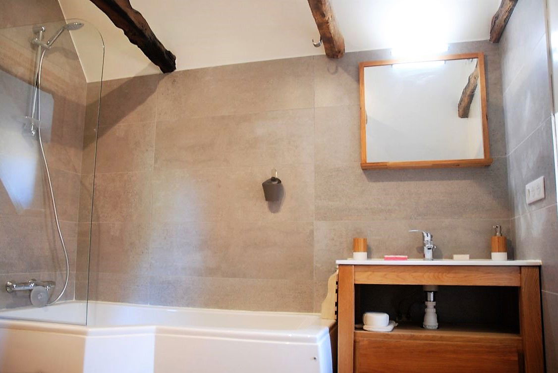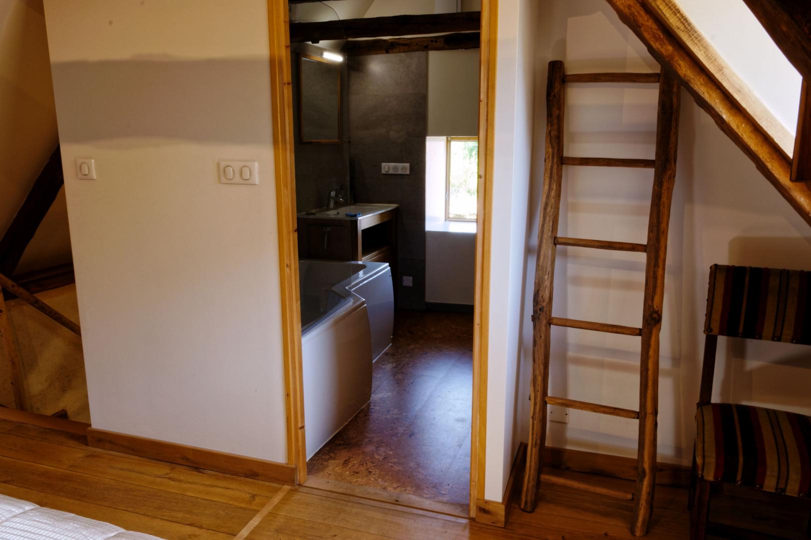 A bedroom with a large 160 cm double bed with linen sheets provided and a separate bathroom with bathtub and shower upstairs with bathtub and cork floor, fitted walnut kitchen, fully equipped with quality equipment. Living room with comfortable armchair near the stove, office area, TV. Possibility of accommodating 2 additional beds. A very beautiful terrace of +20m² raised in wood.