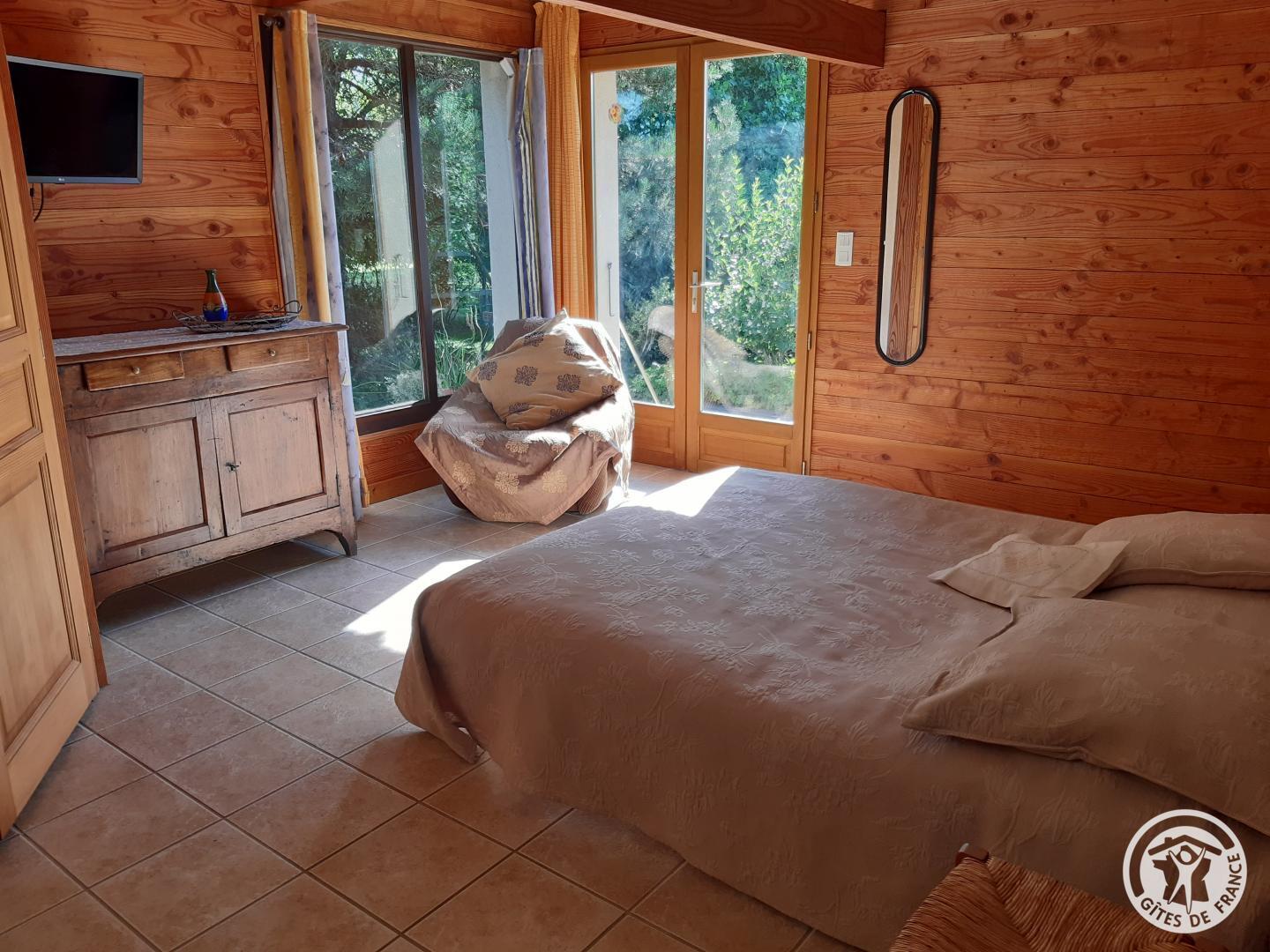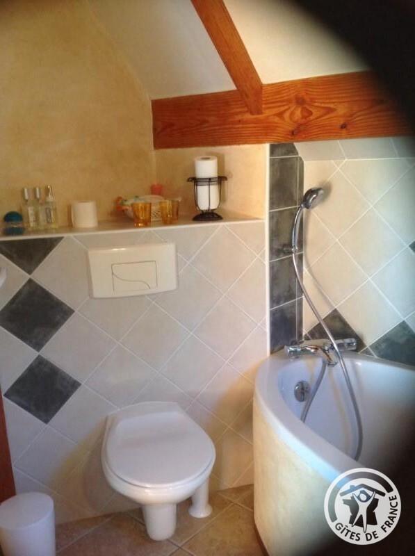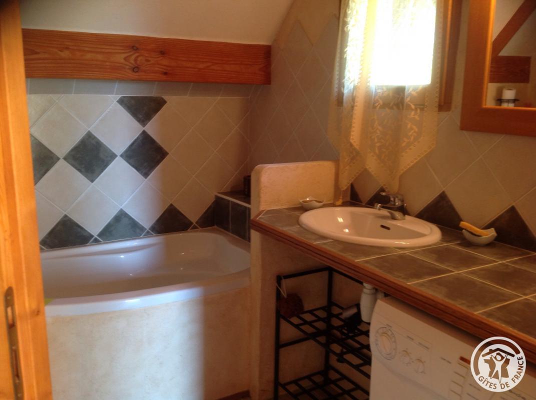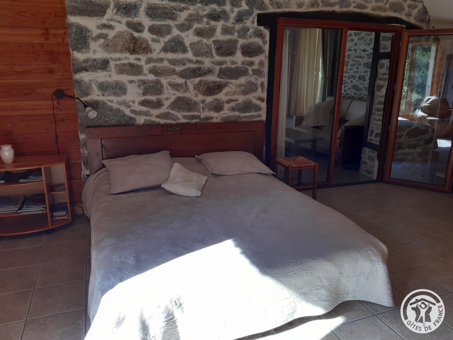 2 km from the village, altitude 730 m. In a hamlet (3 houses) in a quiet area, independent thatched cottage. 1 attic bedroom (3 single beds) 1 ground floor bedroom with 1 double bed and bathroom with bathtub and toilet,