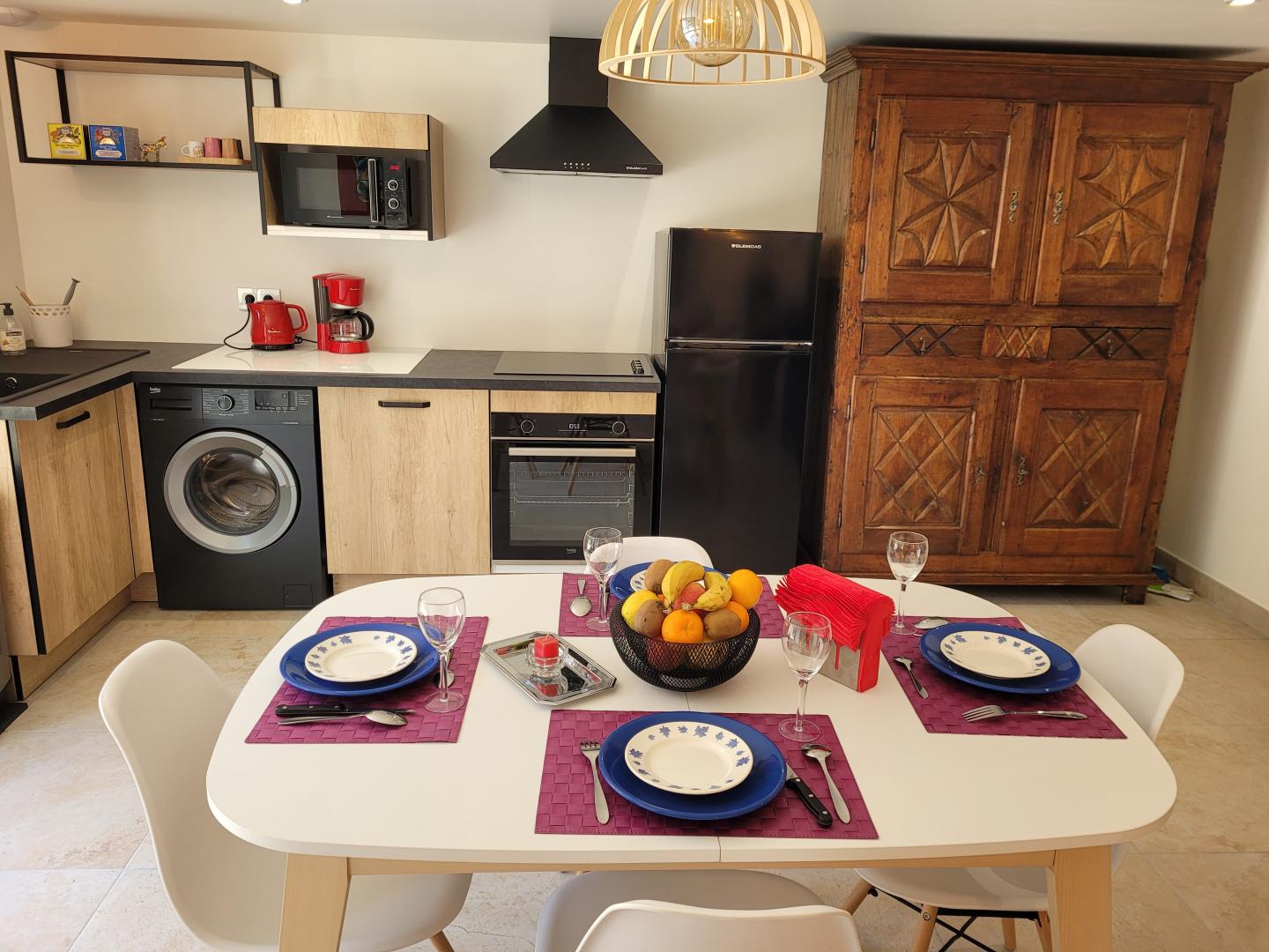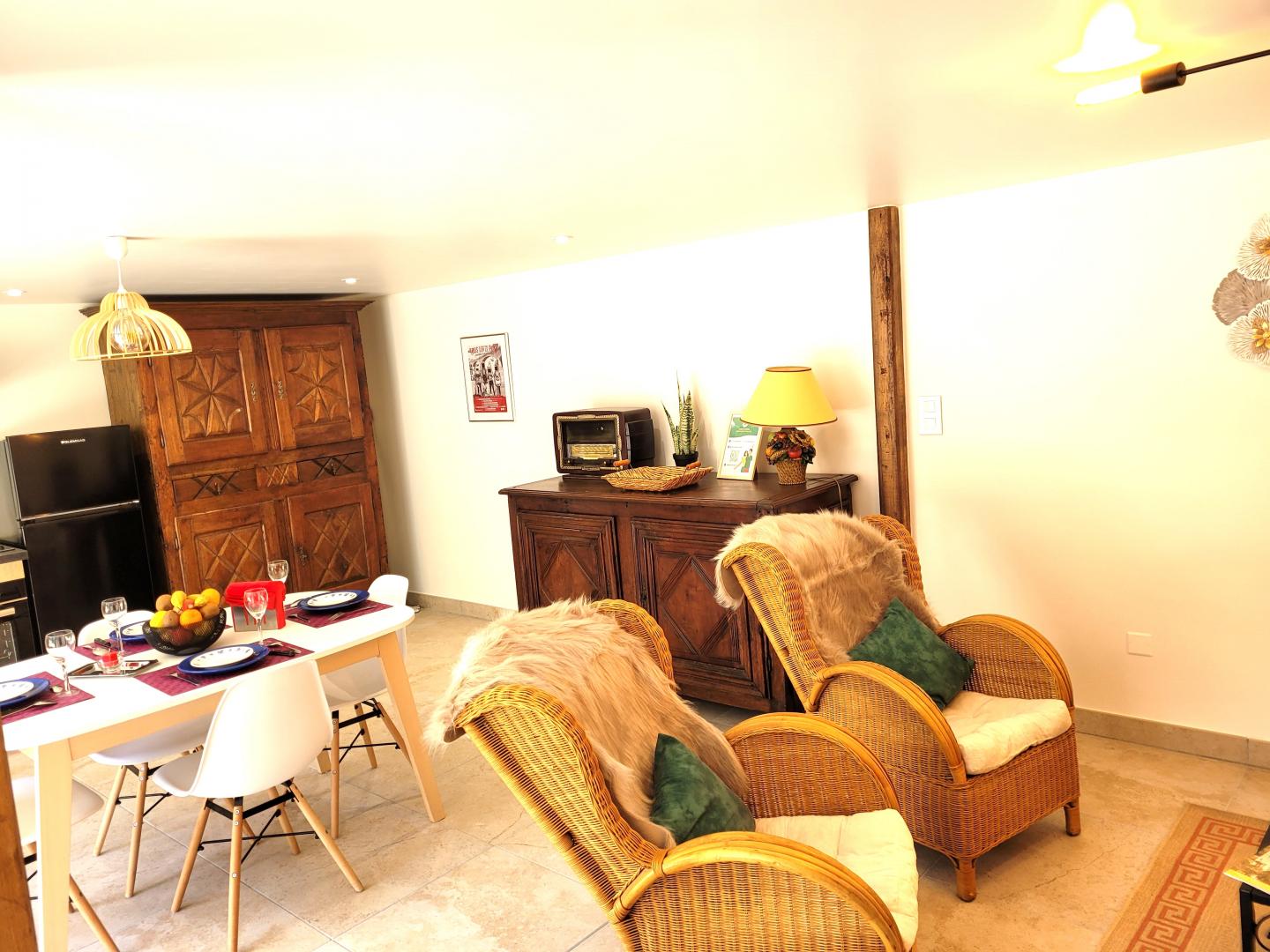 On the ground floor: A beautiful living room with fitted and equipped kitchen, a dining area and a lounge area.