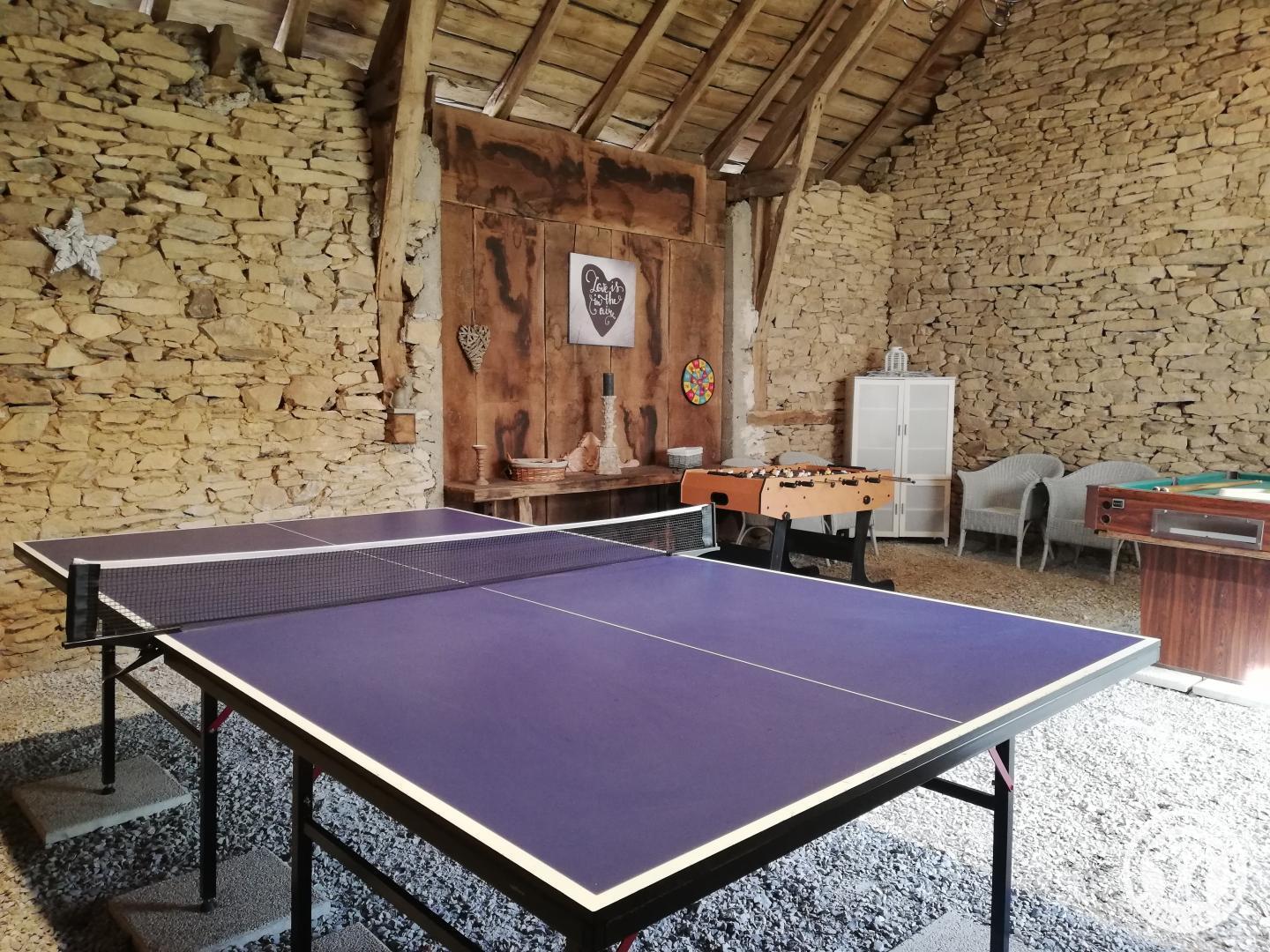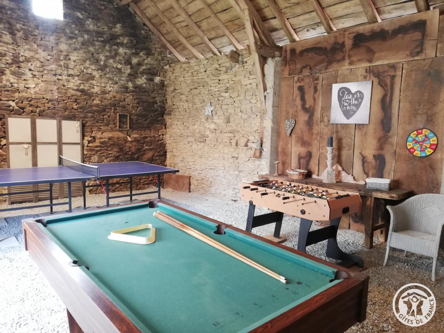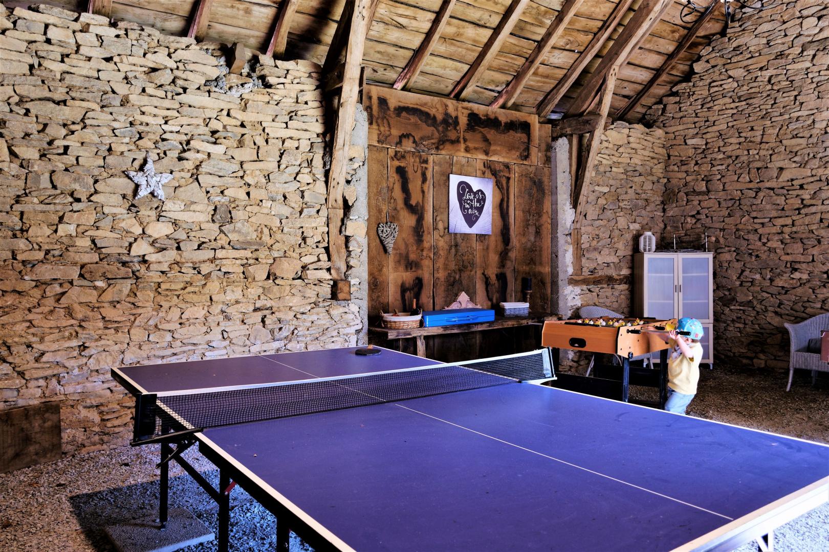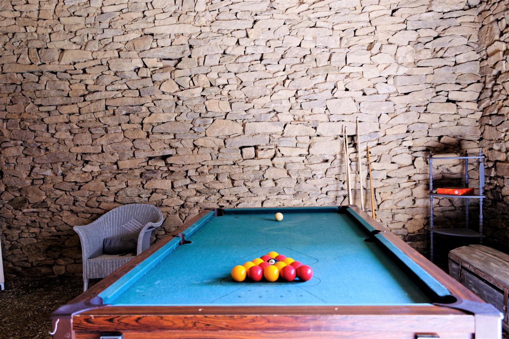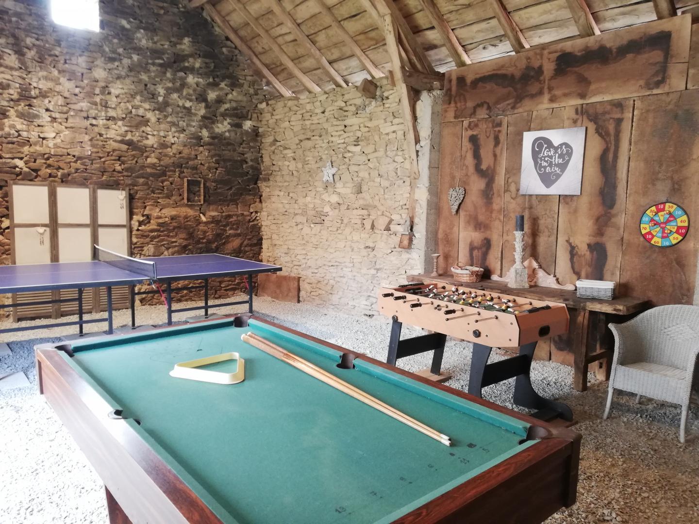 Living room with lounge area (sofa bed for 2 people) and kitchen area, 2 bedrooms upstairs (2 beds 140 X 190) with air conditioning, shower room. Come and relax in a charming house typical of Corrèze at Hameau des Noyers in Sainte Fortunade. This old restored farmhouse, combining old and contemporary, is located in the heart of the Corrèze countryside, a stone's throw from tourist sites. Able to accommodate 4 to 6 people, the cottage has private wooded grounds with an ornamental pond and a secure swimming pool (open from May to the end of September depending on the weather) with a wooden terrace. In the shade of the Walnut trees, let yourself be tempted by a game of pétanque with our bowling alley and a swing. In a dry stone barn, discover a 45 m² recreation room which offers a relaxation area with reading space, coloring for children, board games, music, various documentation on Corrèze, table football and ping-pong table and a pool table.