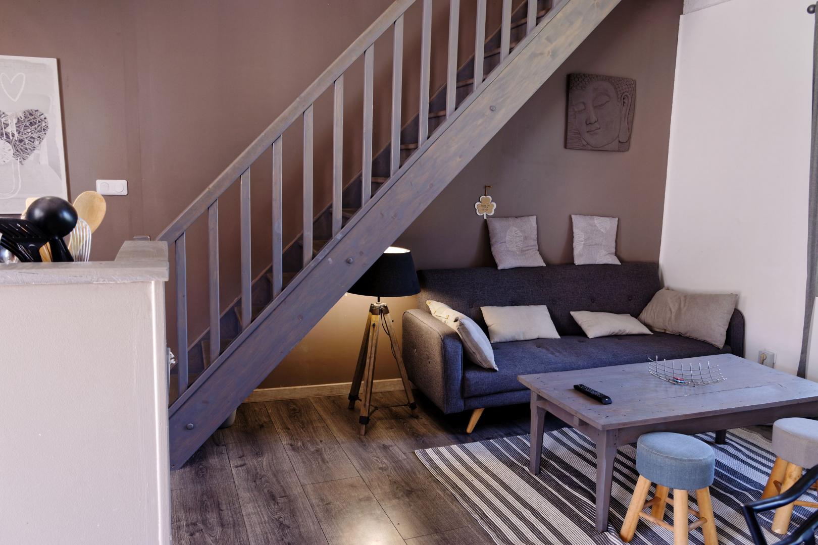 Living room with lounge area (2-person sofa bed) and kitchen area, 2...