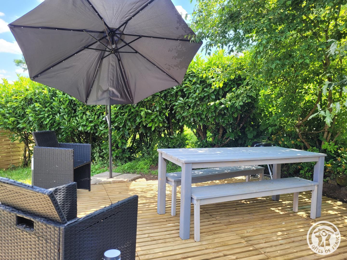 Baby equipment Old stone barn completely restored and typically Corrèze covered in slate. - Red shutters framing a French window, opening onto a small stone staircase. - Terrace equipped with garden furniture and barbecue, ideal for outdoor meals. - Quiet and green environment with plants and shrubs. Inside a large living space under the eaves with exposed wooden beams, comfortable lounge area with sofa, coffee table and television. - Dining area with large table and chairs, fully equipped kitchen, open to the living room. - The rustic and warm decoration, combining modernity and elements of yesteryear.
