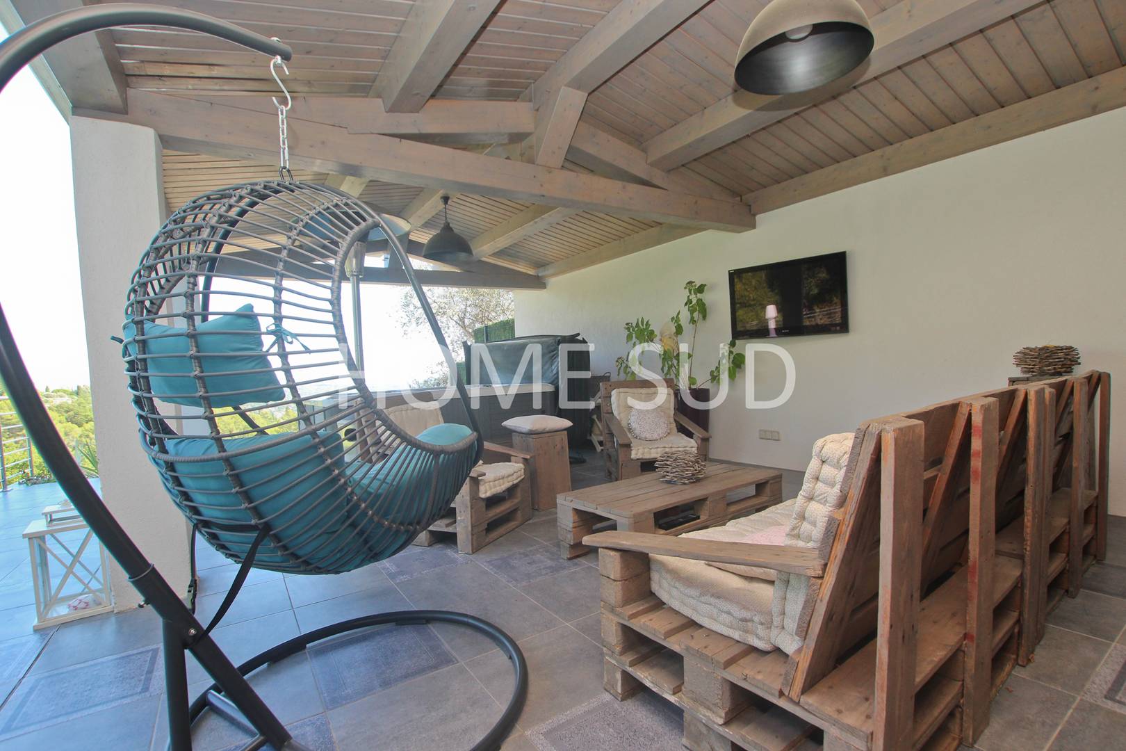 Set on a 2,400 sqm landscaped plot, the outdoor spaces are designed for relaxation and open-air leisure. The private swimming pool (10 x 4 m) with a flat bottom is secured by a safety barrier. The pool house features a large 6-seater jacuzzi (50 jets), outdoor lounge furniture, and an outdoor television.