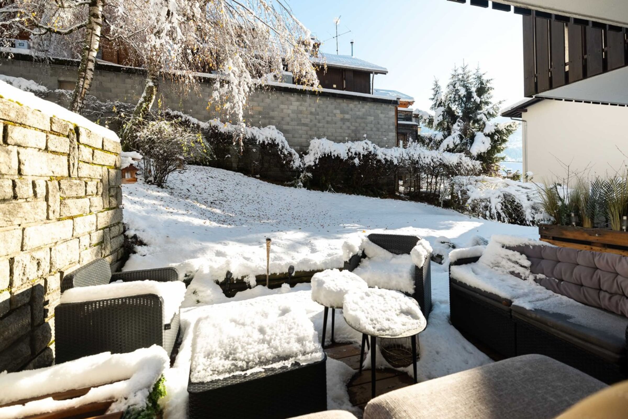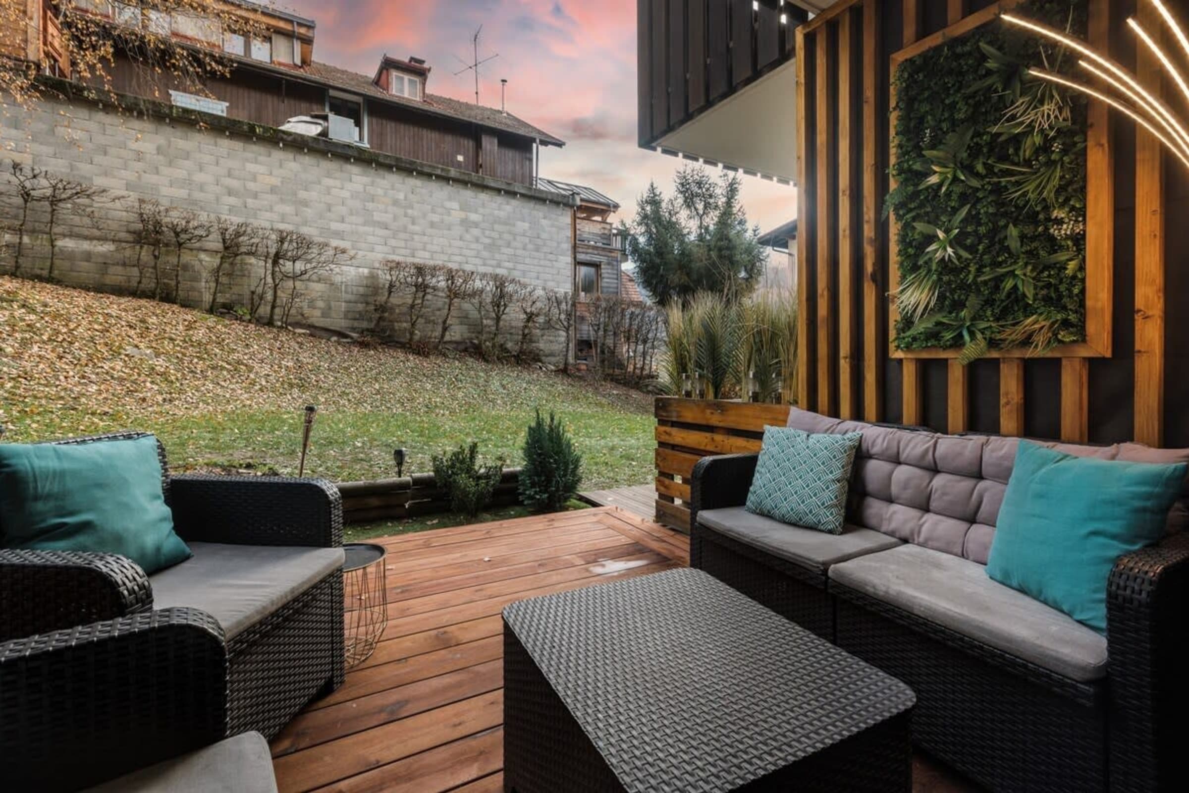 - A terrace opening onto a small private garden in the building, with an outdoor sofa.