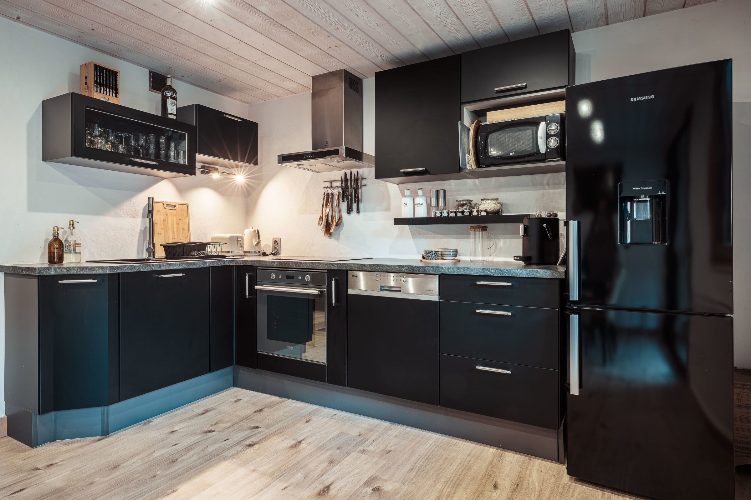 - A living room with a fully equipped kitchen with dishwasher, oven, fridge and freezer, microwave. A comfortable sofa with a large TV and WIFI access.