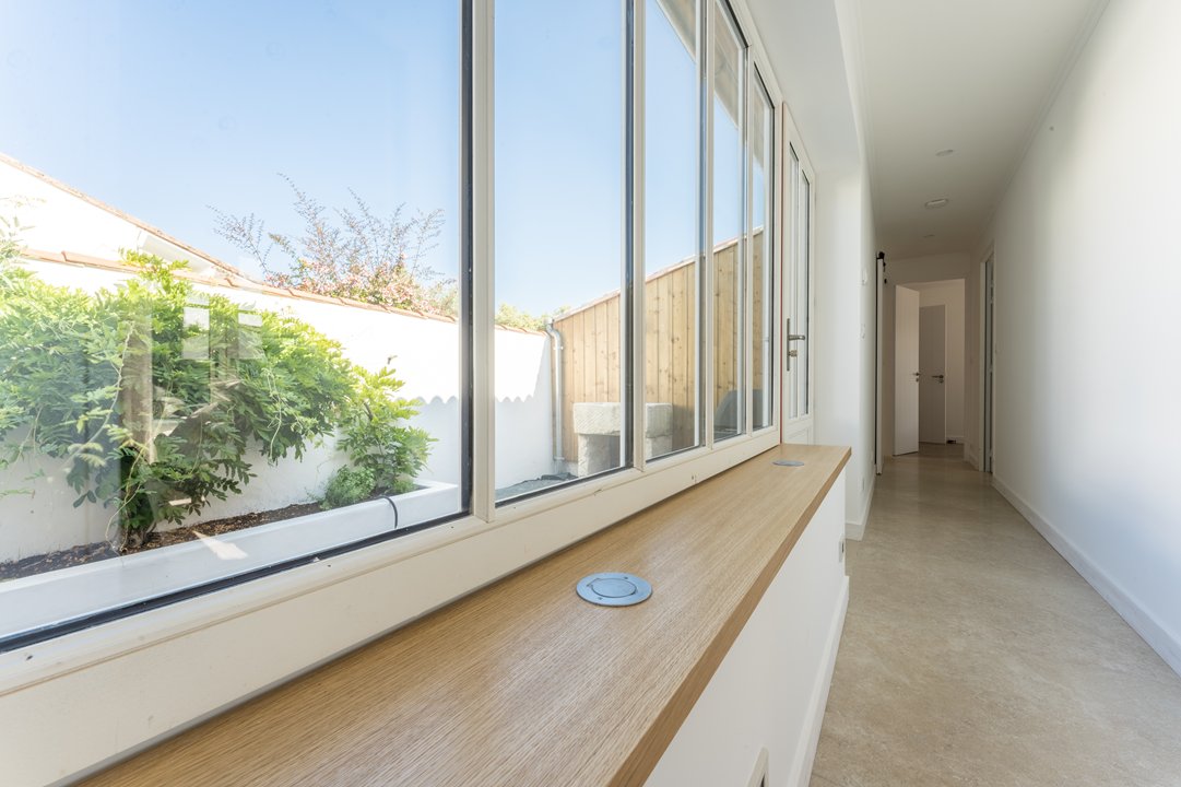 This great 58m² living room is opened onto the terrace, and this fitted kitchen, constitute with a long worktop, also giving onto the outside through a great bay window.