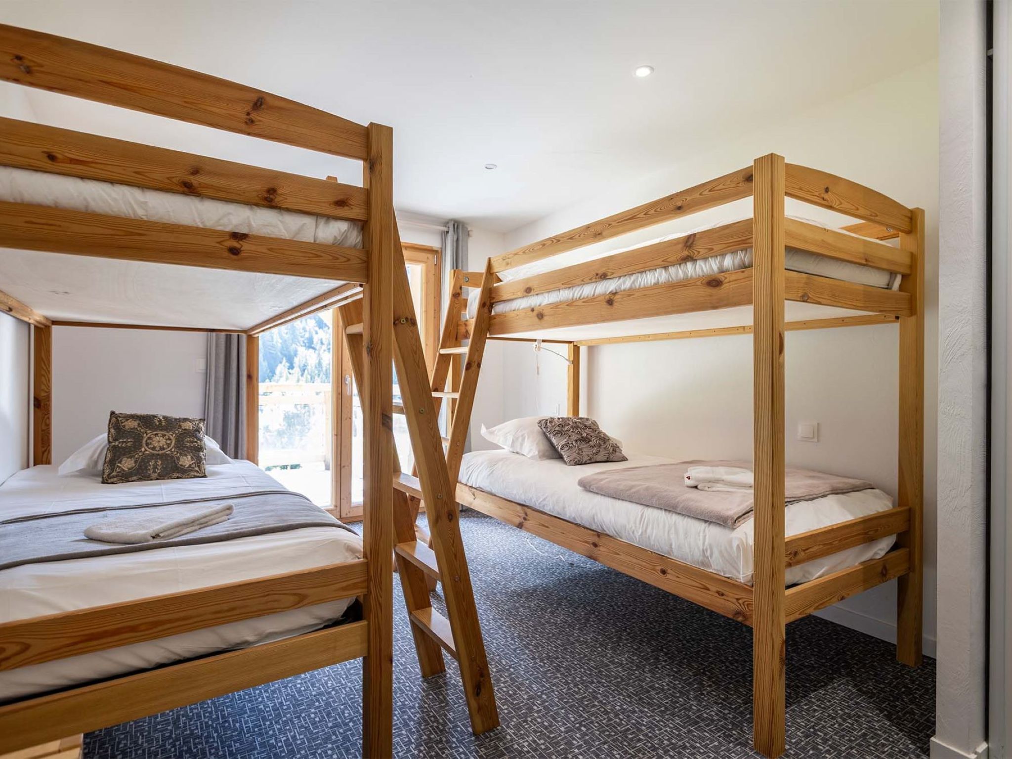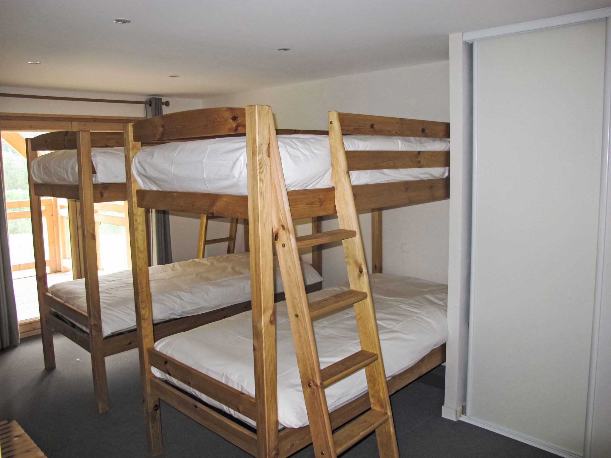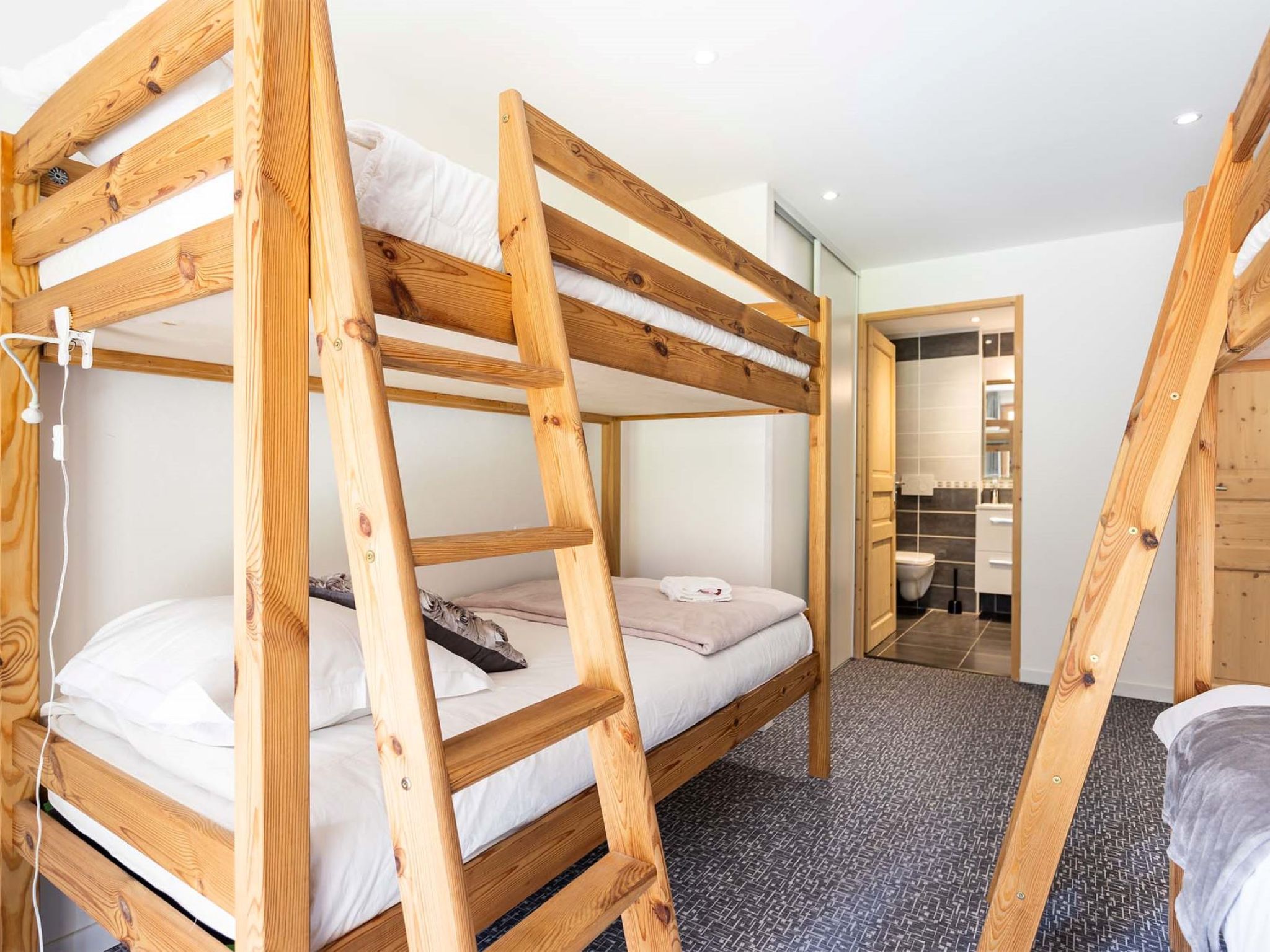"Vanoise", 4-room apartment 115 m2 on 2 levels. Spacious, comfortable furnishings: large living/dining room 51 m2 with 1 double sofabed and TV (flat screen). Exit to the terrace. Kitchen (oven, dishwasher, toaster, microwave, freezer, electric coffee machine, Capsules for coffee machine (Nespresso)). Upper floor: 2 rooms, each room with 1 french bed (1 x 160 cm, length 200 cm), shower/WC. 1 room with 2 x 2 bunk beds (4 x 90 cm, length 200 cm), shower/WC. Terrace. View of the mountains. Facilities: washing machine, dryer, iron, hair dryer. Internet (WiFi, free). Parking.