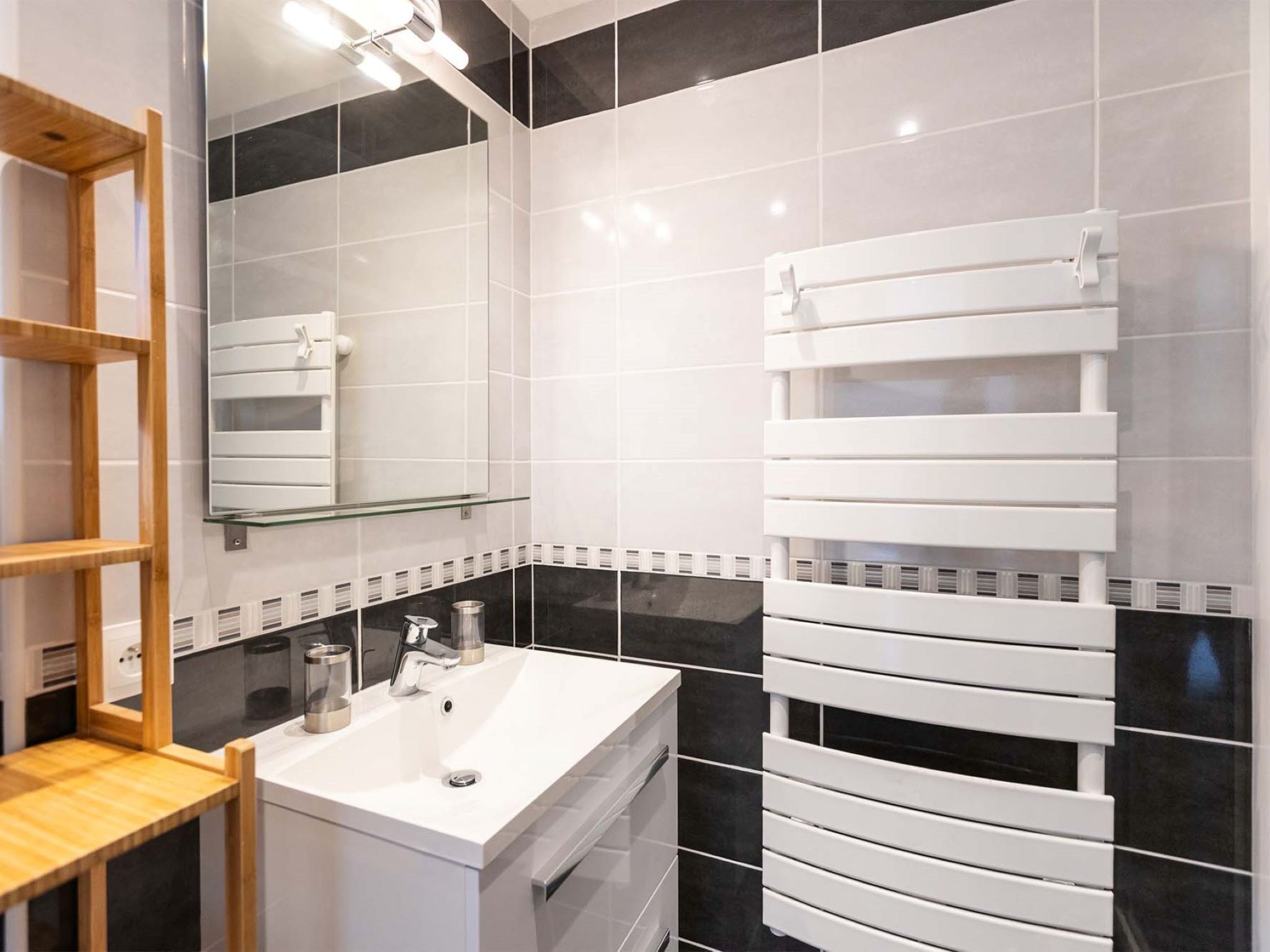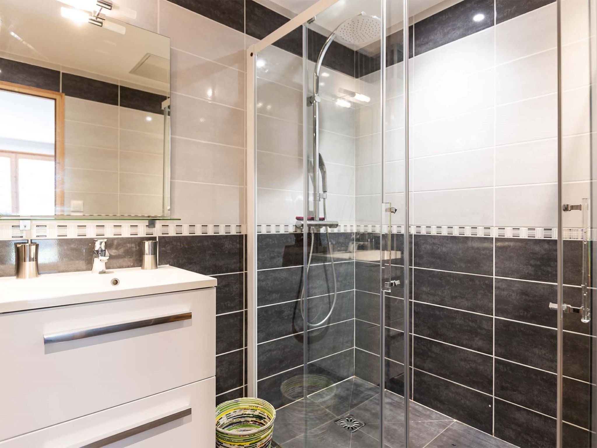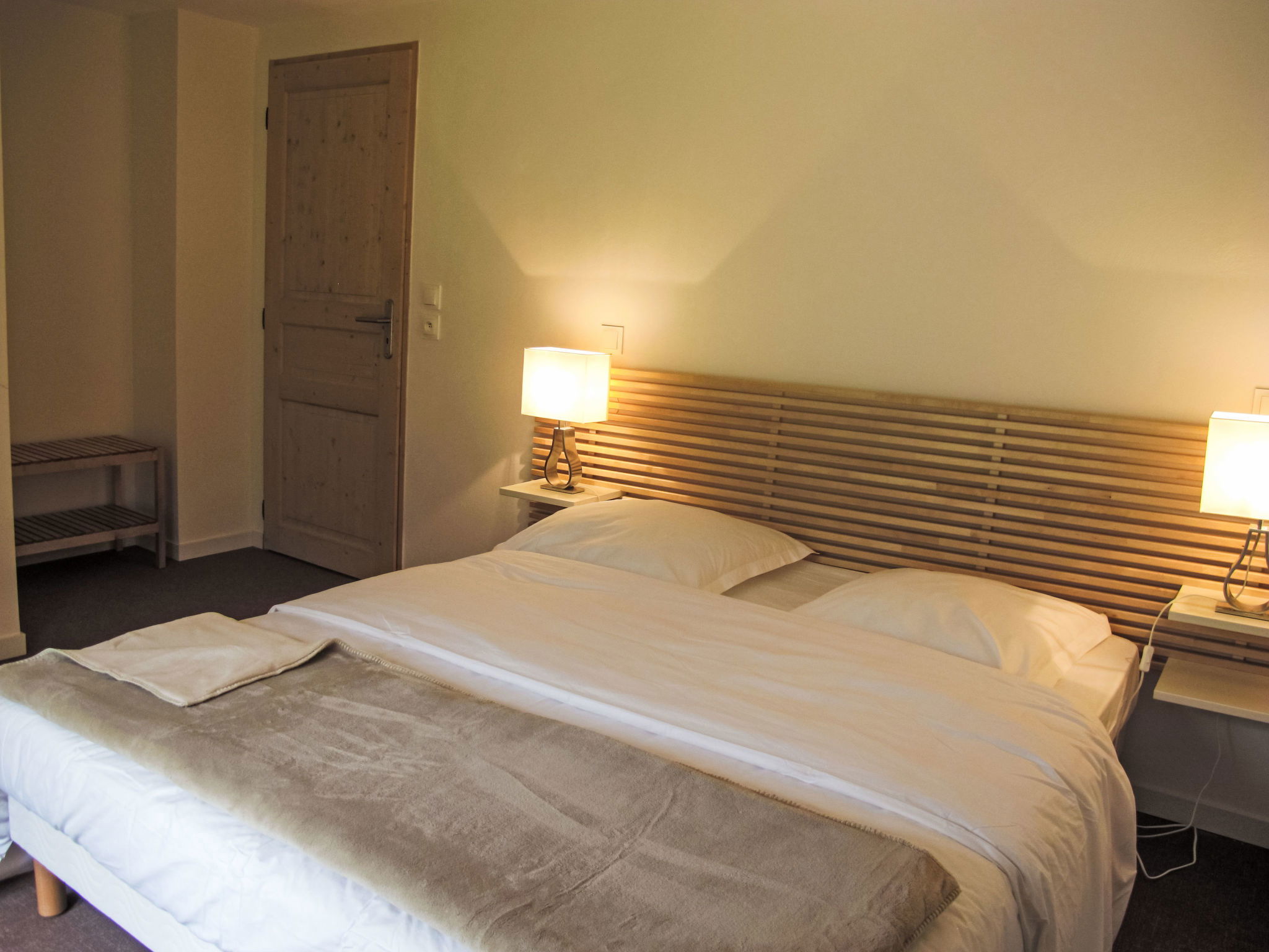 "Vanoise", 4-room apartment 115 m2 on 2 levels. Spacious, comfortable furnishings: large living/dining room 51 m2 with 1 double sofabed and TV (flat screen). Exit to the terrace. Kitchen (oven, dishwasher, toaster, microwave, freezer, electric coffee machine, Capsules for coffee machine (Nespresso)). Upper floor: 2 rooms, each room with 1 french bed (1 x 160 cm, length 200 cm), shower/WC. 1 room with 2 x 2 bunk beds (4 x 90 cm, length 200 cm), shower/WC. Terrace. View of the mountains. Facilities: washing machine, dryer, iron, hair dryer. Internet (WiFi, free). Parking.