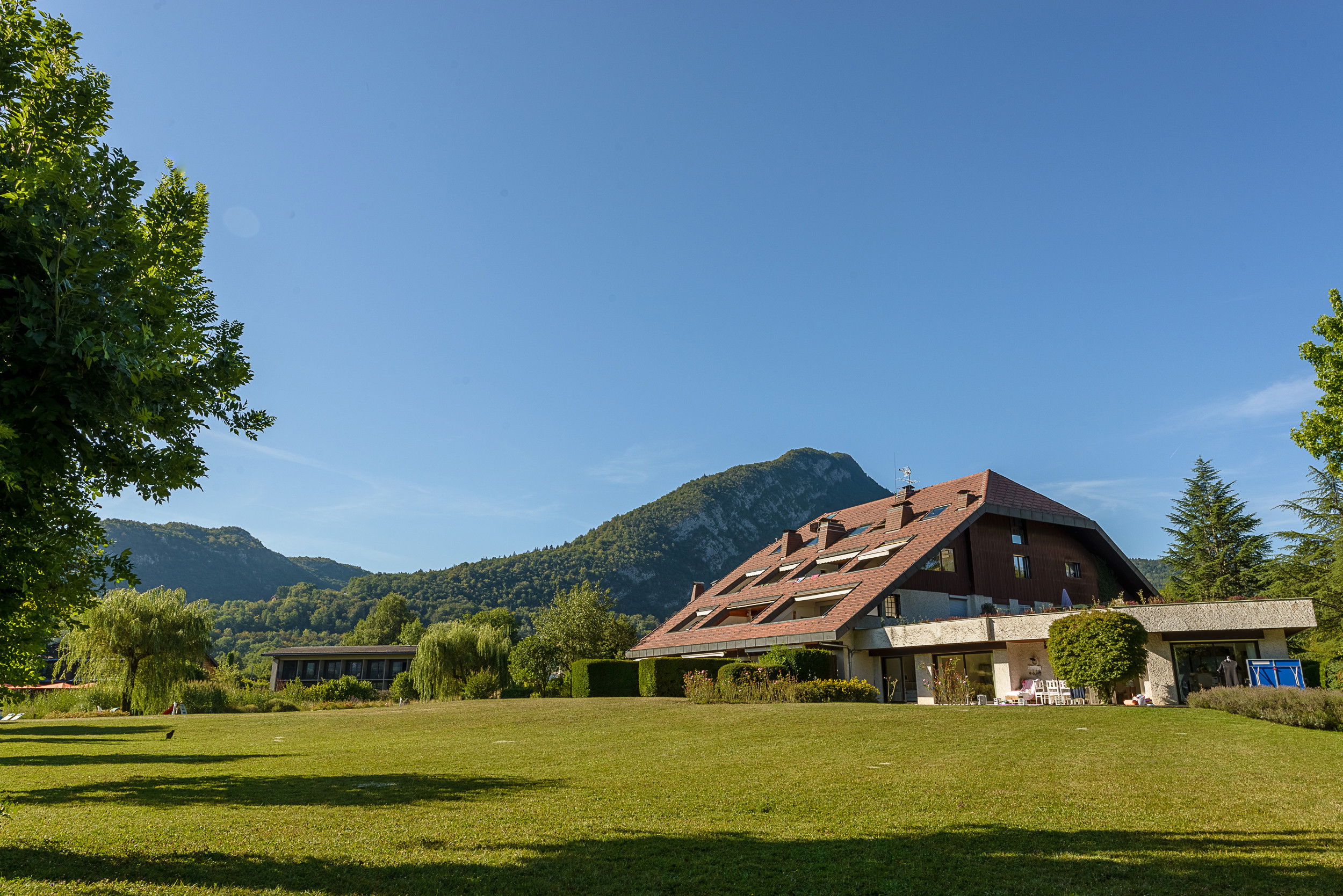 - Large 40m² terrace with views of the lake and mountains, dining table, and relaxation area with outdoor furniture provided