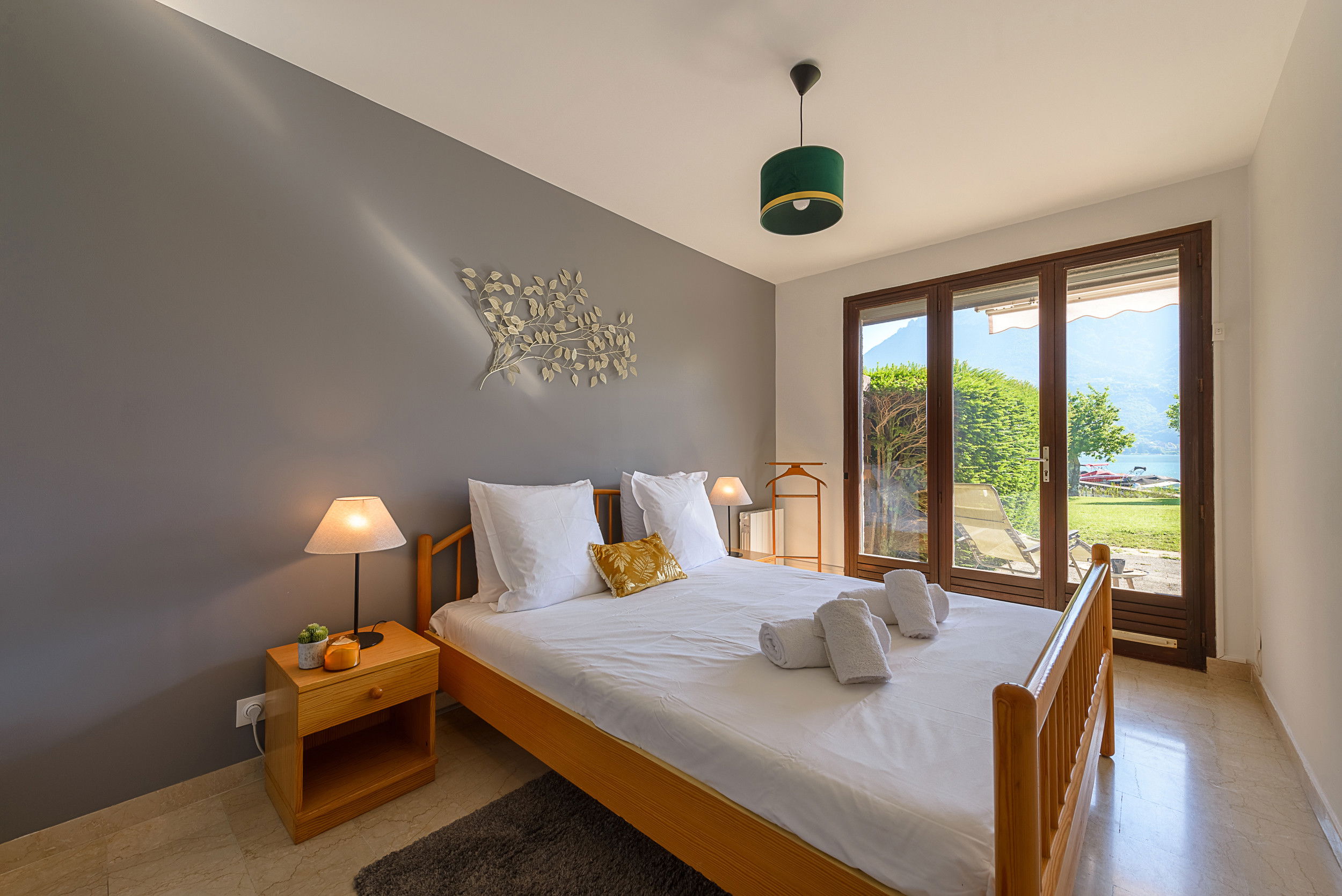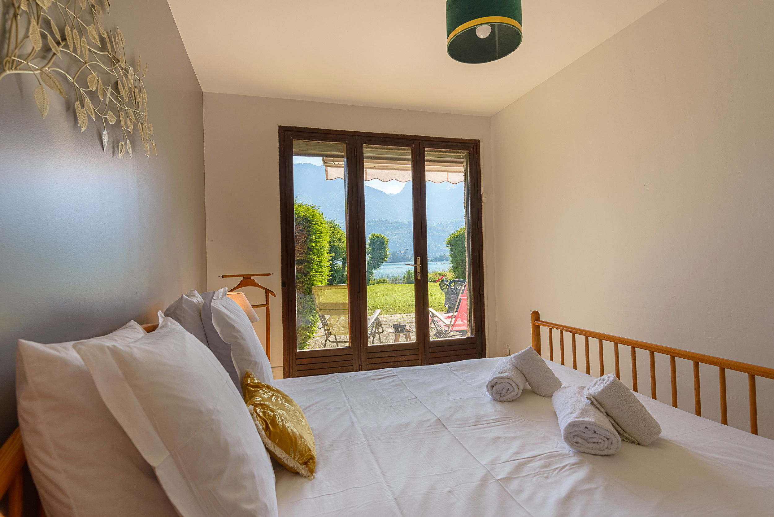 - Bedroom n°1: Double bed with 2 x 80x190cm mattresses (set as a double bed or 2 single next to eachother) ) with direct access to the terrace/garden and lake