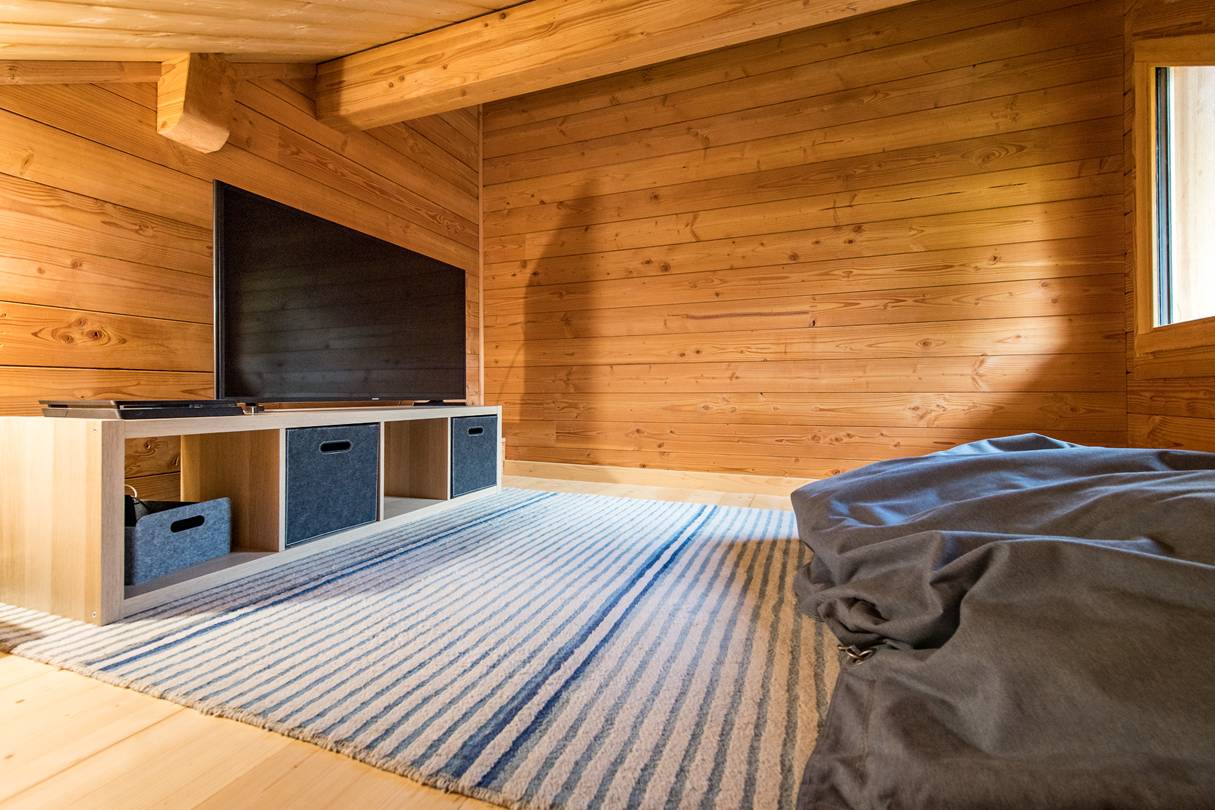 Upstairs, a master bedroom has its own bathroom and a south-facing balcony. This level also accommodates a double bedroom, a dormitory sleeping 4 with a TV area on a mezzanine, a bathroom and a separate toilet.