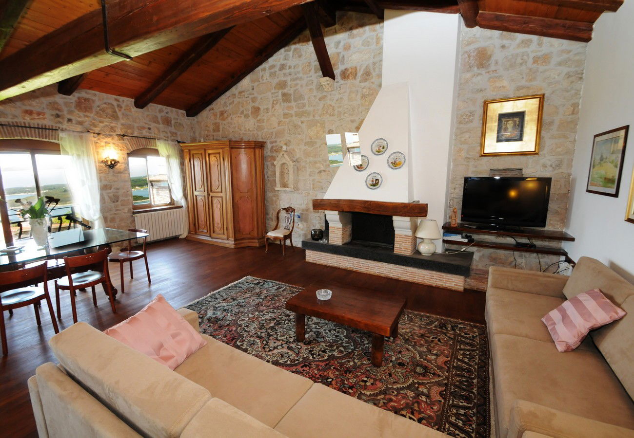 Upstairs, the floor features a spacious open-plan living area with another fireplace and a fully equipped kitchen. Large windows fill the space with natural light and open up to magnificent sea views across the Vrsar archipelago. The living room is air-conditioned and includes a pull-out sofa, providing additional sleeping space for two guests.