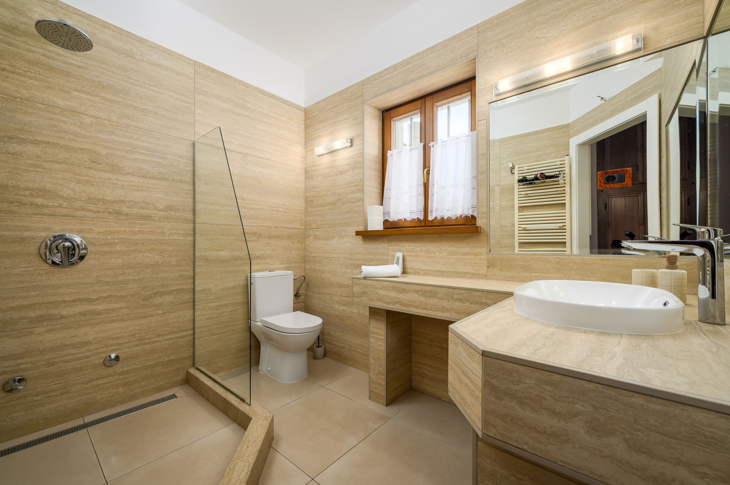 On the ground floor, you’ll find two comfortable bedrooms, each with a double bed and a private bathroom with shower. A cozy tavern-style dining room with a fireplace and a small kitchen invites you to enjoy intimate dinners together, while a separate guest toilet adds convenience.