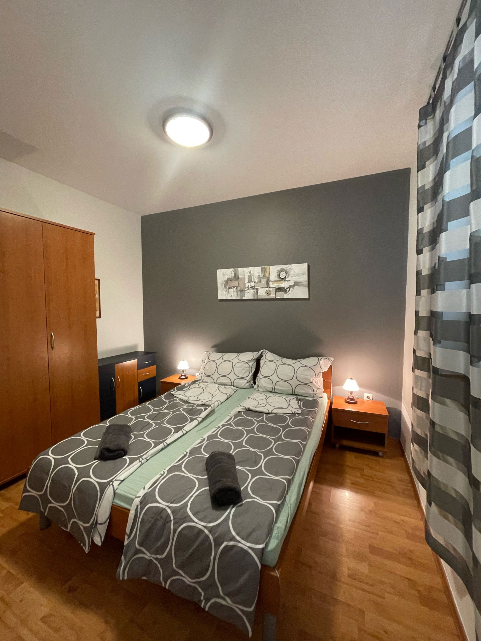 The apartment boasts a well-equipped kitchen, complete with a fridge, coffee machine, and all the necessary kitchenware, making it easy to prepare delicious meals and enjoy quality time together. The living area features a comfortable double sofa bed, providing additional sleeping space for your party. The bedroom is furnished with a comfortable king-size bed, ensuring a restful night's sleep.
