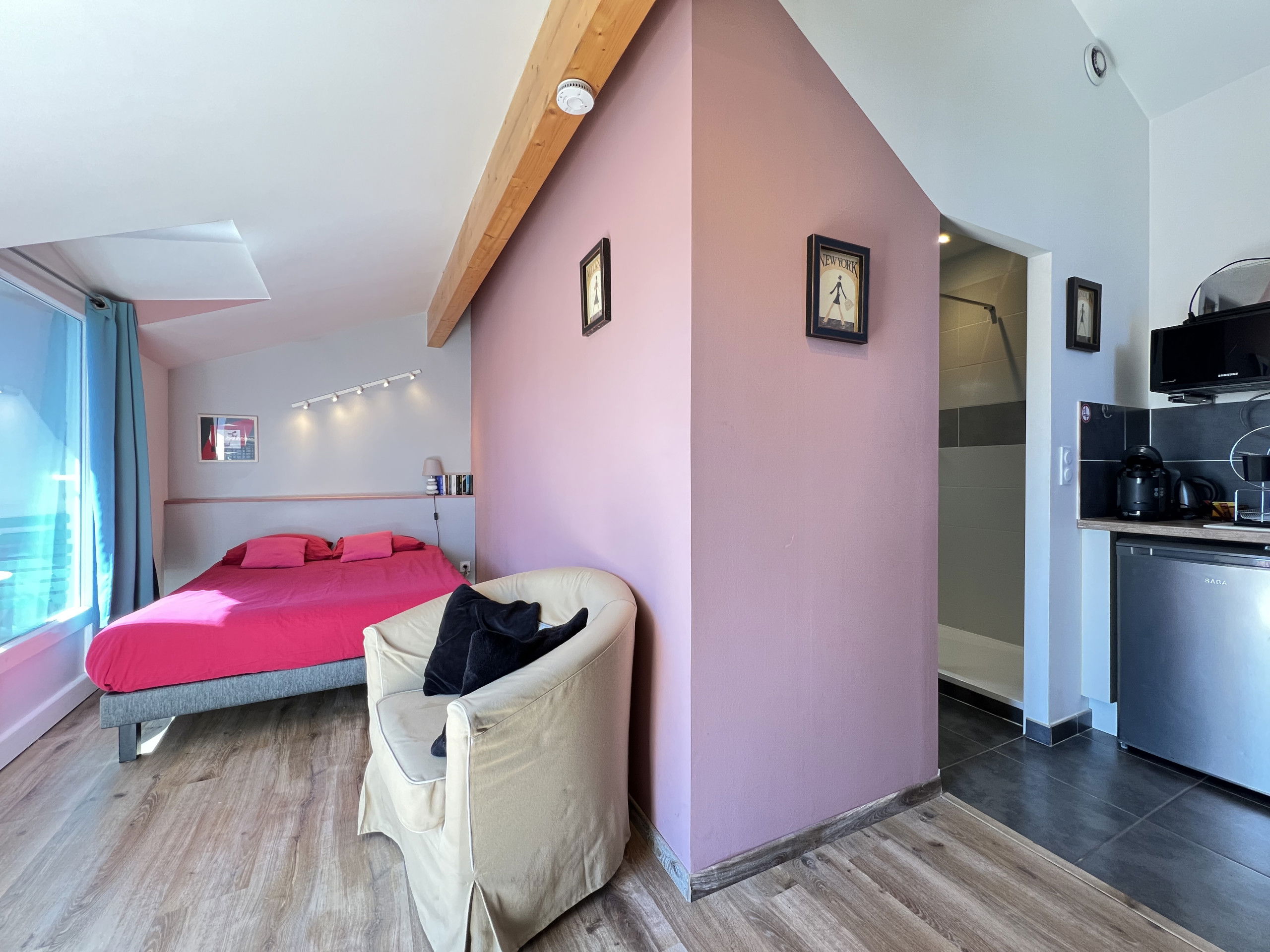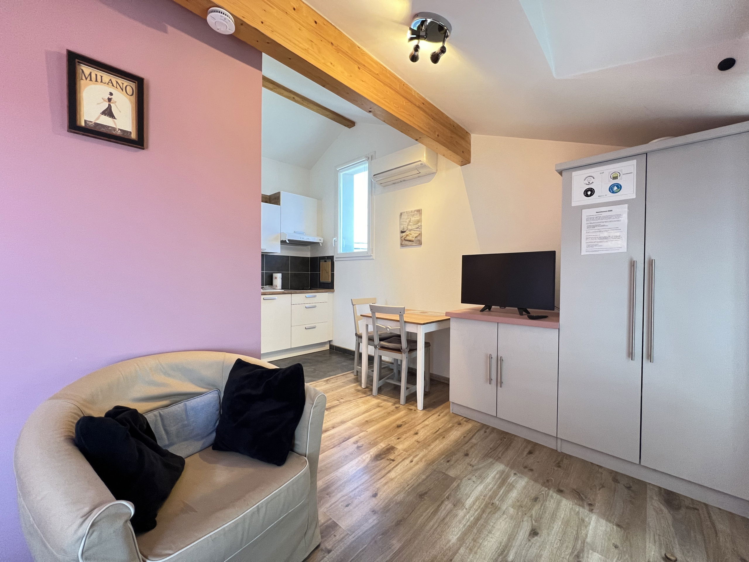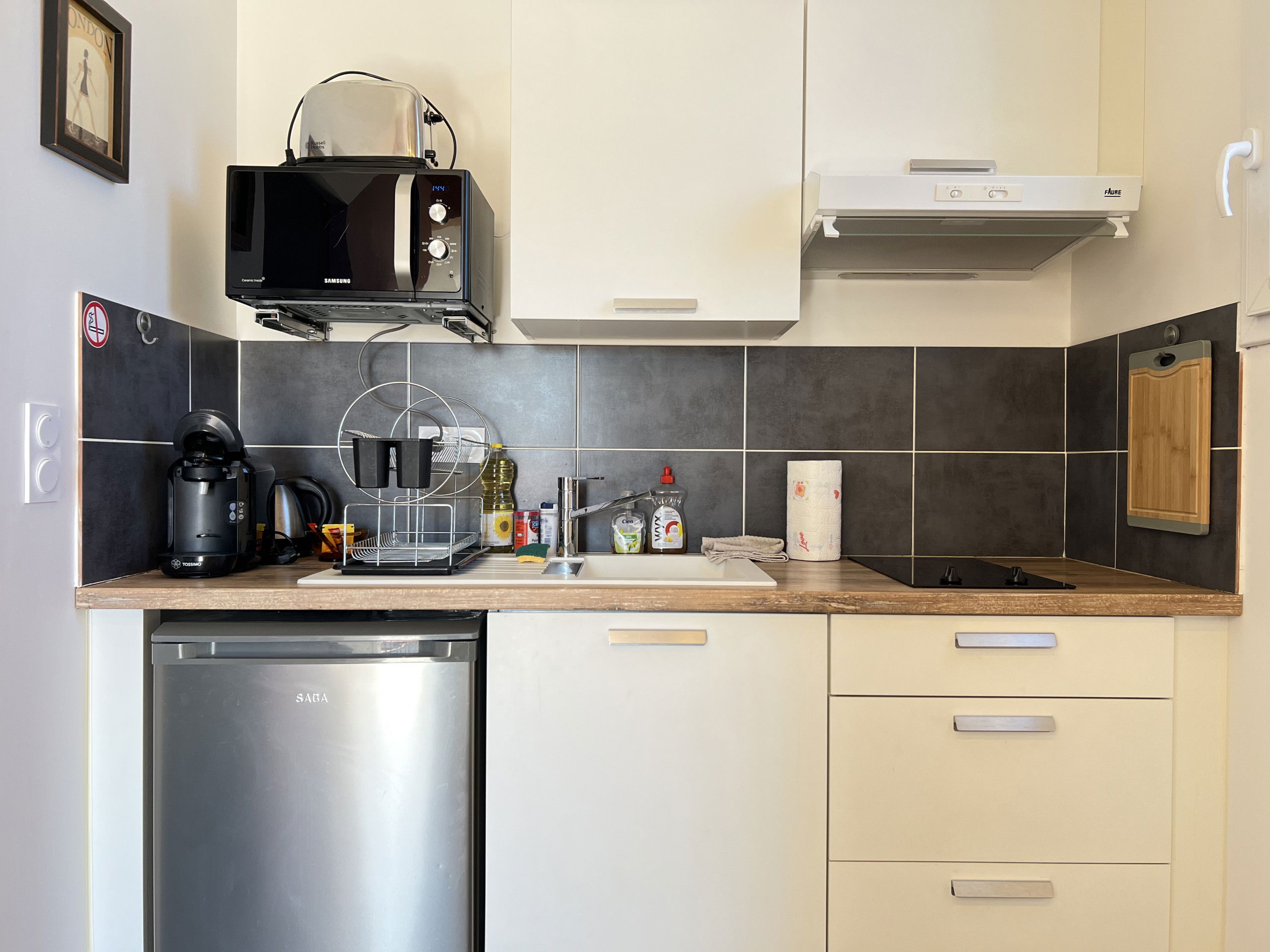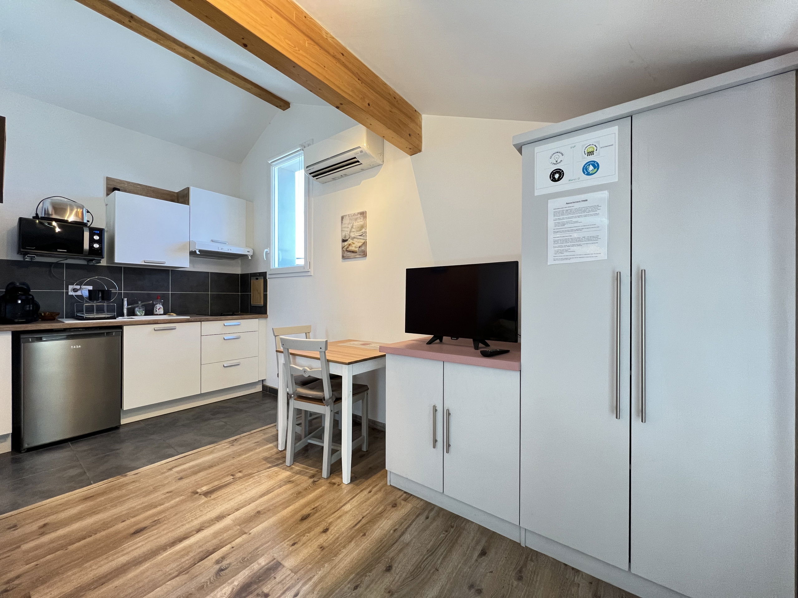 The open plan kitchen, electric, is equipped with refrigerator, microwave, dishes/cutlery, kitchen utensils, coffee machine, toaster and kettle.