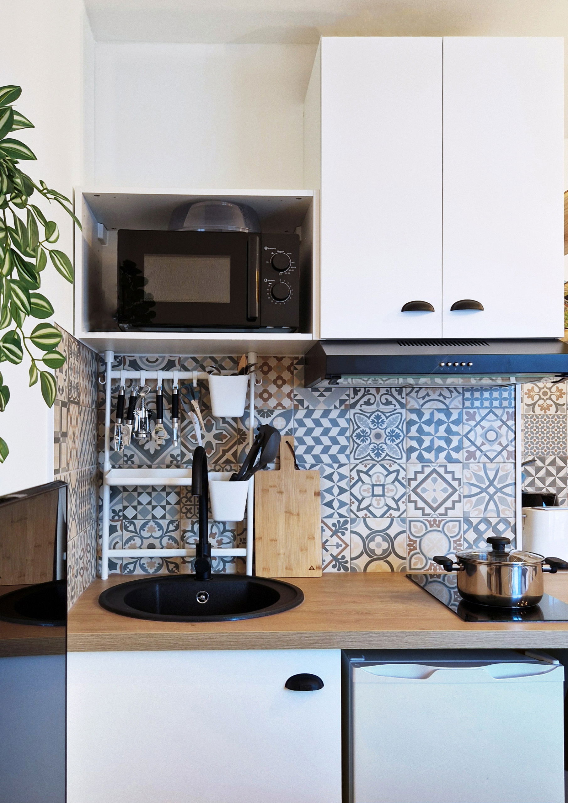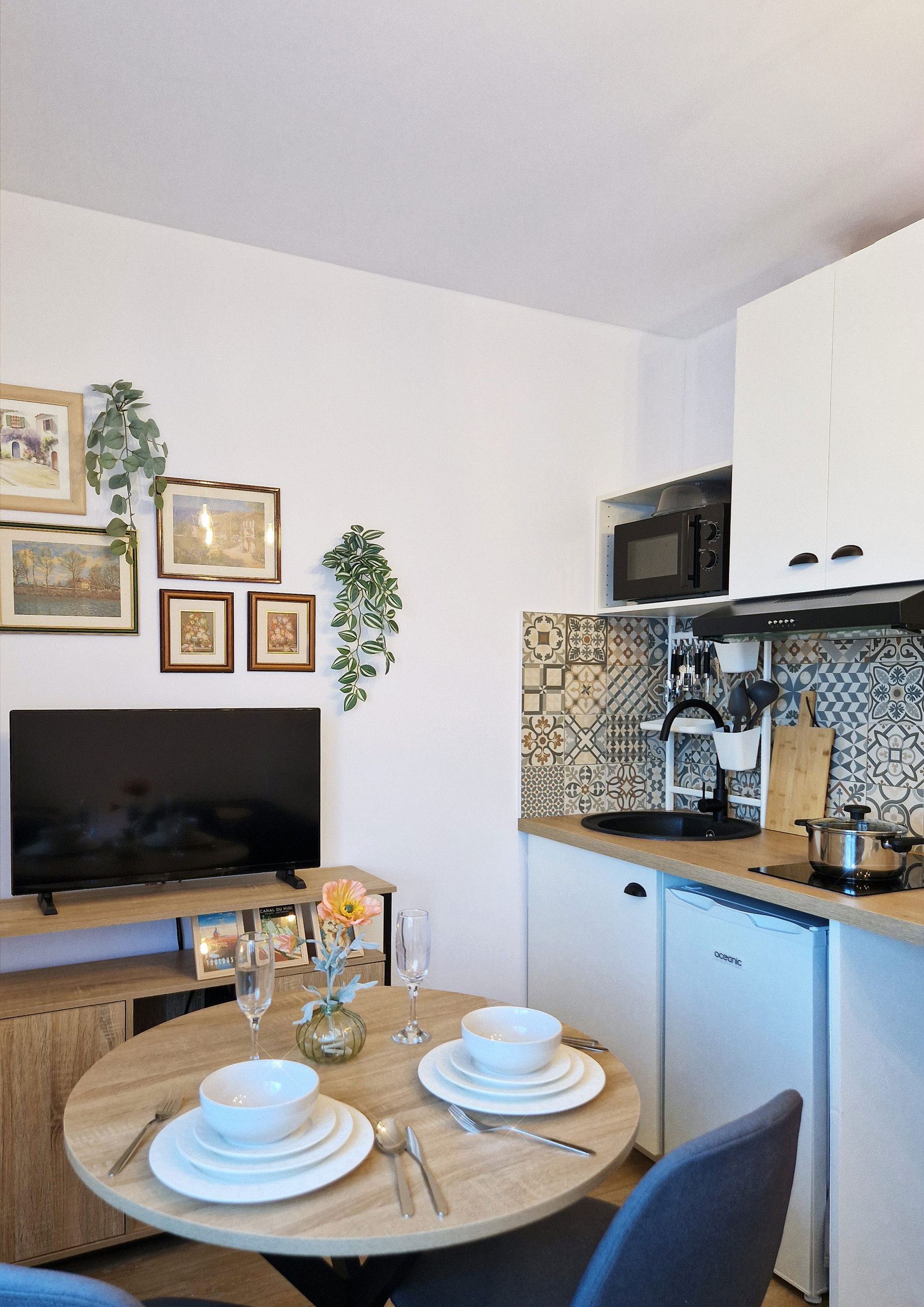The open plan kitchen, electric, is equipped with refrigerator, microwave, dishes/cutlery, kitchen utensils, coffee machine, toaster and kettle.