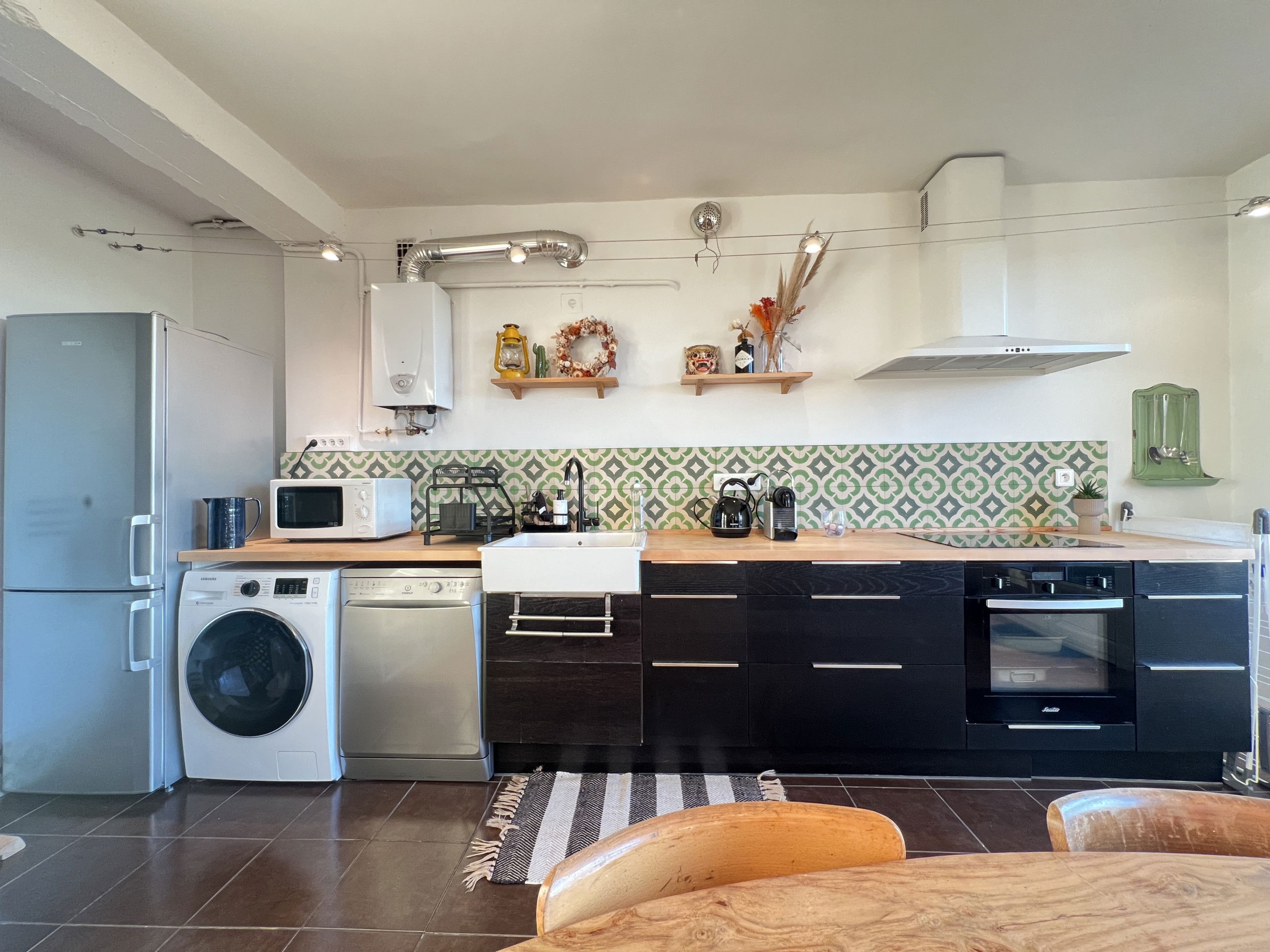 The open plan kitchen, electric, is equipped with refrigerator, microwave, oven, freezer, dishwasher, dishes/cutlery, kitchen utensils, coffee machine and kettle.