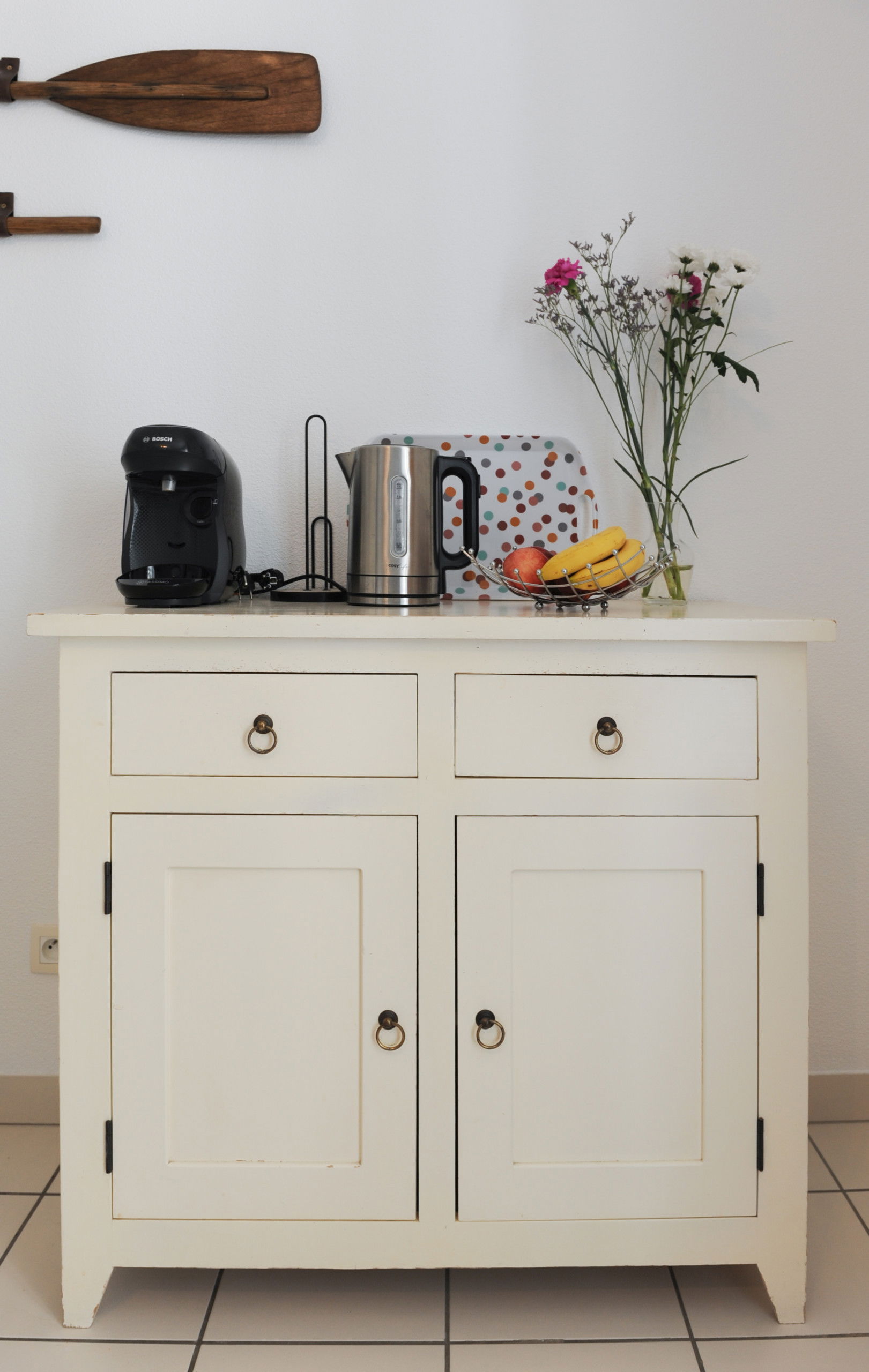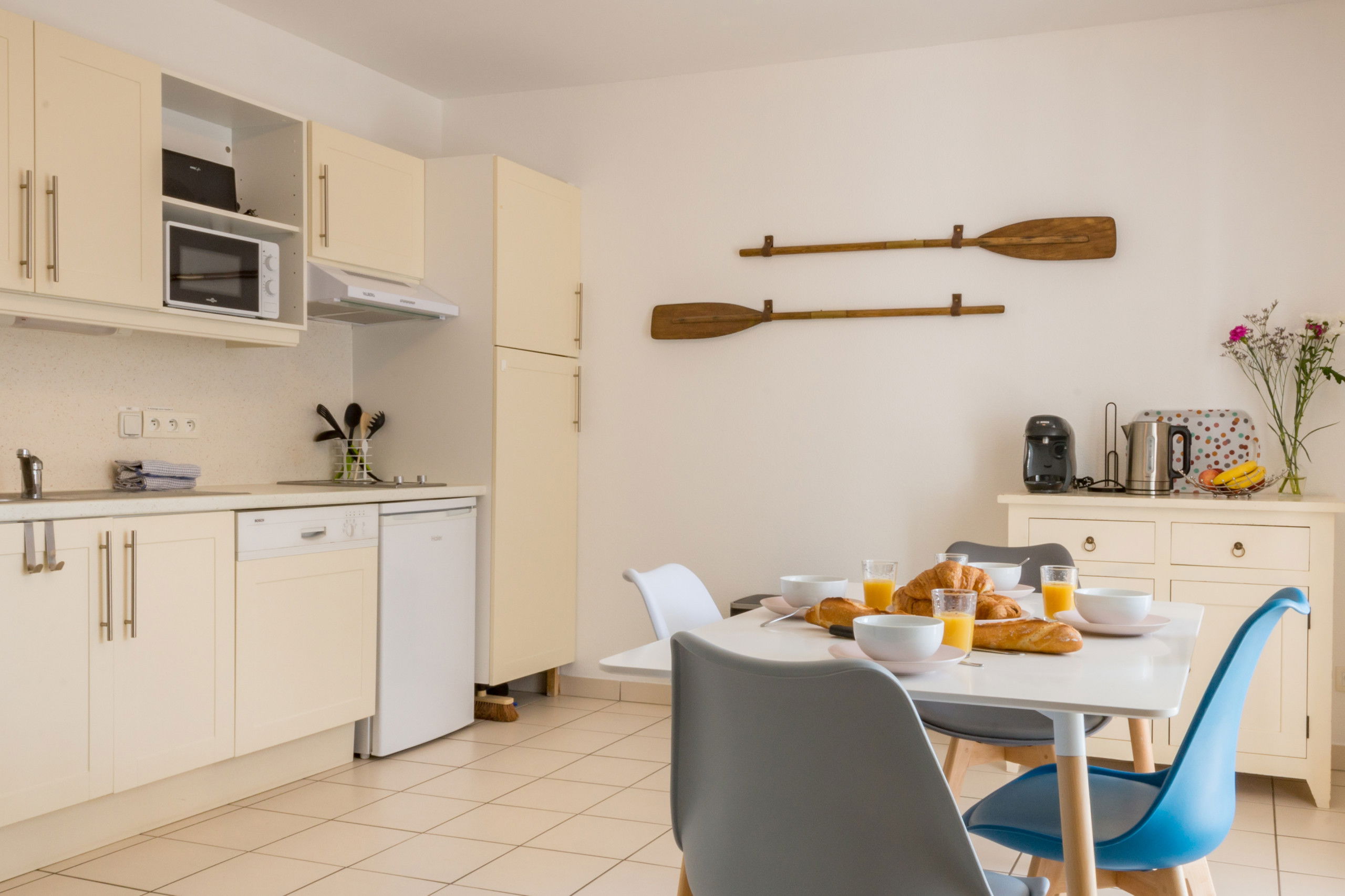 Kitchenette with ceramic hob, microwave oven, fridge-freezer, dishwasher,