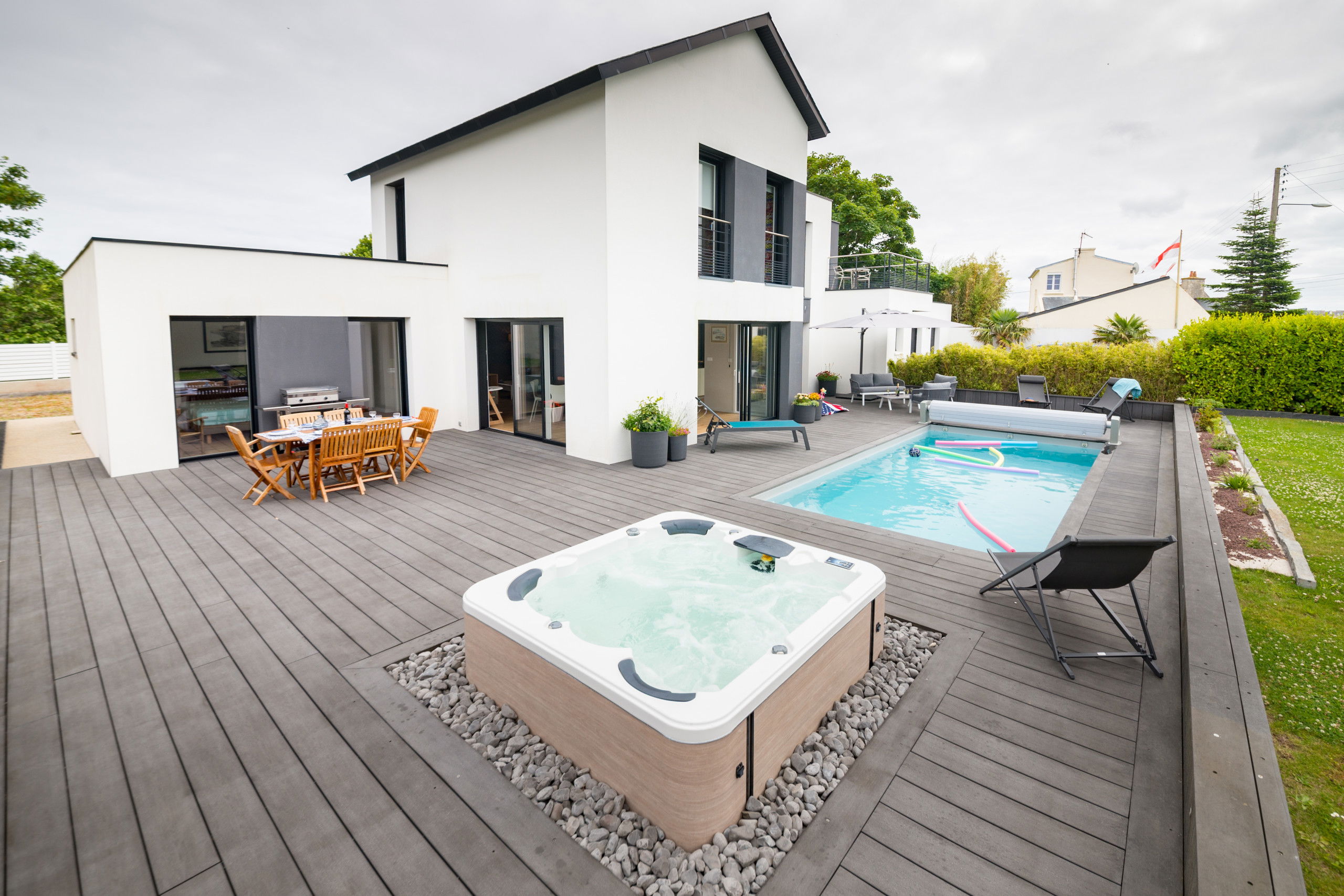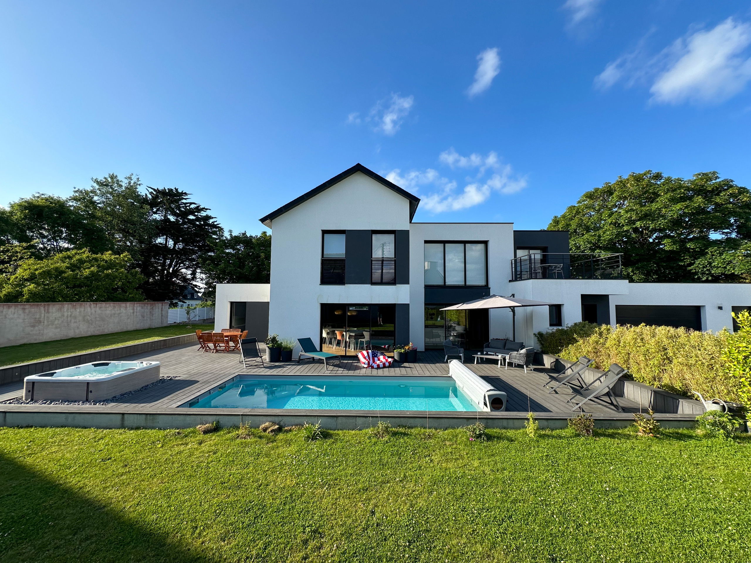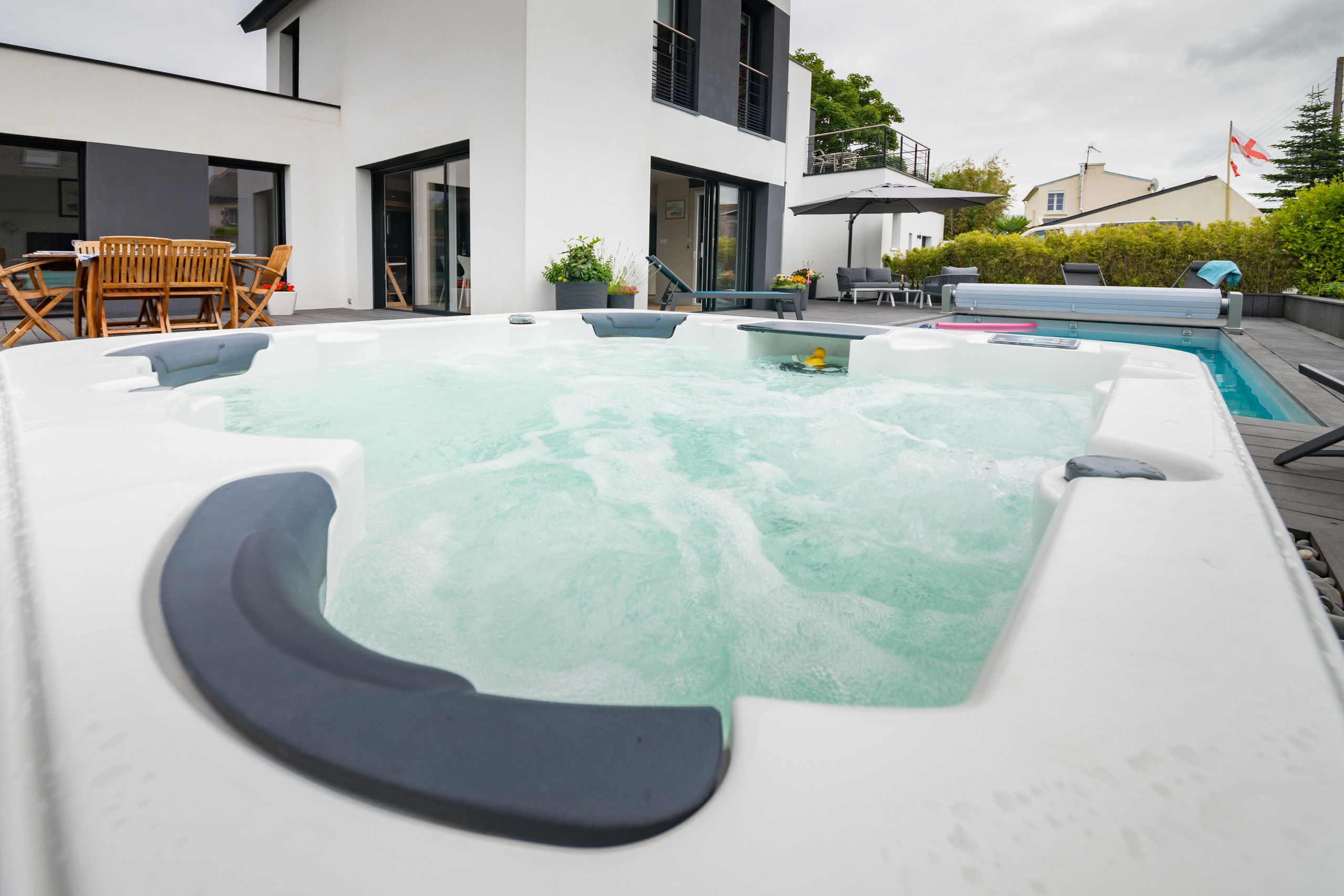 Outside, you will be delighted by the large enclosed garden, offering a vast petanque pitch and a superb heated swimming pool at 27° from May to September depending on weather conditions. Relax in the spa heated to 29° from April to October or enjoy the large landscaped terrace with a dining area and an outdoor lounge for convivial and relaxing moments outdoors. The charcoal barbecue is replaced by a beautiful electric plancha for good meals with family or friends. The house is also equipped with a very spacious indoor and outdoor parking area.