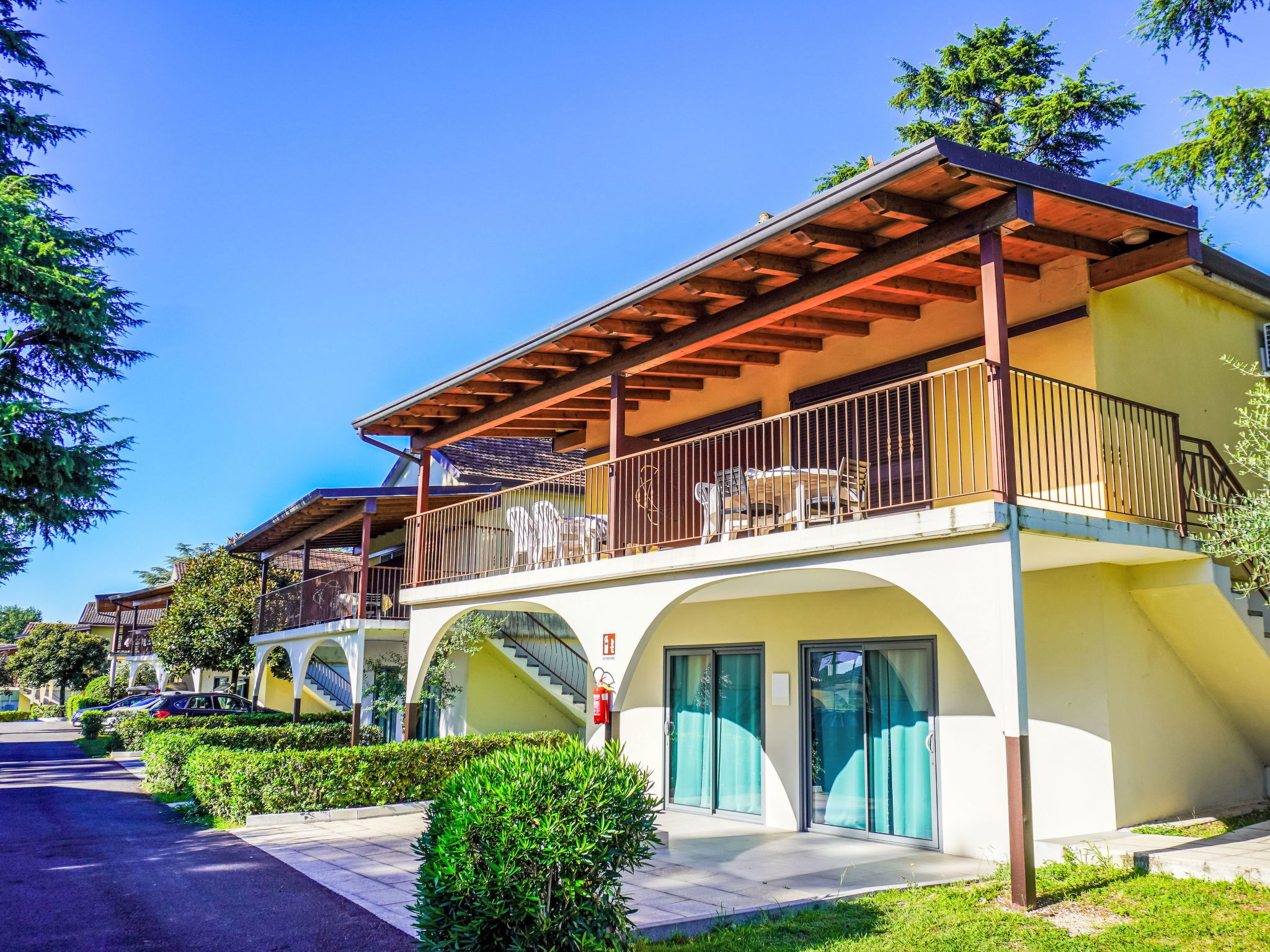 Large, child friendly resort "Sanghen". In the district of Pieve di Manerba 3.5 km from the centre of Manerba del Garda, on a slope, 250 m from the lake, 250 m from the beach, direct access to the beach. For shared use: property 70'000 m2 (fenced), trees, lawn for sunbathing, 3 swimming pools (seasonal availability: 01.May. - 30.Sep. and 01.Jul. - 31.Aug. pool opening hours: 08:30-13:00 and 15:30-19:30). Children's pool, outdoor shower, hot tub, tennis, children's playground. In the complex: reception, restaurant, bar, WiFi, washing machine (extra), tumble dryer (for shared use, extra). Bread roll service, breakfast and half board possible (extra). Stepped path to the house. Parking (limited number of spaces) on the premises. E-charging station. Bus stop 50 m, pebble beach 250 m. Golf course (27 hole) 6 km. Nearby attractions: Salò 9 km, Desenzano del Garda 15 km, Brescia 38 km. Please note: entertainment in the season. Suitable for families. Private mooring (extra) on request.