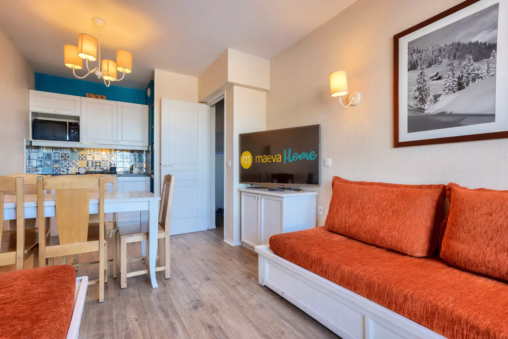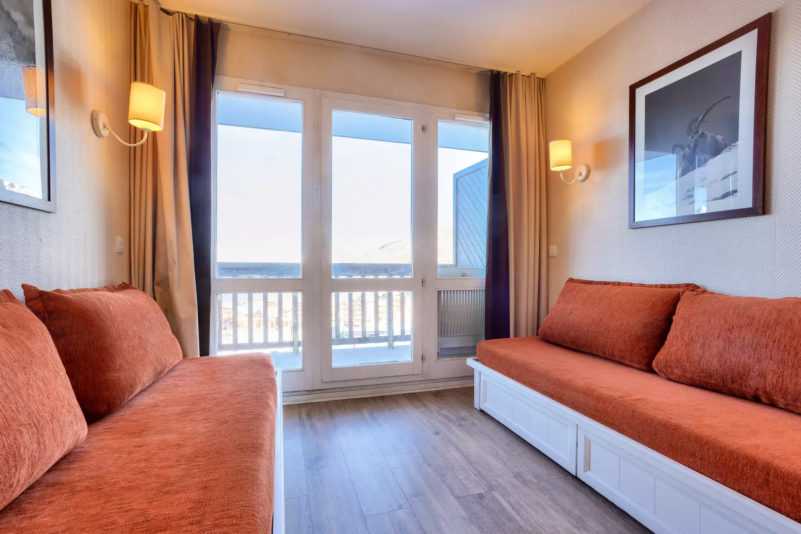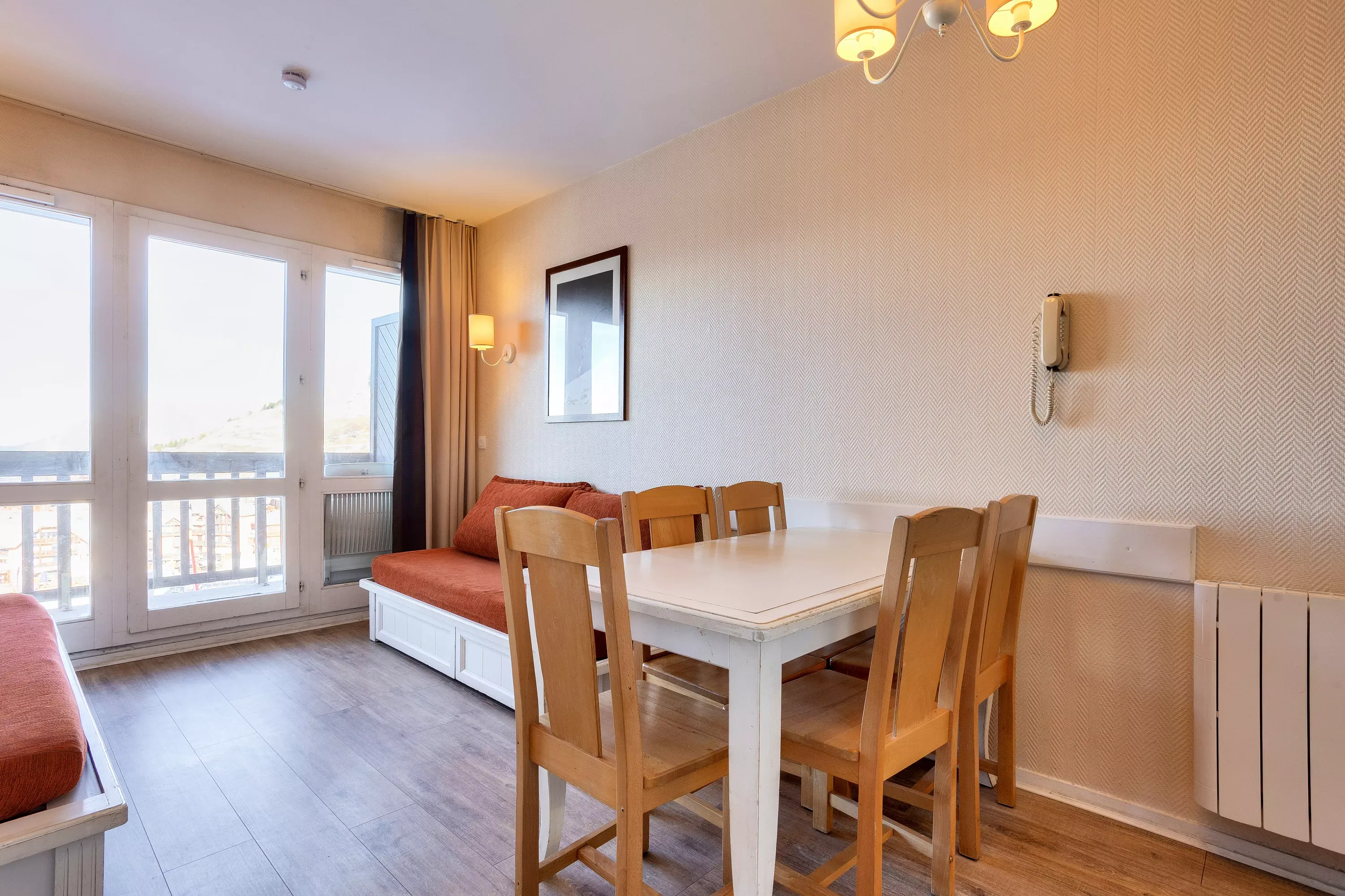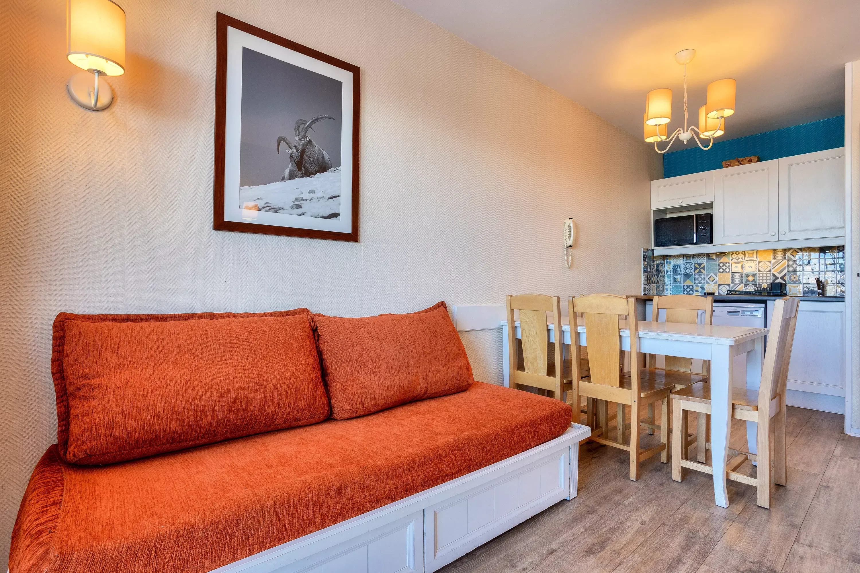 Living room composition: 2 sofa beds (sofa 1 with 2 beds, sofa 2 with 1 bed). Dining area: 1 table with 1 chair.