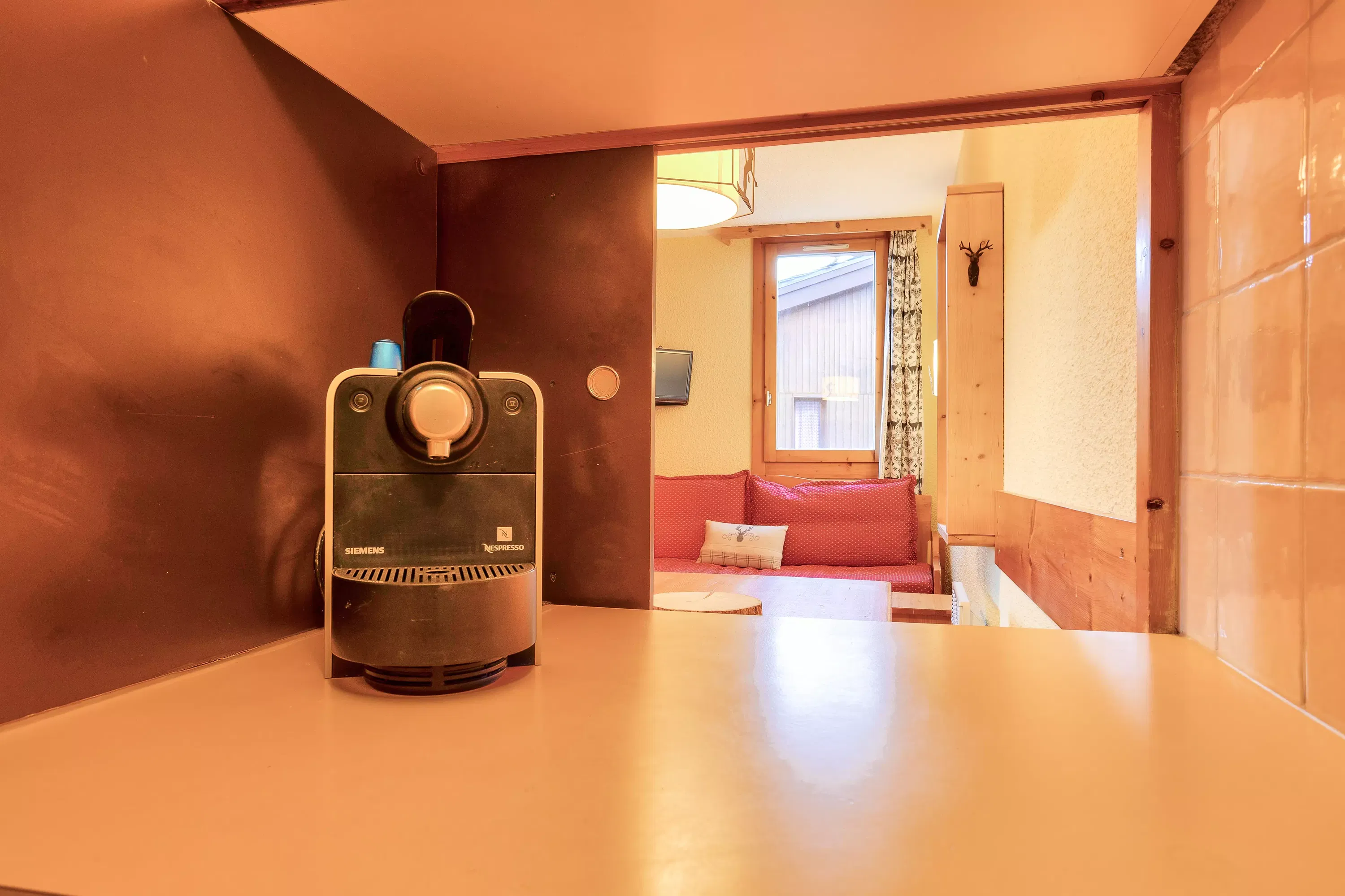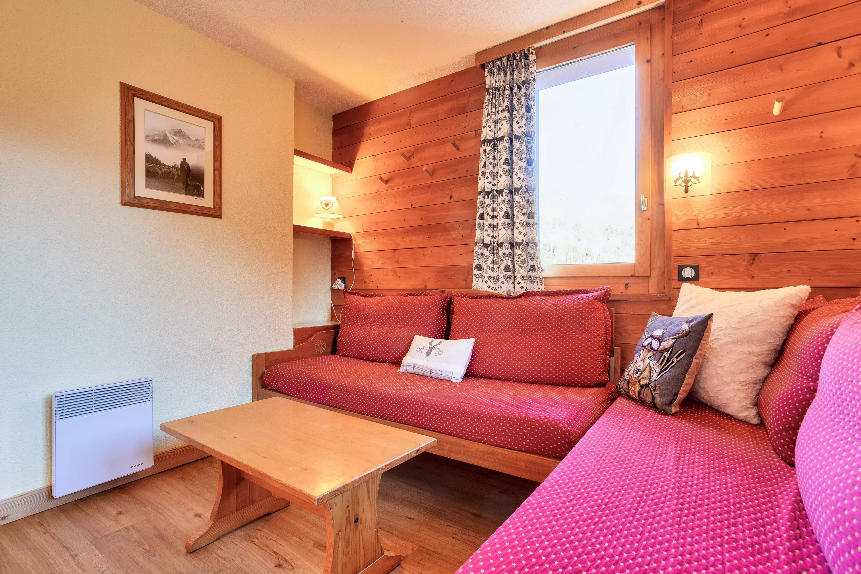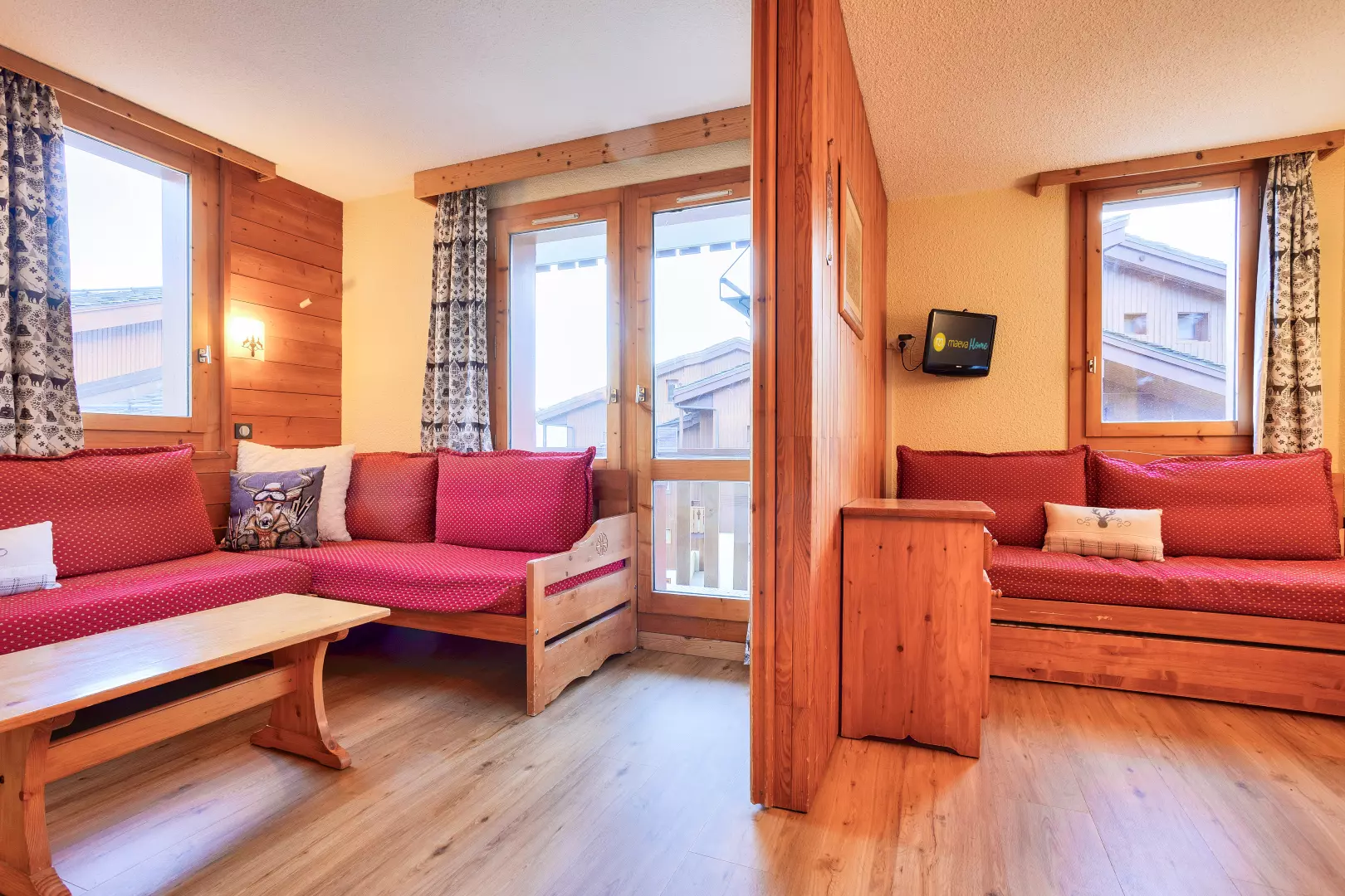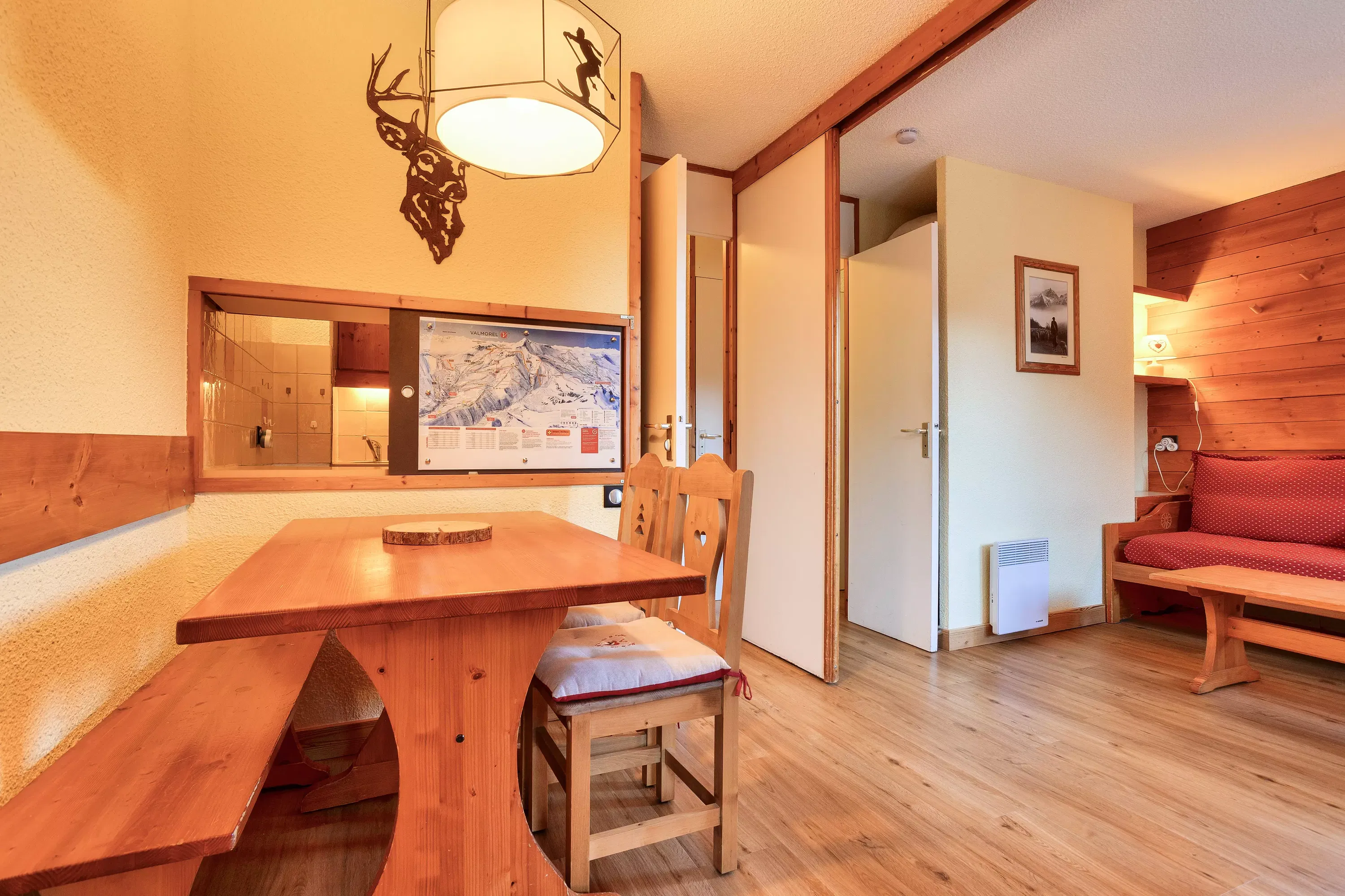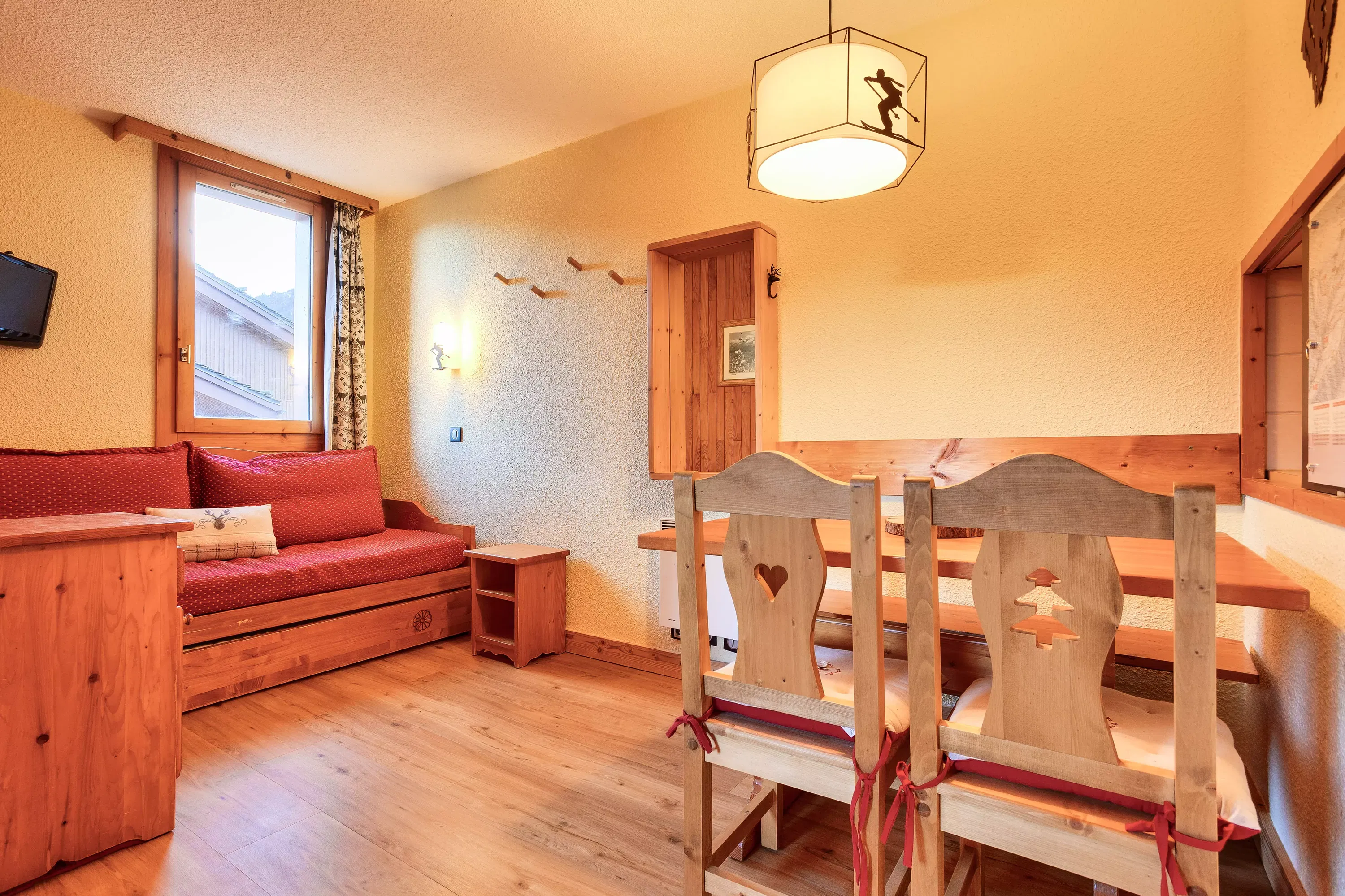 Living room facilities: 1 sofa bed with 1 pull-out bed on the dining side and 2 sofa beds on the living room side. Dining side: a table with 2 chairs and 1 bench.