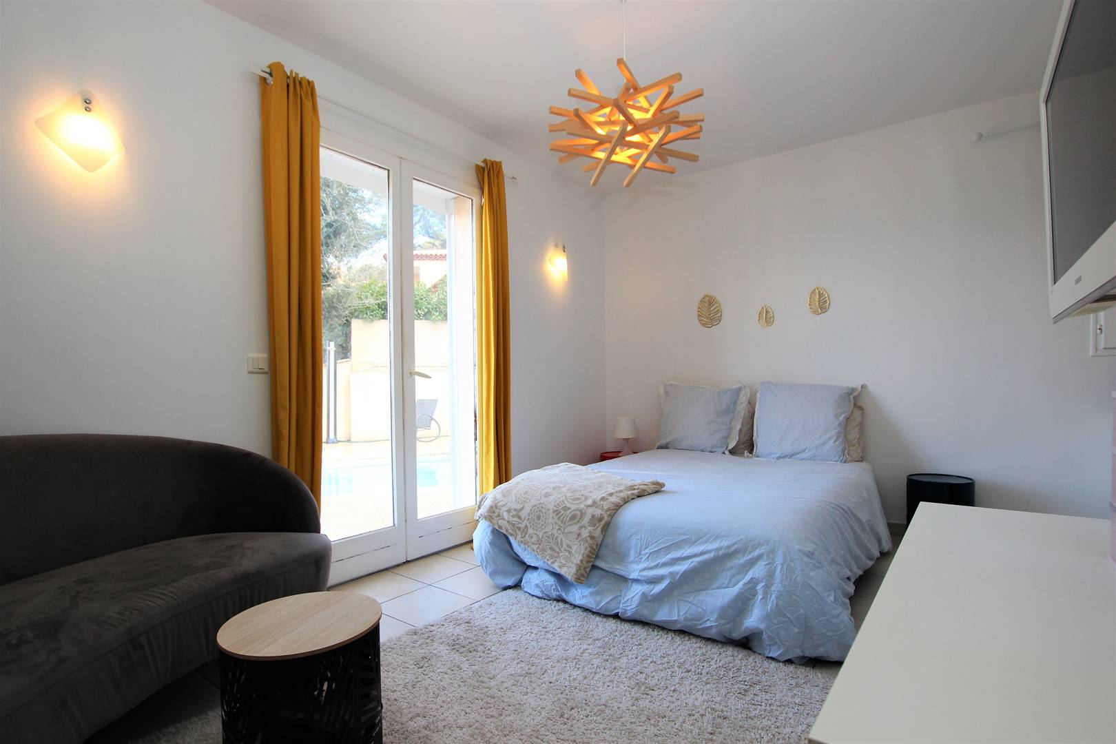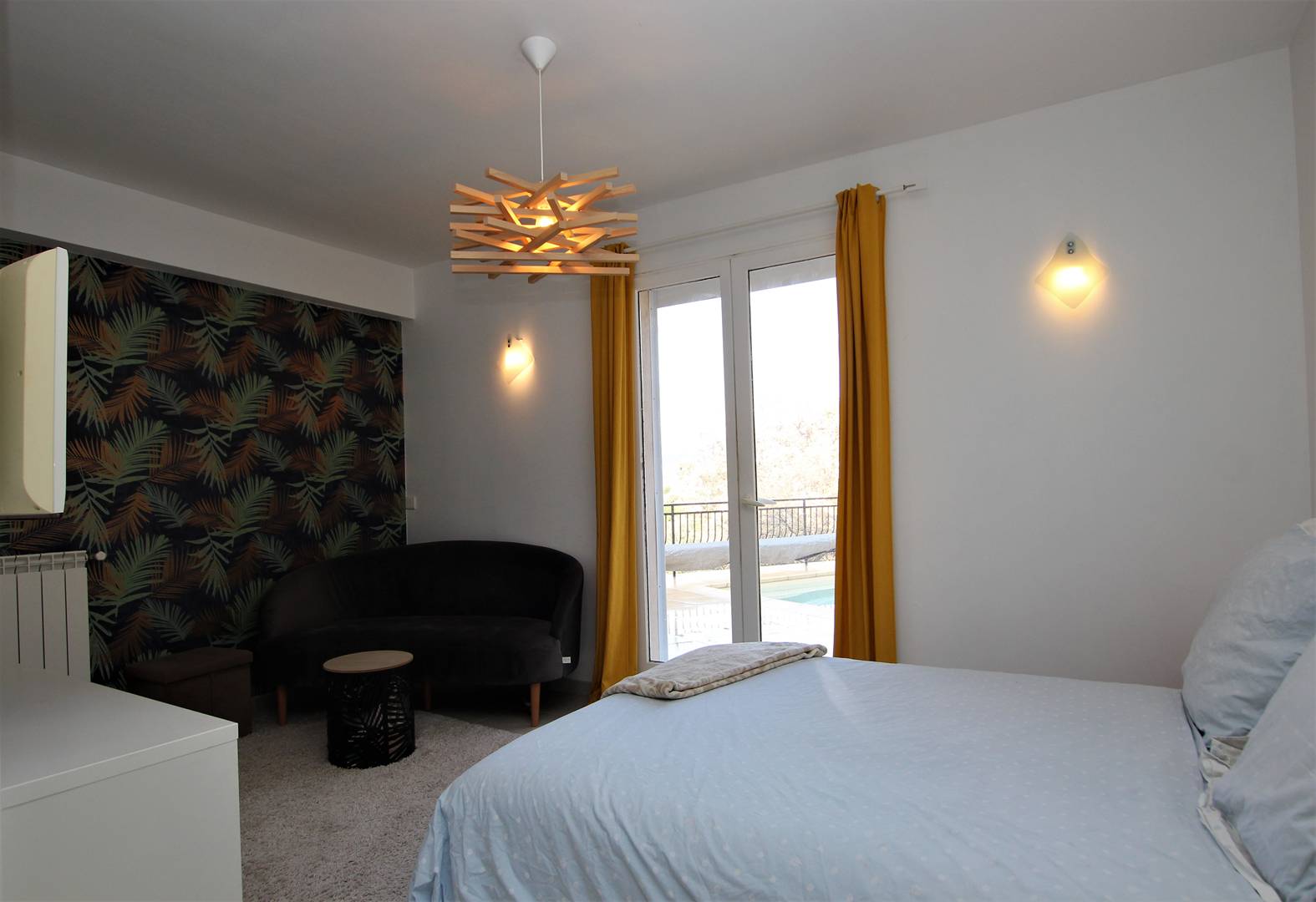 Bedroom with 1 double bed (140), exit to swimming pool.