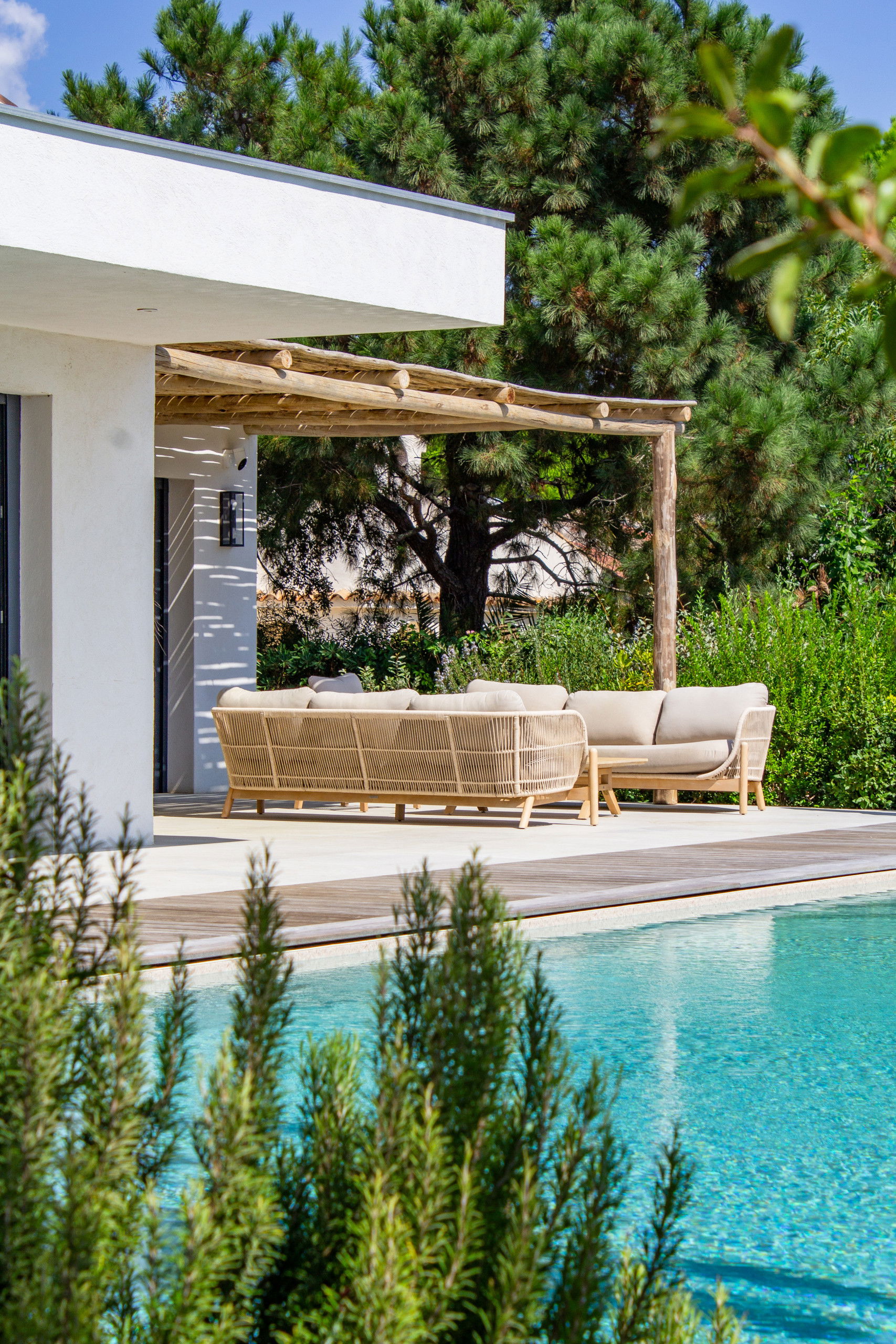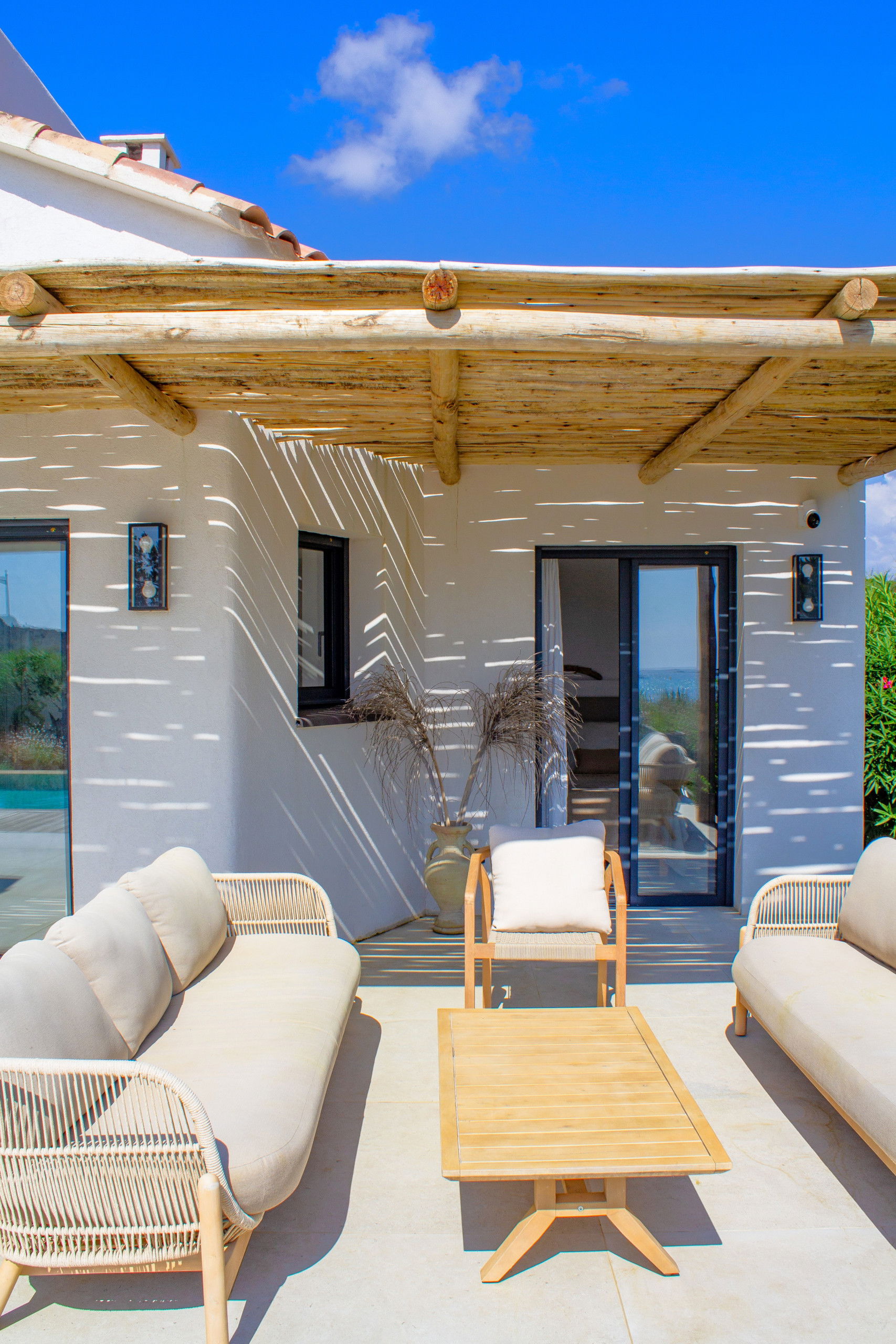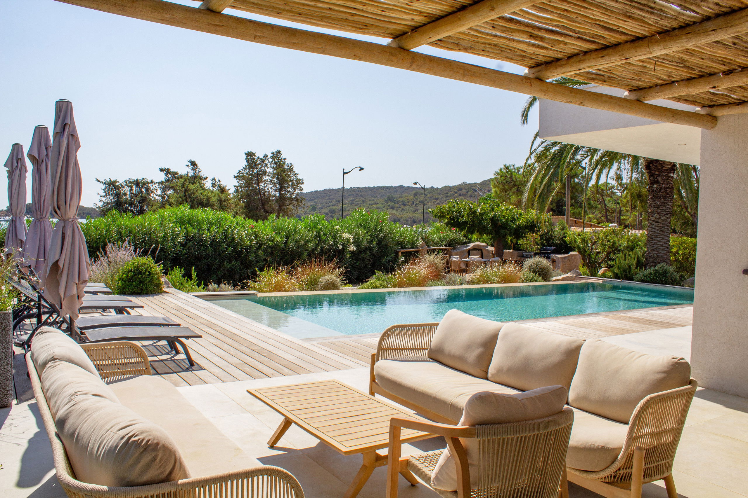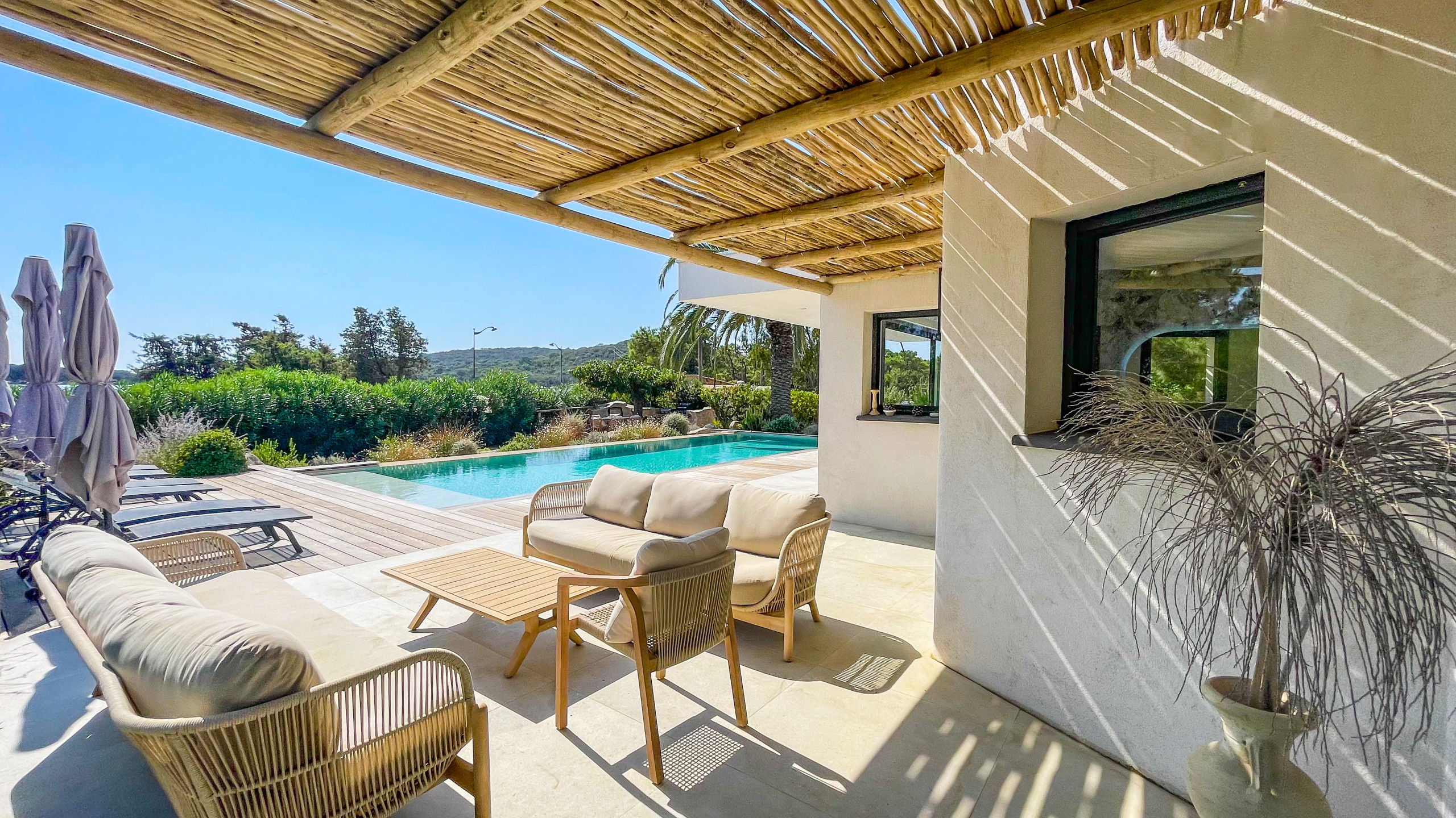Large terrace with lounge area, 6 sunbeds and a dining space for lunch sheltered from the sun.