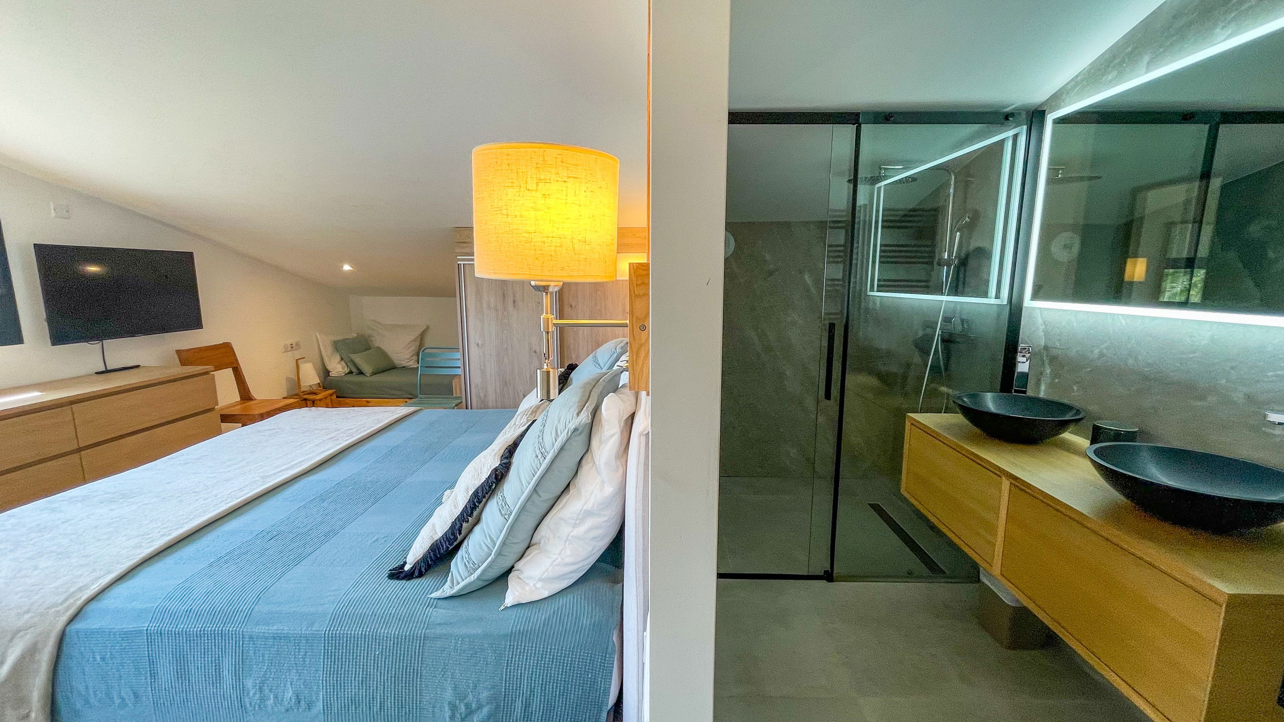 • Double room with 160x200 bed (convertible into 2 80x200 beds), en-suite bathroom and sea view.
