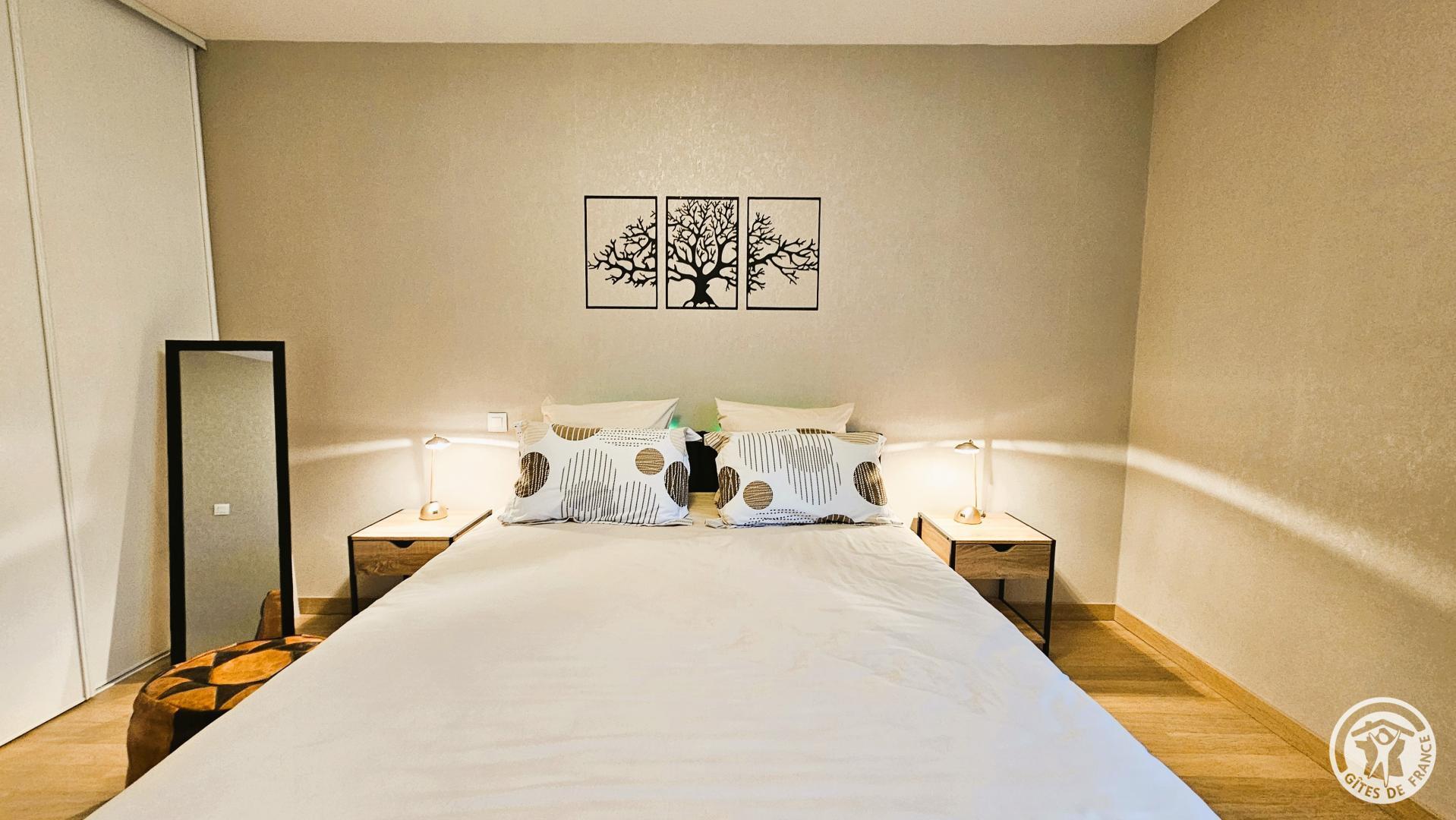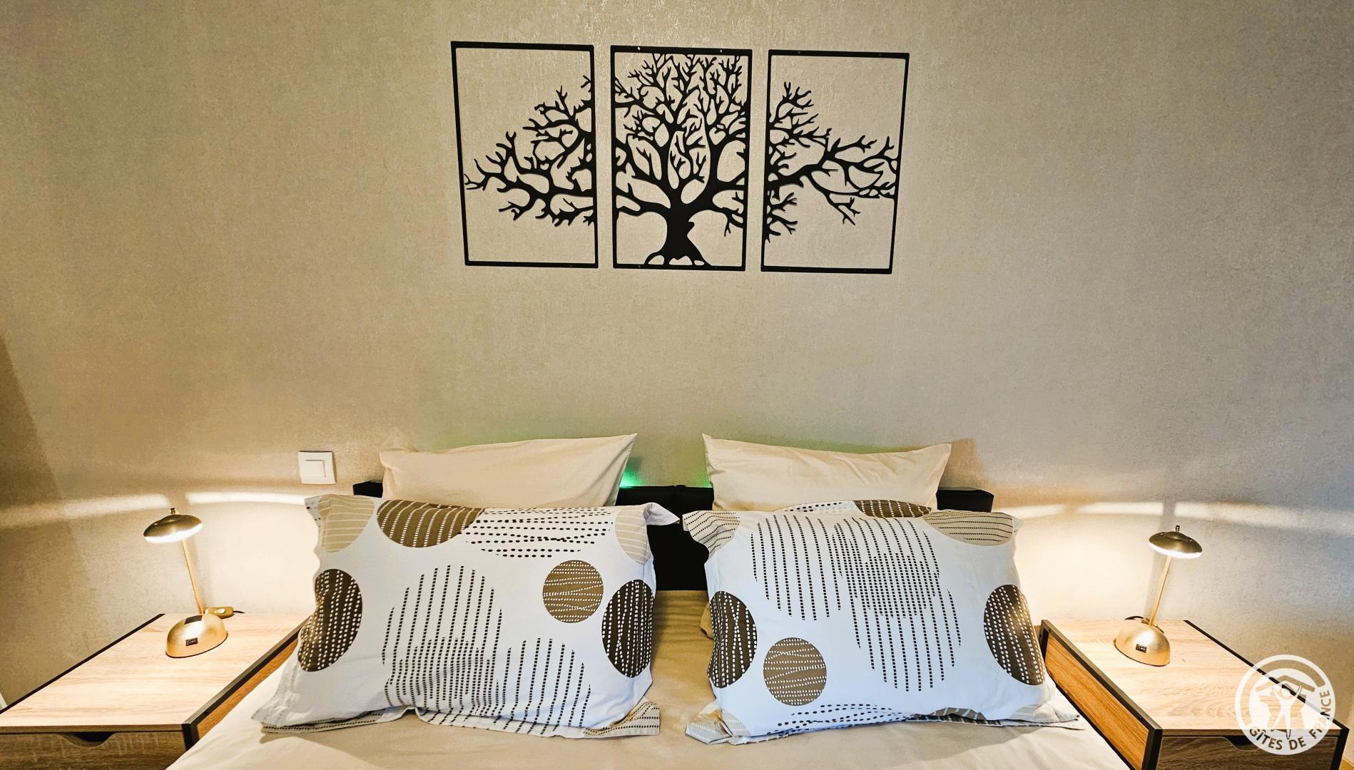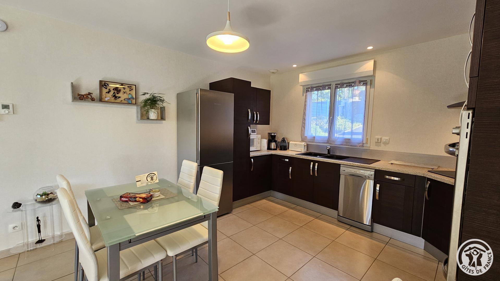 Upon entering on the ground floor, you will be greeted by a room bathed in natural light, thanks to its large bay window that opens onto a terrace. This will allow you to admire a clear view of the surrounding valleys. The living room is furnished with two comfortable sofas, accompanied by a coffee table, a television, as well as a WIFI connection. The kitchen, meanwhile, is open to the living room and has all the necessary equipment to prepare delicious meals.