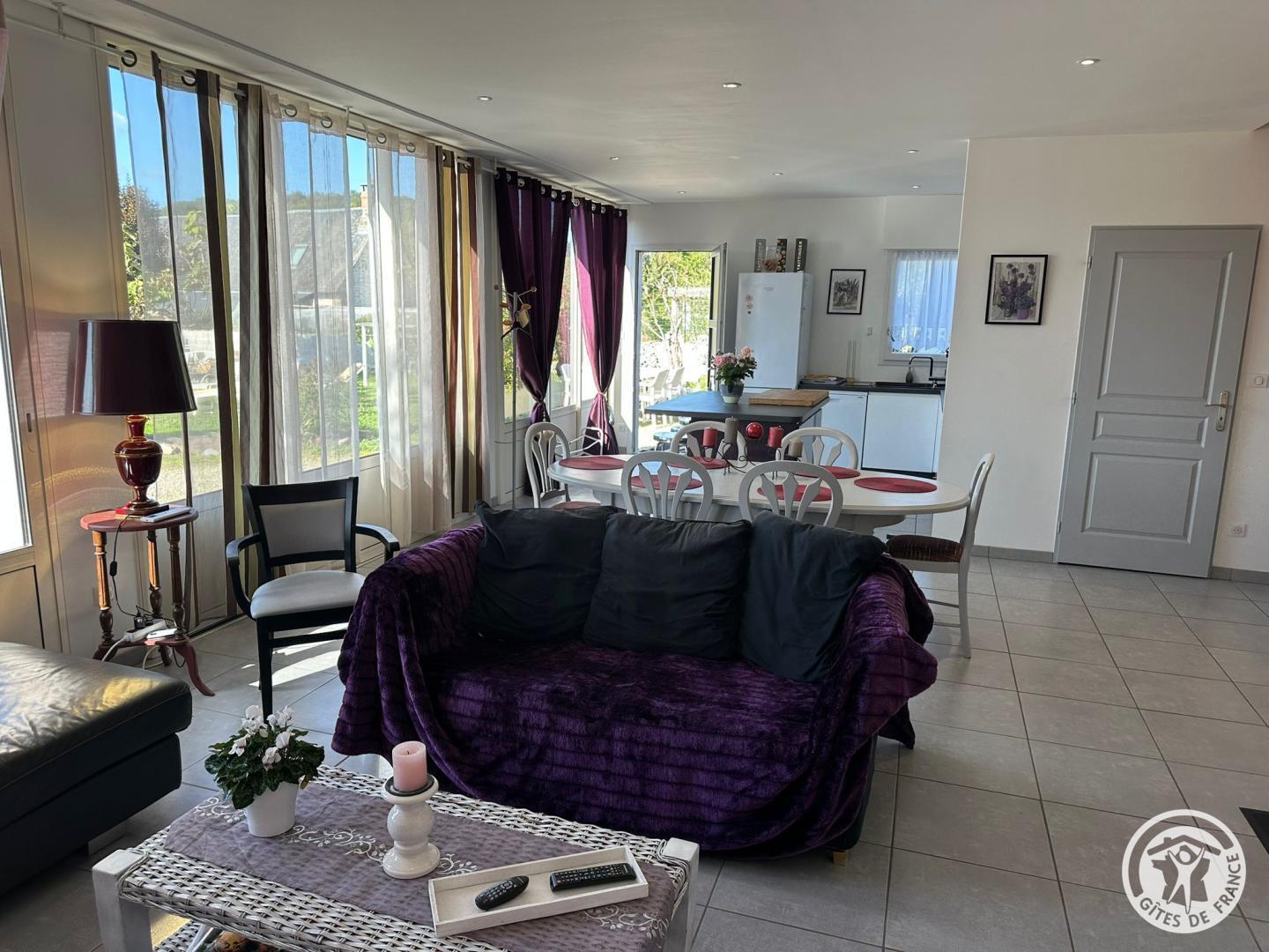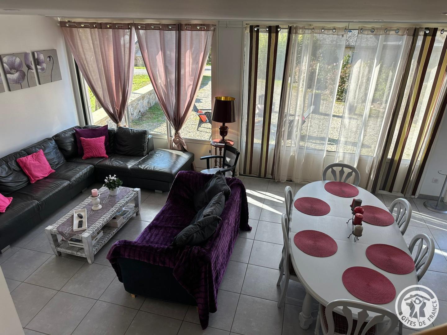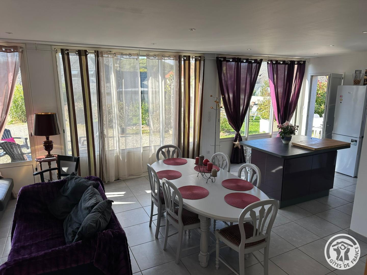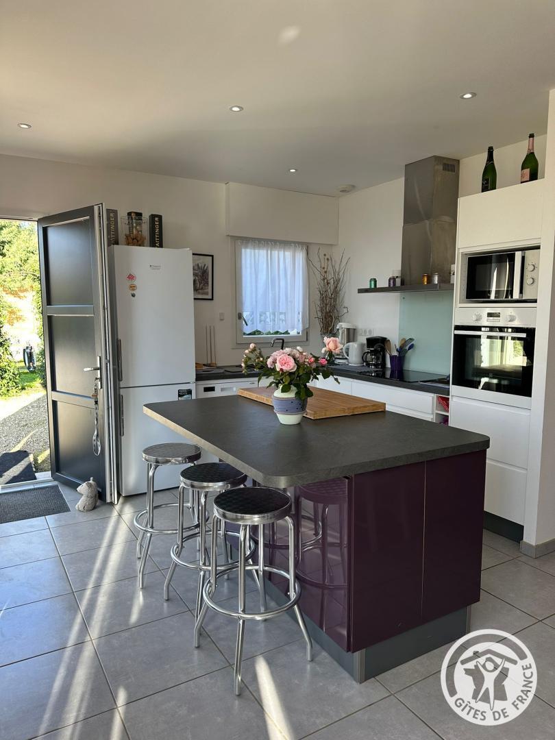 Gîte with a spacious and very bright living room thanks to large bay windows, fully equipped modern kitchen, 3 bedrooms (1 bedroom for 2 people on the ground floor with a 160 cm bed, 1 bedroom for 2 people upstairs with a 140 cm bed, 1 bedroom - dormitory for 4 people, 4 beds of 90 cm), 2 shower rooms (1 on the ground floor and 1 upstairs), 2 toilets (1 on the ground floor and 1 upstairs), terrace with garden furniture, barbecue and garden. Capacity from 2 to 8 people. Possibility of renting the accommodation for only 2 people (ground floor of the gîte). The bedroom on the ground floor allows access for people with reduced mobility.