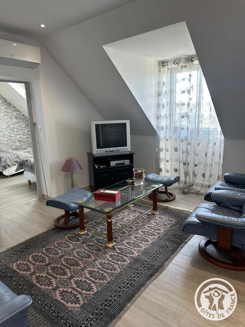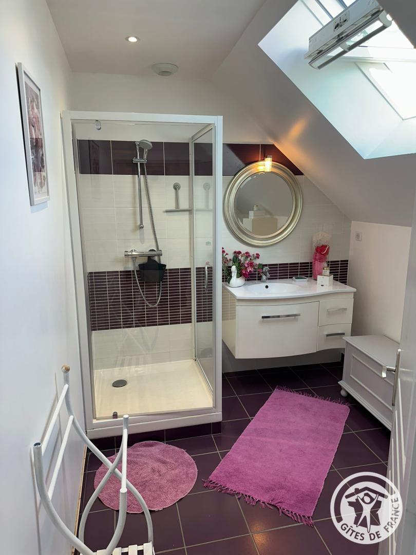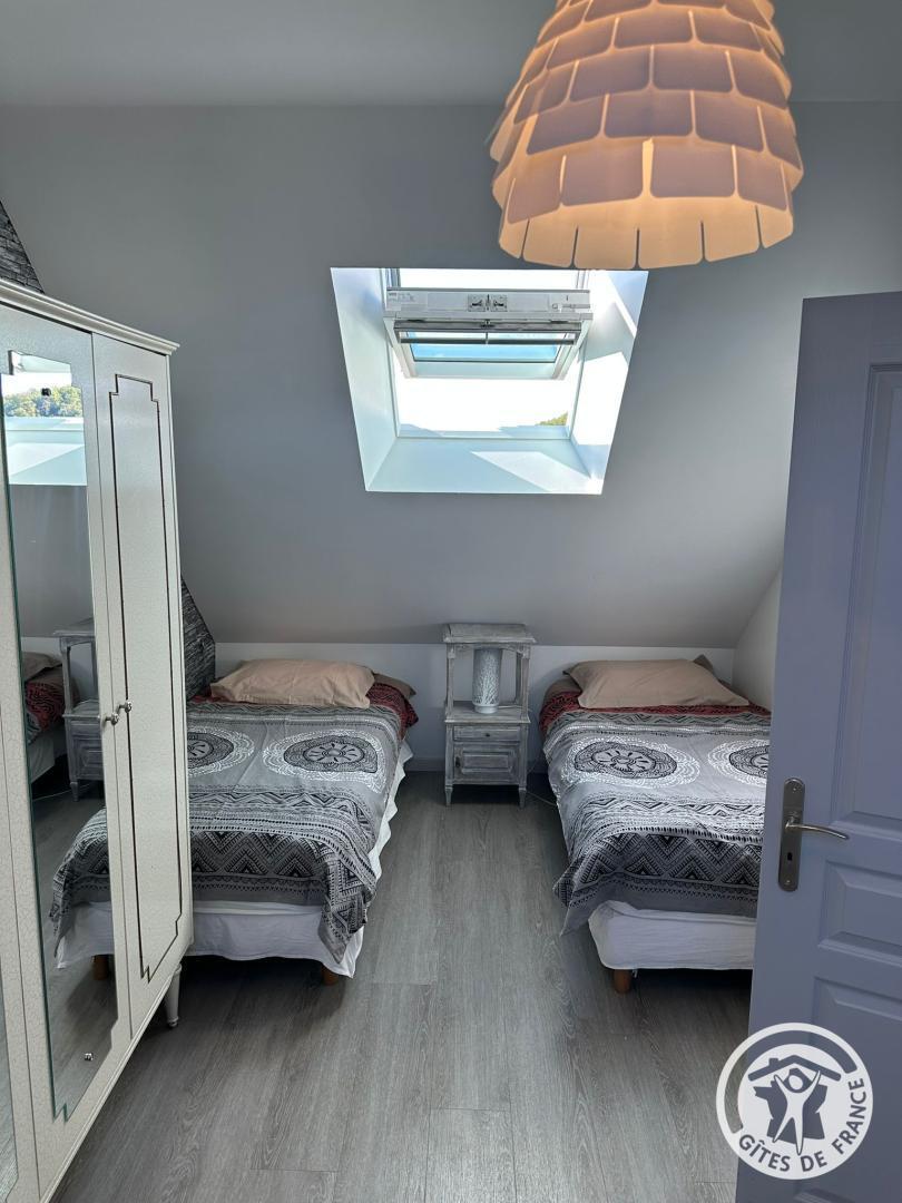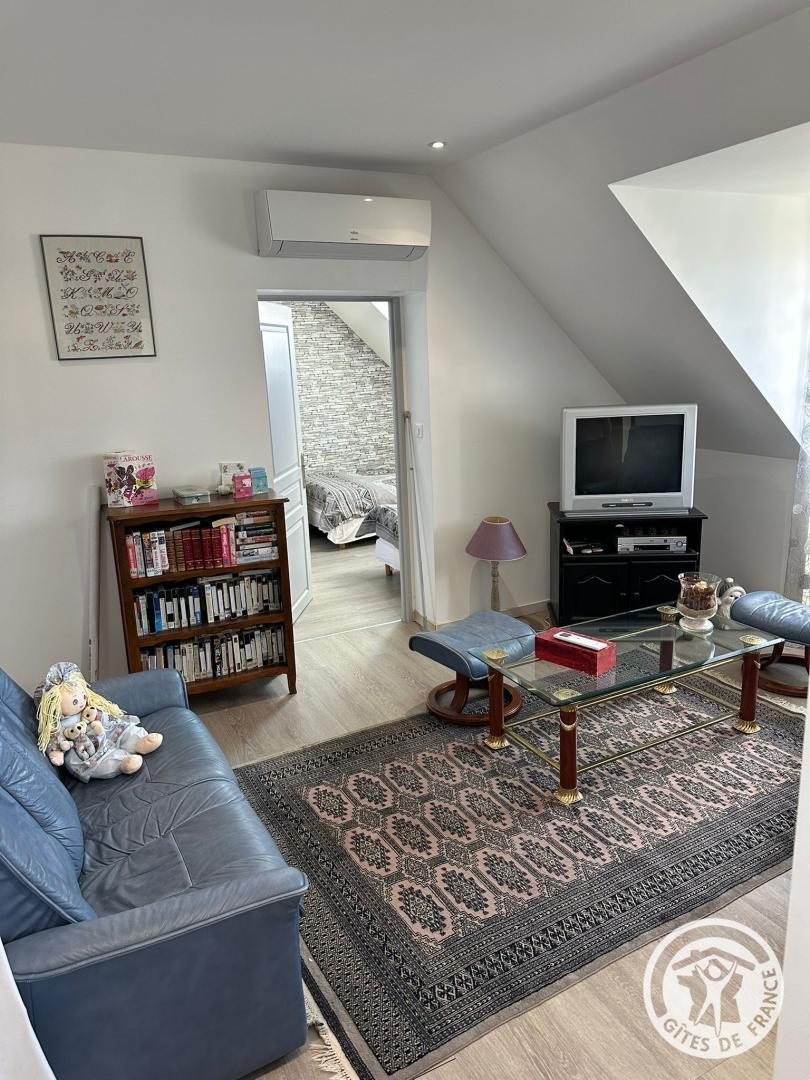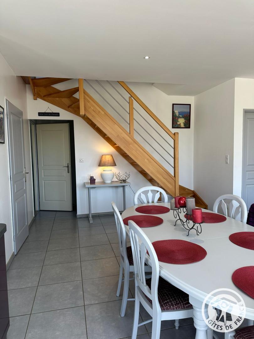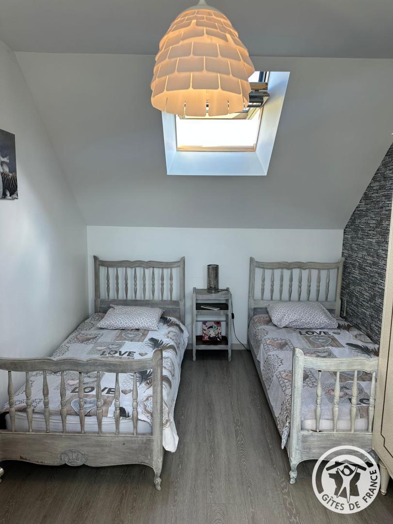 Gîte with a spacious and very bright living room thanks to large bay windows, fully equipped modern kitchen, 3 bedrooms (1 bedroom for 2 people on the ground floor with a 160 cm bed, 1 bedroom for 2 people upstairs with a 140 cm bed, 1 bedroom - dormitory for 4 people, 4 beds of 90 cm), 2 shower rooms (1 on the ground floor and 1 upstairs), 2 toilets (1 on the ground floor and 1 upstairs), terrace with garden furniture, barbecue and garden. Capacity from 2 to 8 people. Possibility of renting the accommodation for only 2 people (ground floor of the gîte). The bedroom on the ground floor allows access for people with reduced mobility.