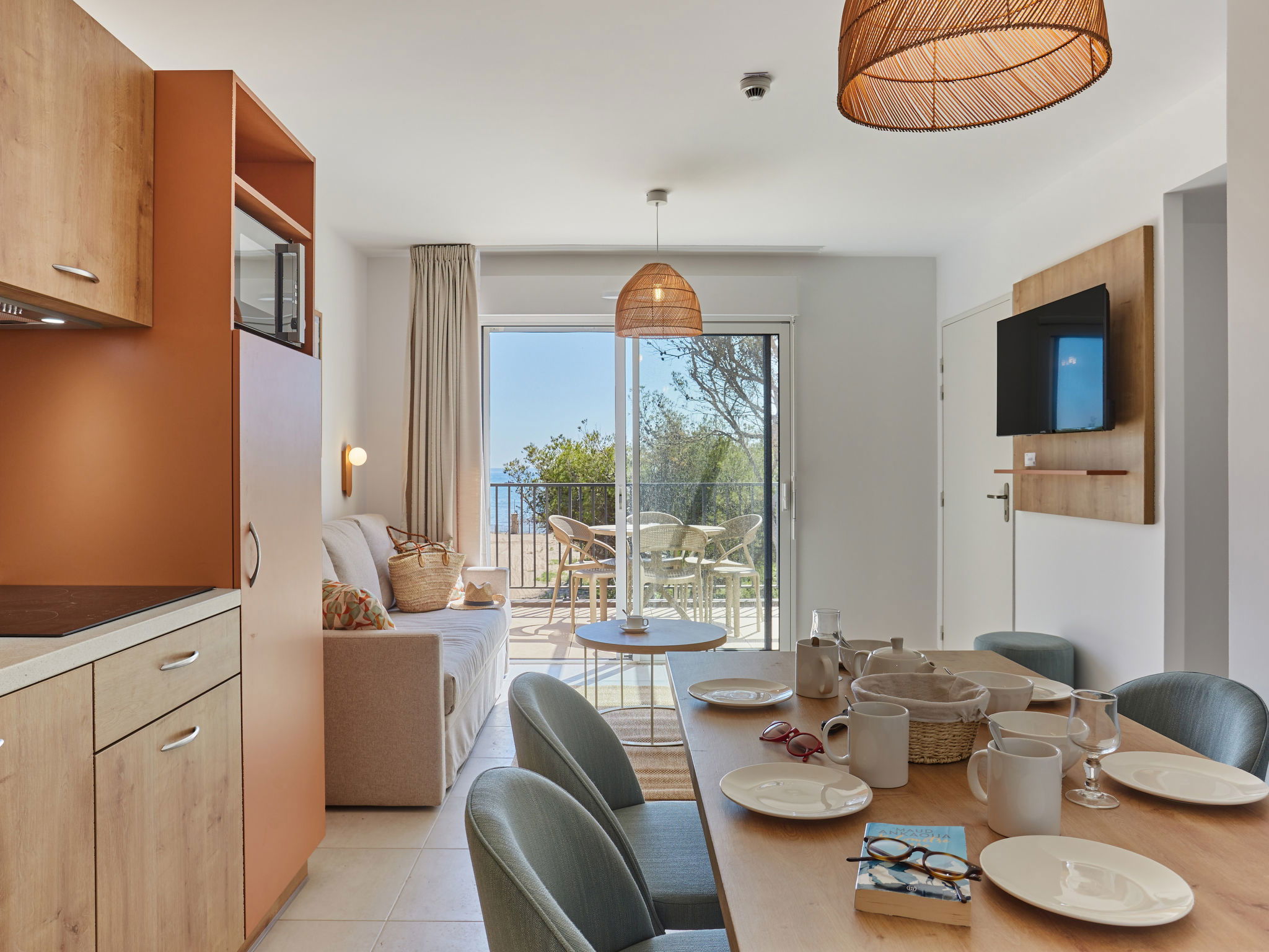 "Résidence Odalys Collection Riviera", 3-room apartment 43 m2. Modern furnishings: living/sleeping room with 2 sleeping facilities, dining table and TV (flat screen). Exit to the balcony, to the terrace. 1 room with 1 french bed (1 x 160 cm, length 200 cm). 1 room with 2 sleeping facilities. Small, open kitchen (dishwasher, 4 ceramic glass hob hotplates, toaster, kettle, electric coffee machine, Capsules for coffee machine (Capsules), combination microwave). Sep. WC, bath or shower. Electric heating. Balcony or terrace. Terrace furniture. Facilities: children's high chair, baby cot. Internet (WiFi, free). Parking. Please note: non-smokers only. Maximum 1 pet/ dog allowed. Smoke alarm, fire extinguisher.