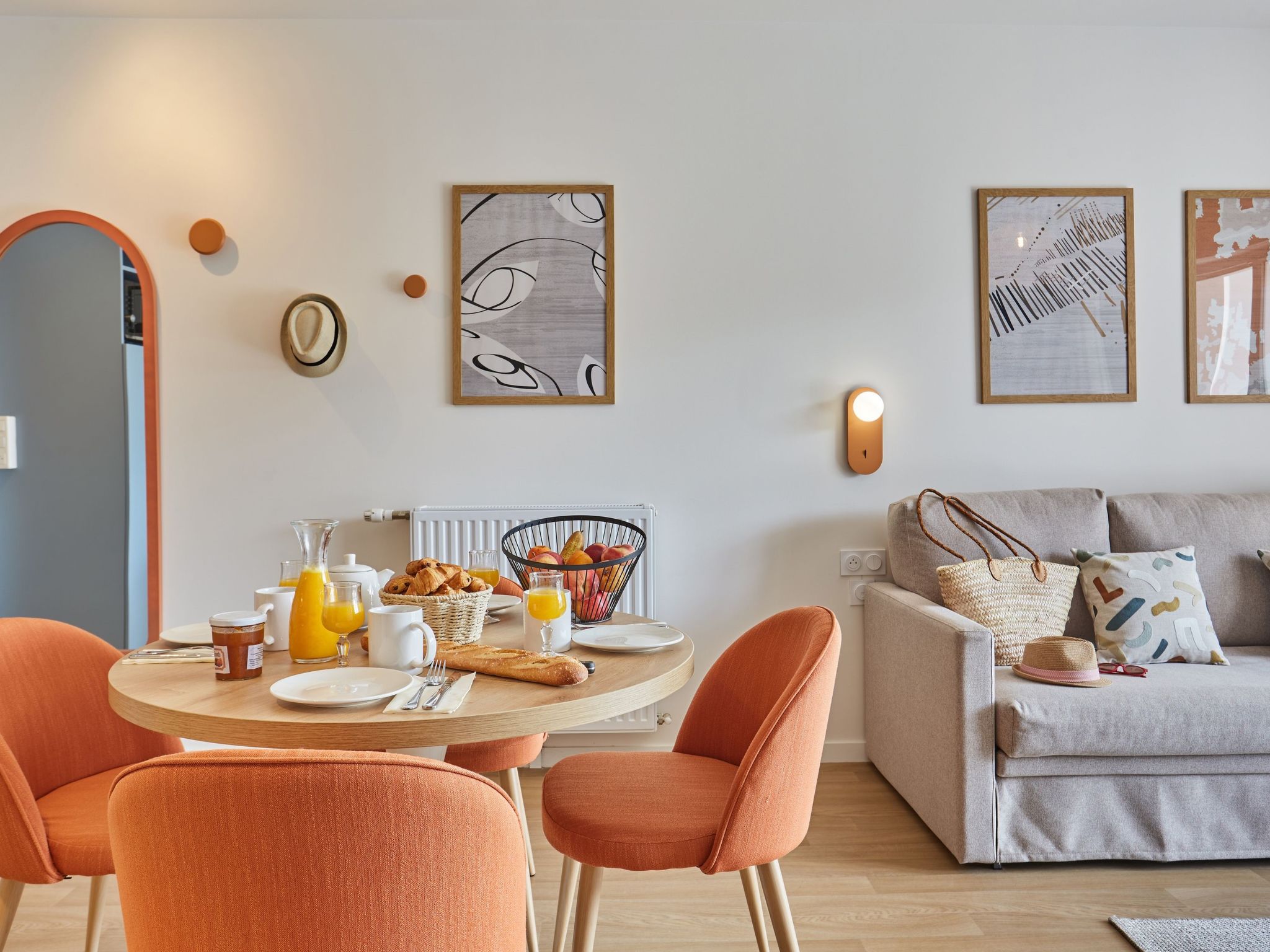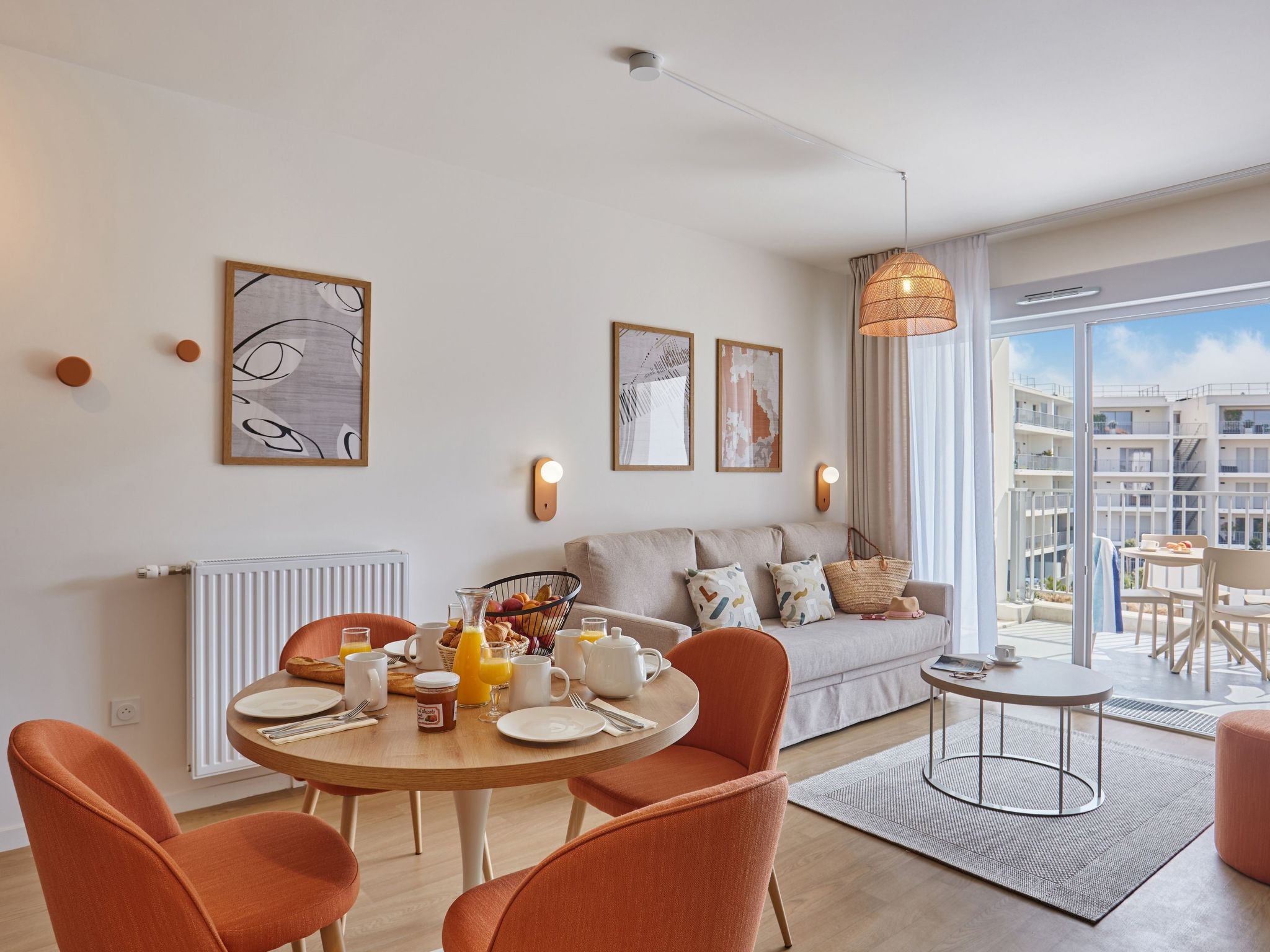 "Odalys Collection L'Orée du Parc", 2-room apartment 35 m2. Modern furnishings: living/sleeping room with 2 sleeping facilities, dining table and TV. 1 room with 1 french bed (1 x 160 cm, length 200 cm). Small, open kitchen (dishwasher, 4 ceramic glass hob hotplates, toaster, kettle, electric coffee machine, Capsules for coffee machine (Capsules), combination microwave). Sep. WC, bath or shower. Electric heating. Balcony or terrace. Terrace furniture. Facilities: children's high chair, baby cot (extra). Internet (WiFi, free). Parking (extra, roofed). Please note: non-smokers only. Maximum 1 pet/ dog allowed. Smoke alarm, fire extinguisher.