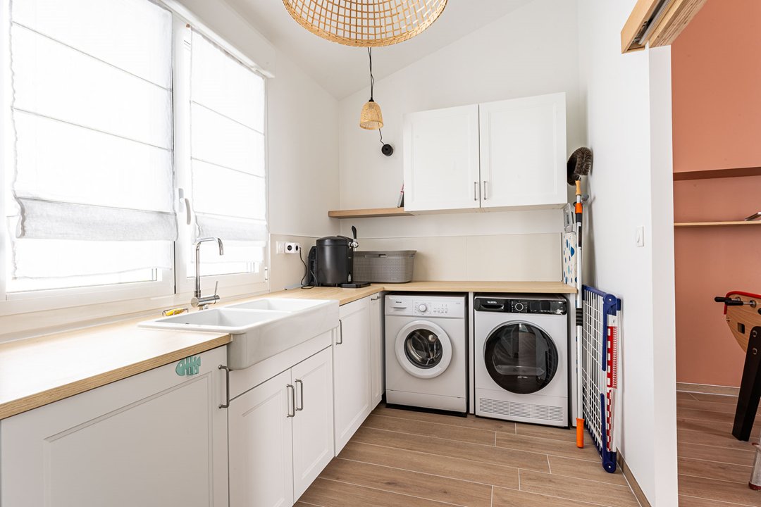 A small laundry room is adjoining with washing machine and dryer (on the ground floor).
