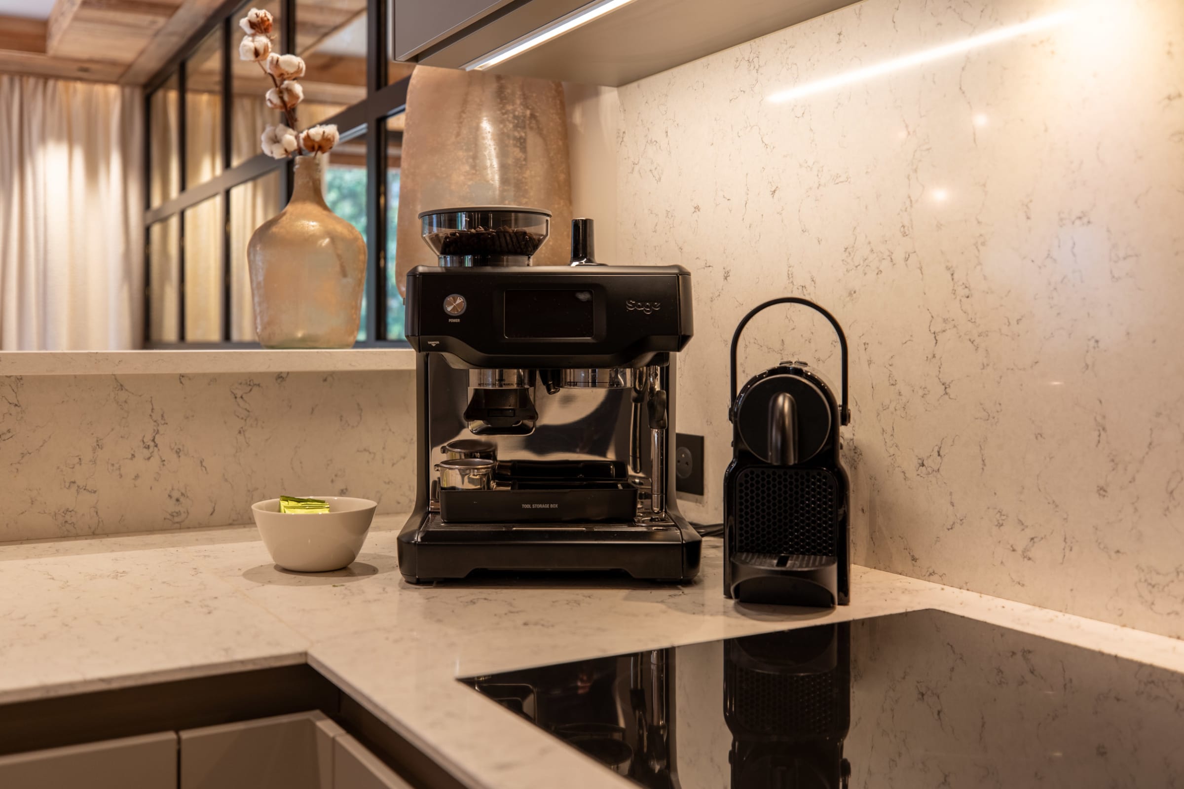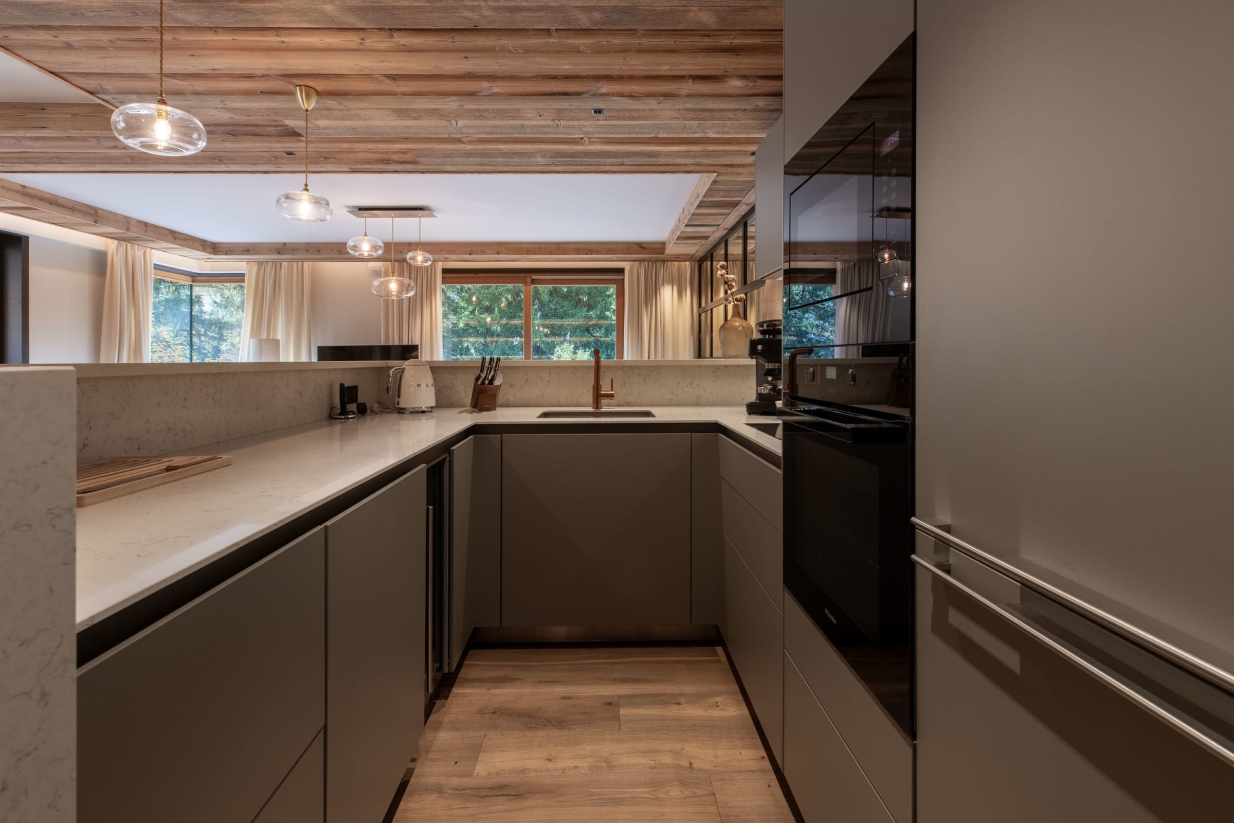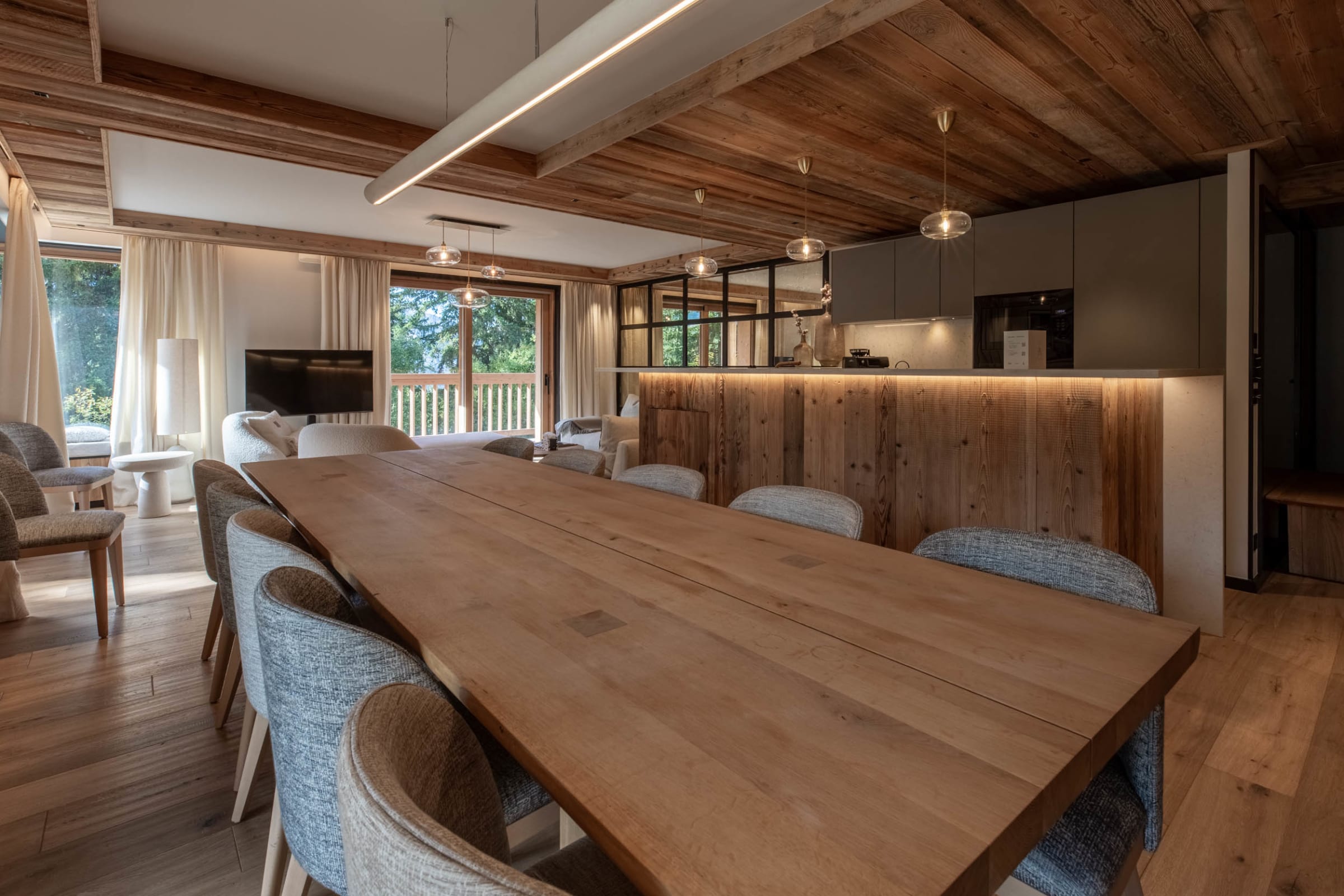 On one side, there is a large open-plan living room for moments together. On the other, there are 3 large en-suite bedrooms, including 2 family suites with separate mountain corners with bunk beds.