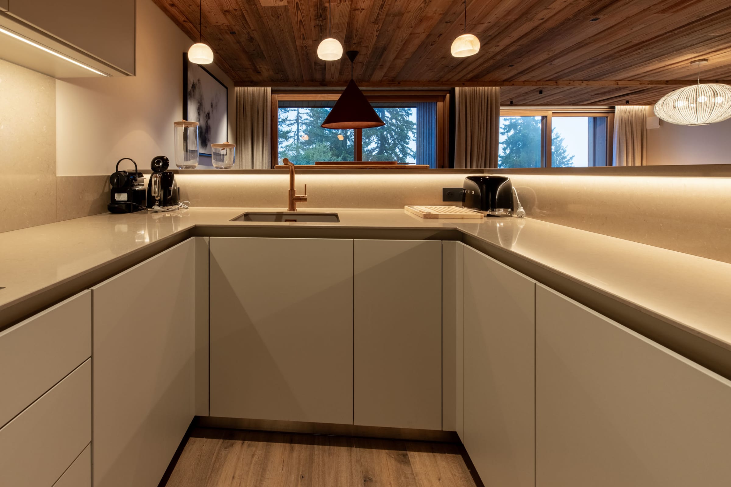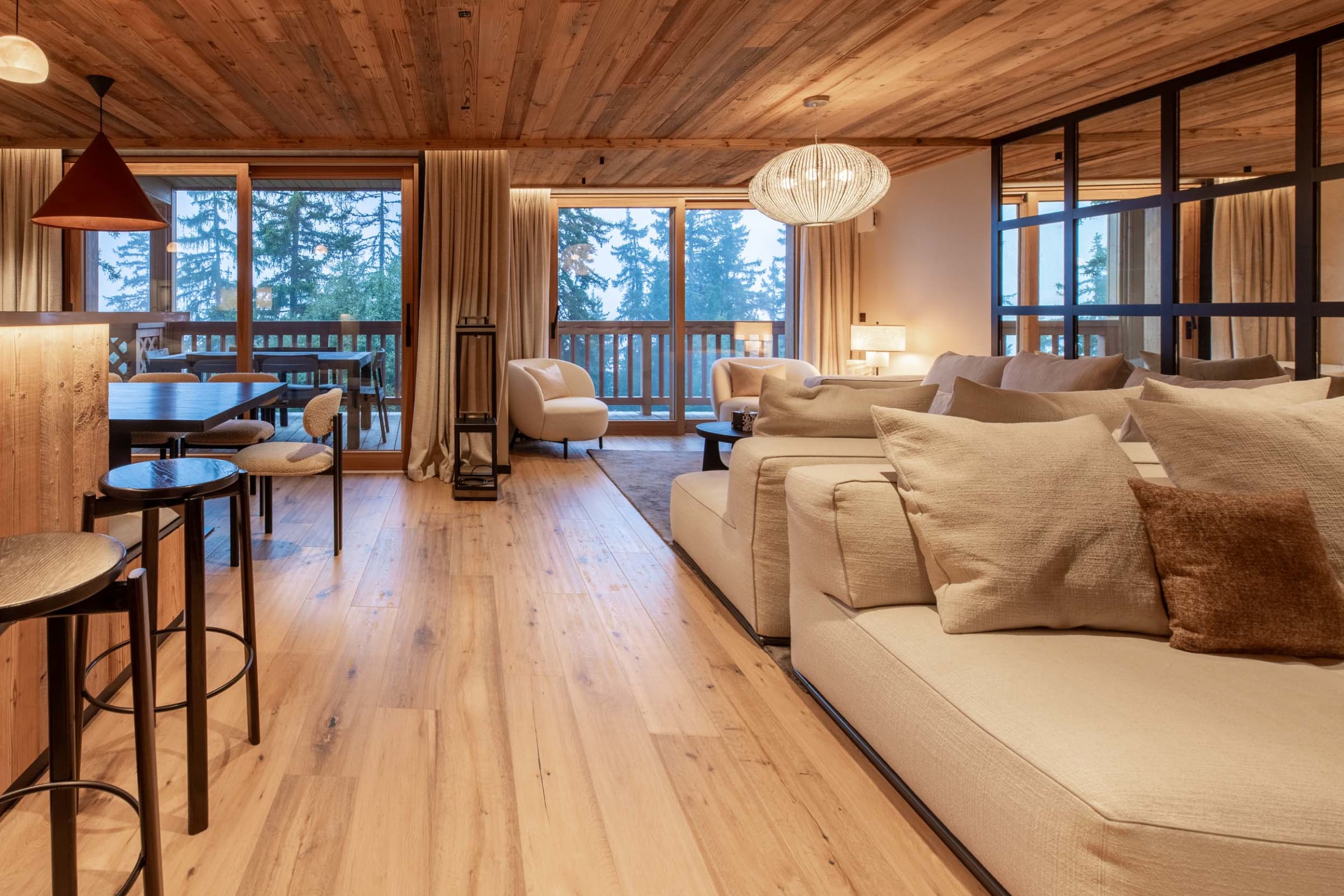 The residence features a unique wellness area: 25m indoor pool, multi-temperature pools, salt grotto, sauna & hammam, beauty clinic, ice fountain, 10 cabins, private relaxation cocoons, an Alpine herbal tea room and a cryo suite.