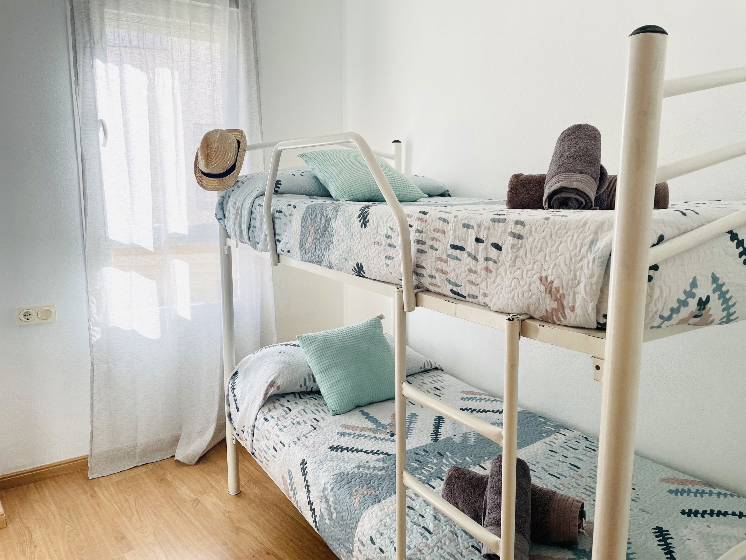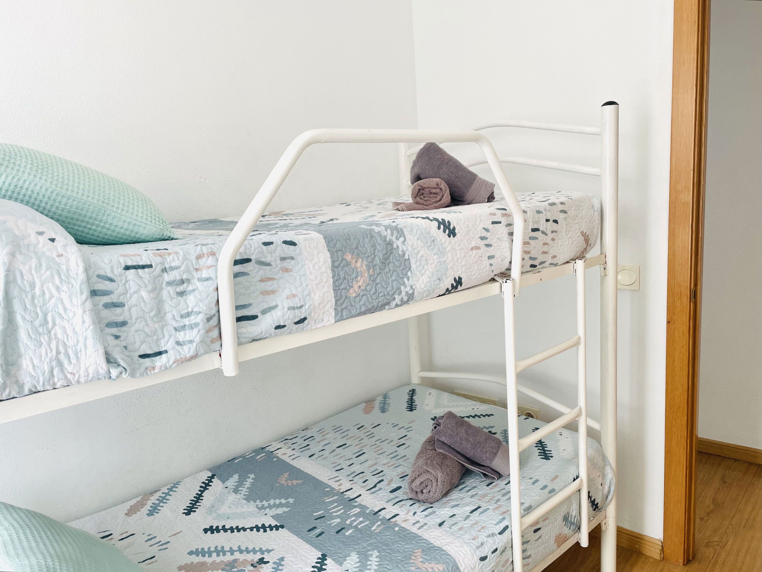 The apartment features 2 bedrooms, one with a double bed and the other with a bunk bed, a full bathroom, and a living room with a TV lounge area. The kitchen is fully equipped with a stove, microwave, refrigerator, washing machine, coffee maker, and kettle.