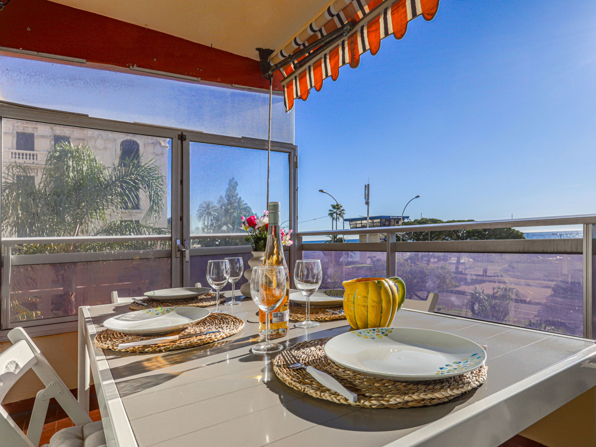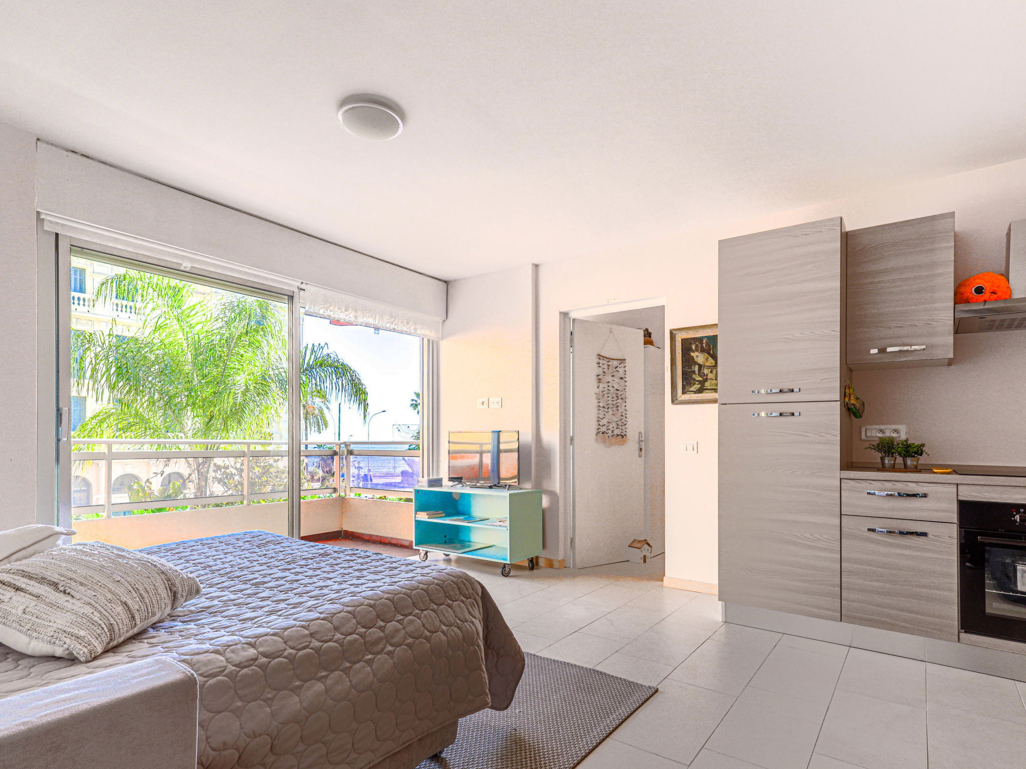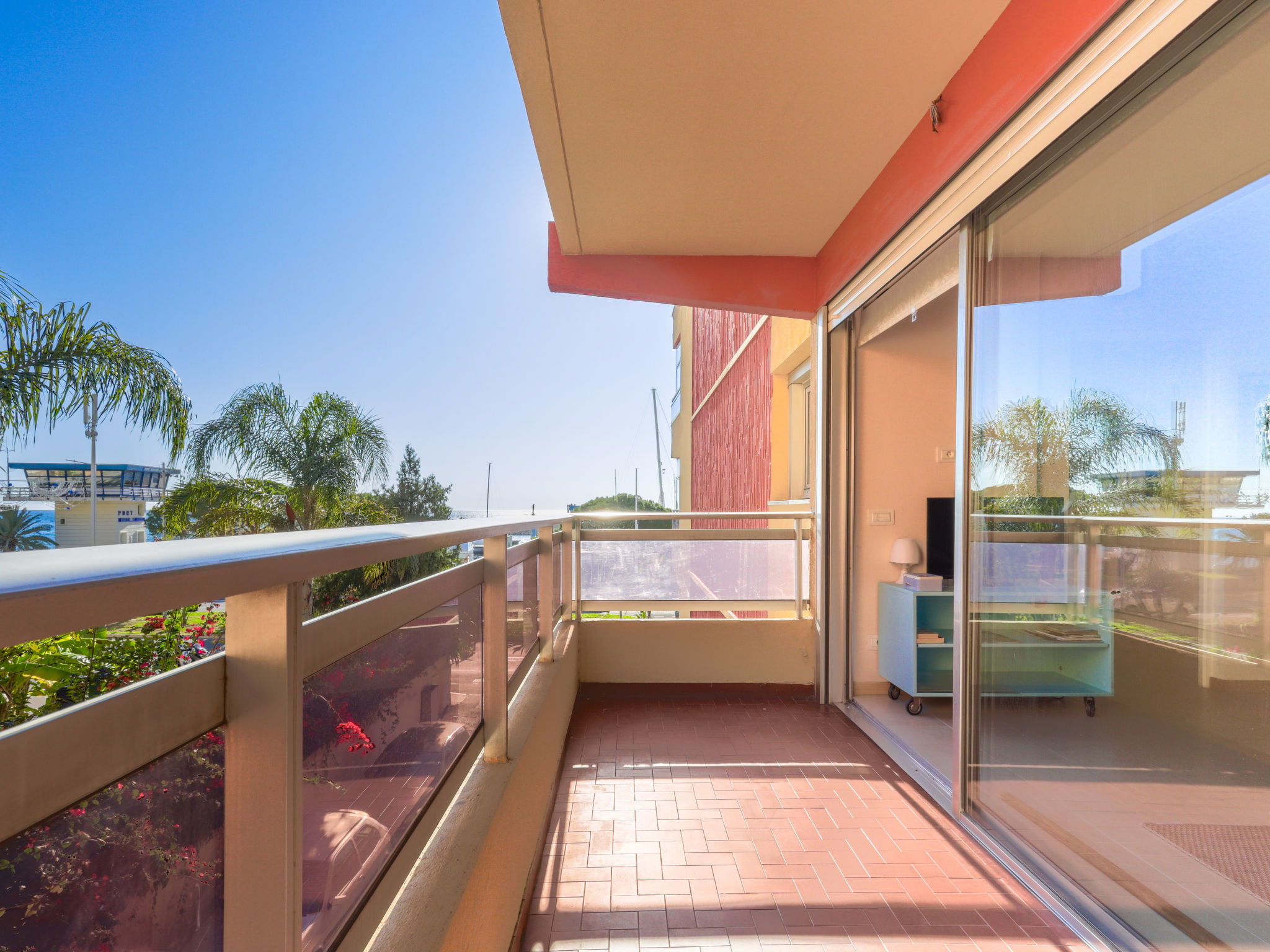 2-room apartment 60 m2 on 2nd floor. Bright, beautiful and modern furnishings: living/sleeping room with panoramic window with 1 double sofabed (1 x 140 cm, length 190 cm), flat screen and air conditioning. Exit to the terrace, south facing position. 1 large room with 1 double bed (1 x 140 cm, length 190 cm), air conditioning. Exit to the terrace, east facing position with shower/bidet/WC. Open kitchen (oven, 4 induction hot plates, toaster, kettle, microwave, electric coffee machine). Shower/bidet/WC. Terrace 10 m2, south facing position. Terrace furniture, sitting area. Very beautiful view of the port. Facilities: washing machine. Internet (WiFi, free). Garage (1 car). Please note: 1 small pet/ dog allowed. Smoke alarm. Offer by a private individual according to Art. 155, IV of CGI. 06083003278GA