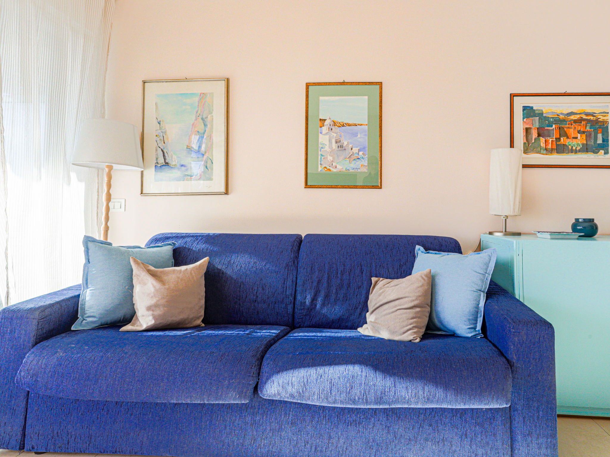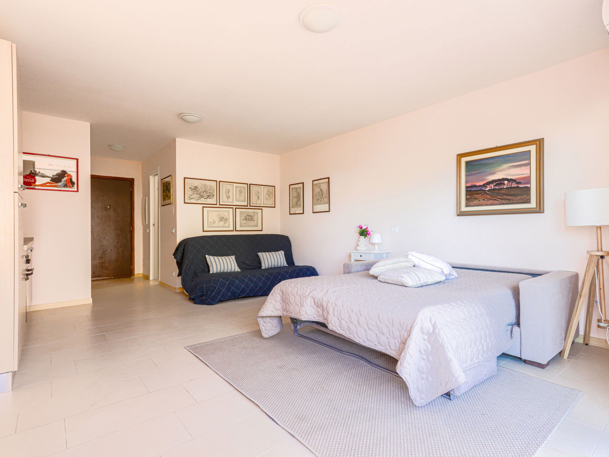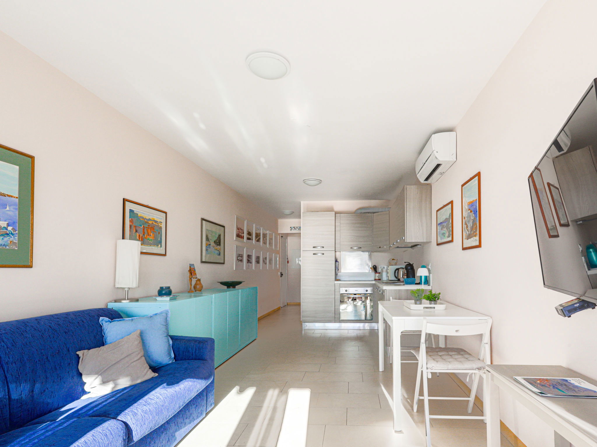 2-room apartment 60 m2 on 2nd floor. Bright, beautiful and modern furnishings: living/sleeping room with panoramic window with 1 double sofabed (1 x 140 cm, length 190 cm), flat screen and air conditioning. Exit to the terrace, south facing position. 1 large room with 1 double bed (1 x 140 cm, length 190 cm), air conditioning. Exit to the terrace, east facing position with shower/bidet/WC. Open kitchen (oven, 4 induction hot plates, toaster, kettle, microwave, electric coffee machine). Shower/bidet/WC. Terrace 10 m2, south facing position. Terrace furniture, sitting area. Very beautiful view of the port. Facilities: washing machine. Internet (WiFi, free). Garage (1 car). Please note: 1 small pet/ dog allowed. Smoke alarm. Offer by a private individual according to Art. 155, IV of CGI. 06083003278GA