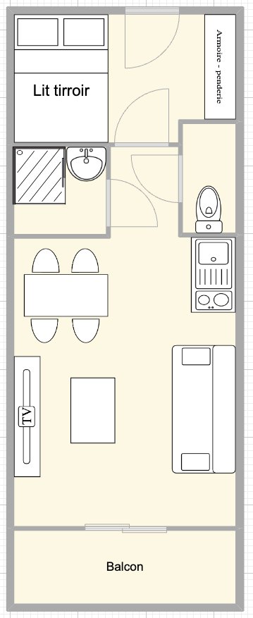 Studio cabin apartment located on the 1st floor of the residence without elevator (1 floor to go up), facing south/east with balcony.