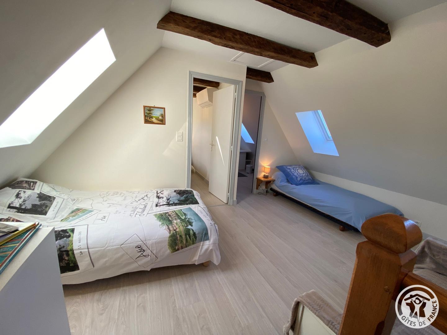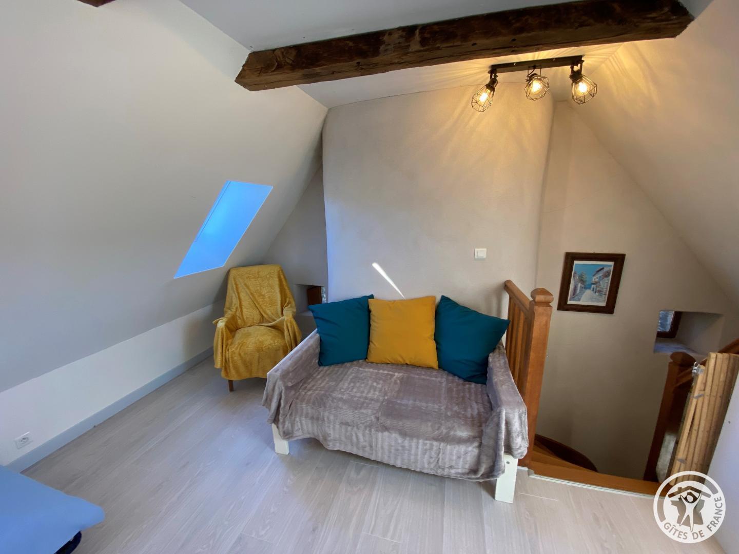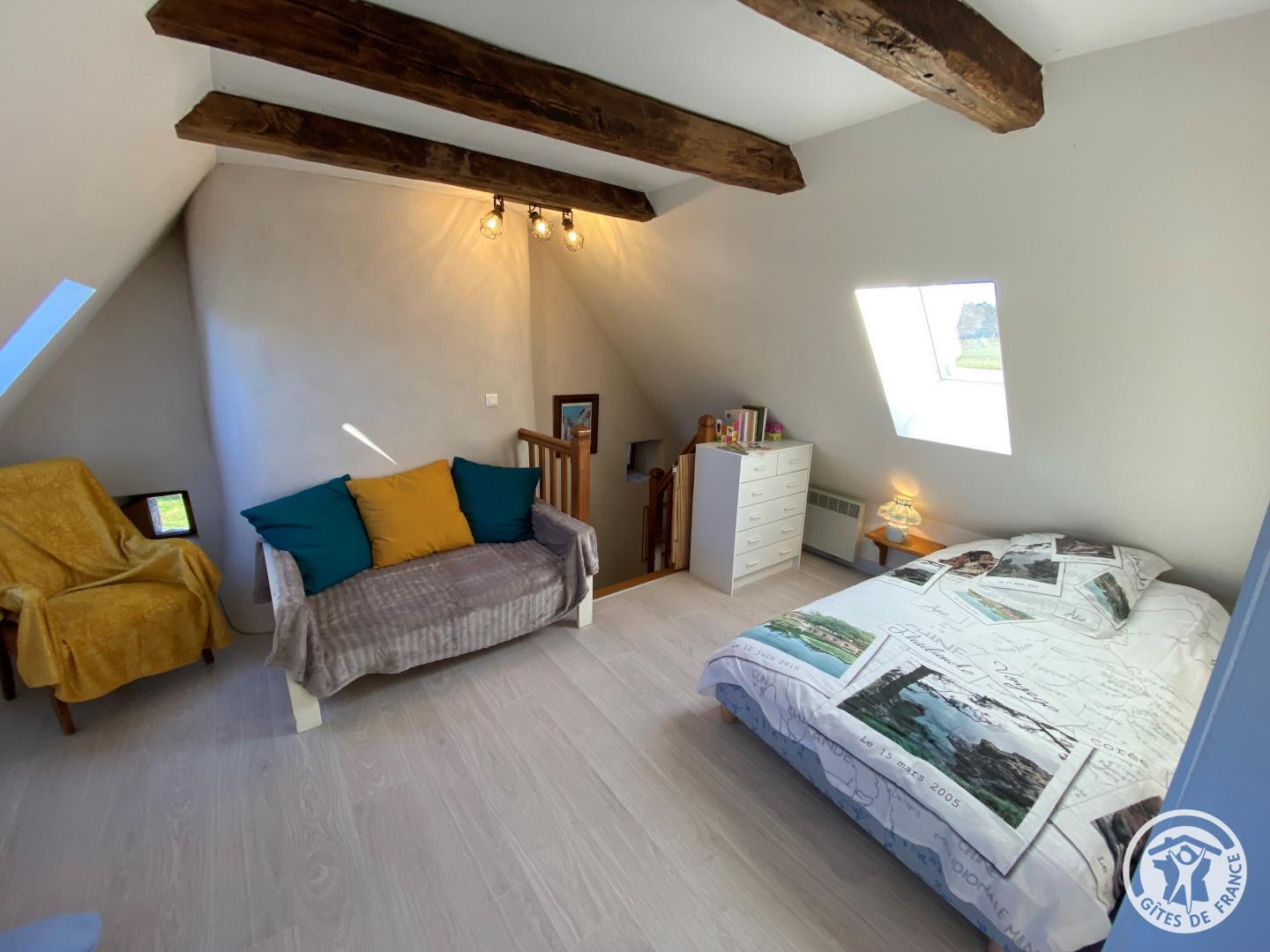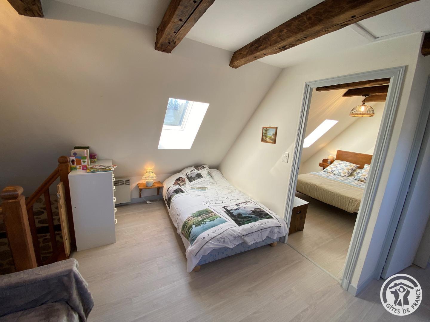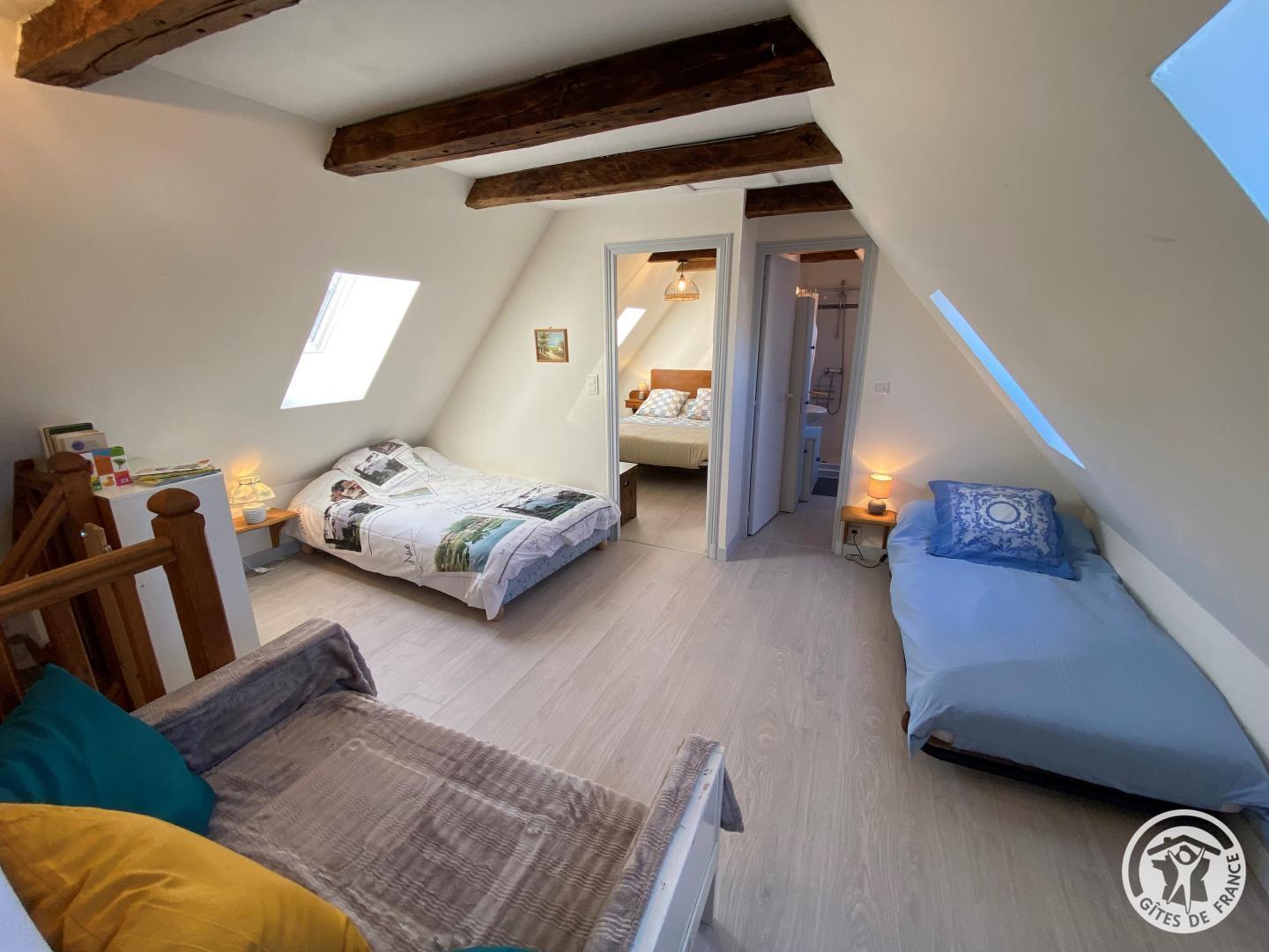Upstairs, a bedroom has a 140 cm bed, accompanied by a bathroom equipped with a shower and shared toilet. The mezzanine offers two additional beds, ideal for accommodating your guests.