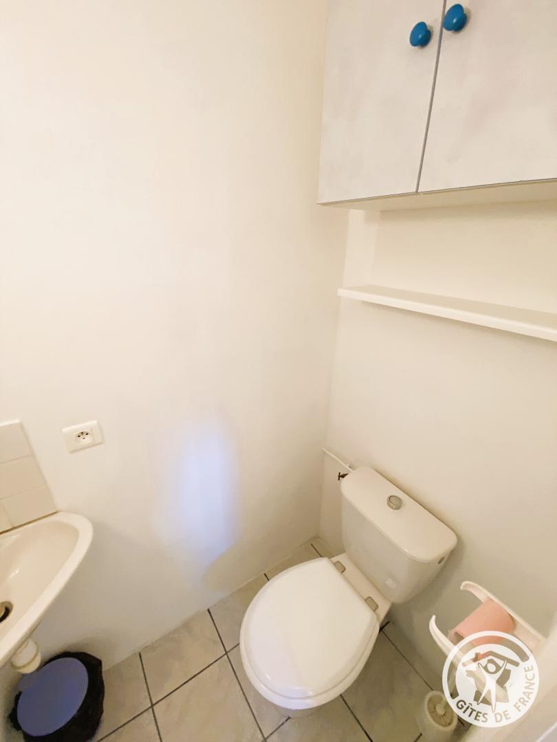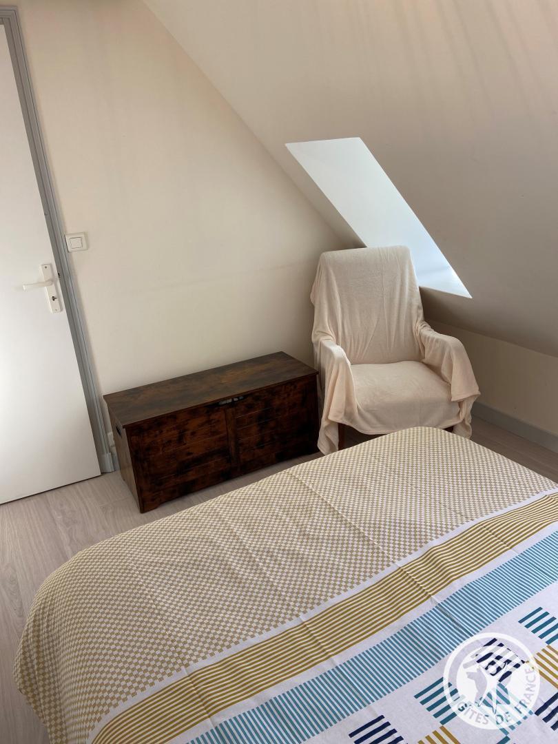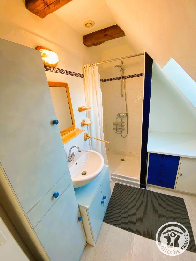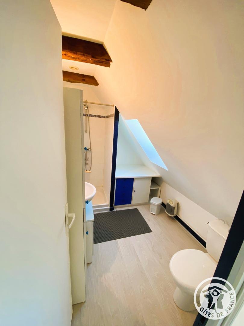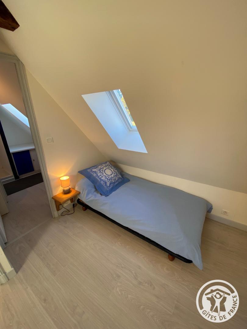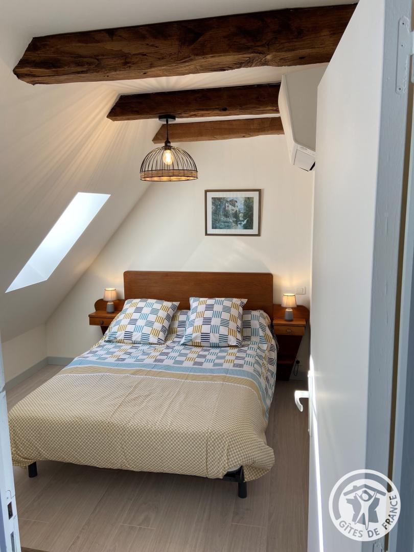 Upstairs, a bedroom has a 140 cm bed, accompanied by a bathroom equipped with a shower and shared toilet. The mezzanine offers two additional beds, ideal for accommodating your guests.