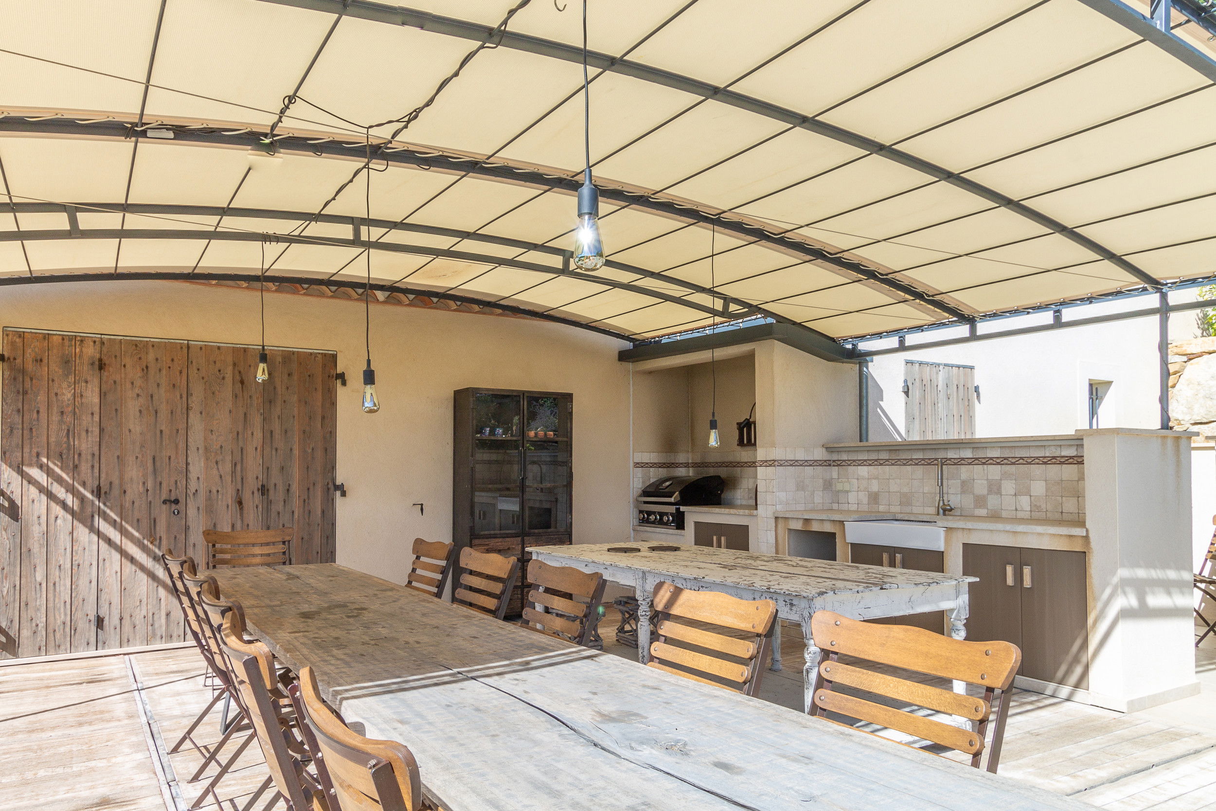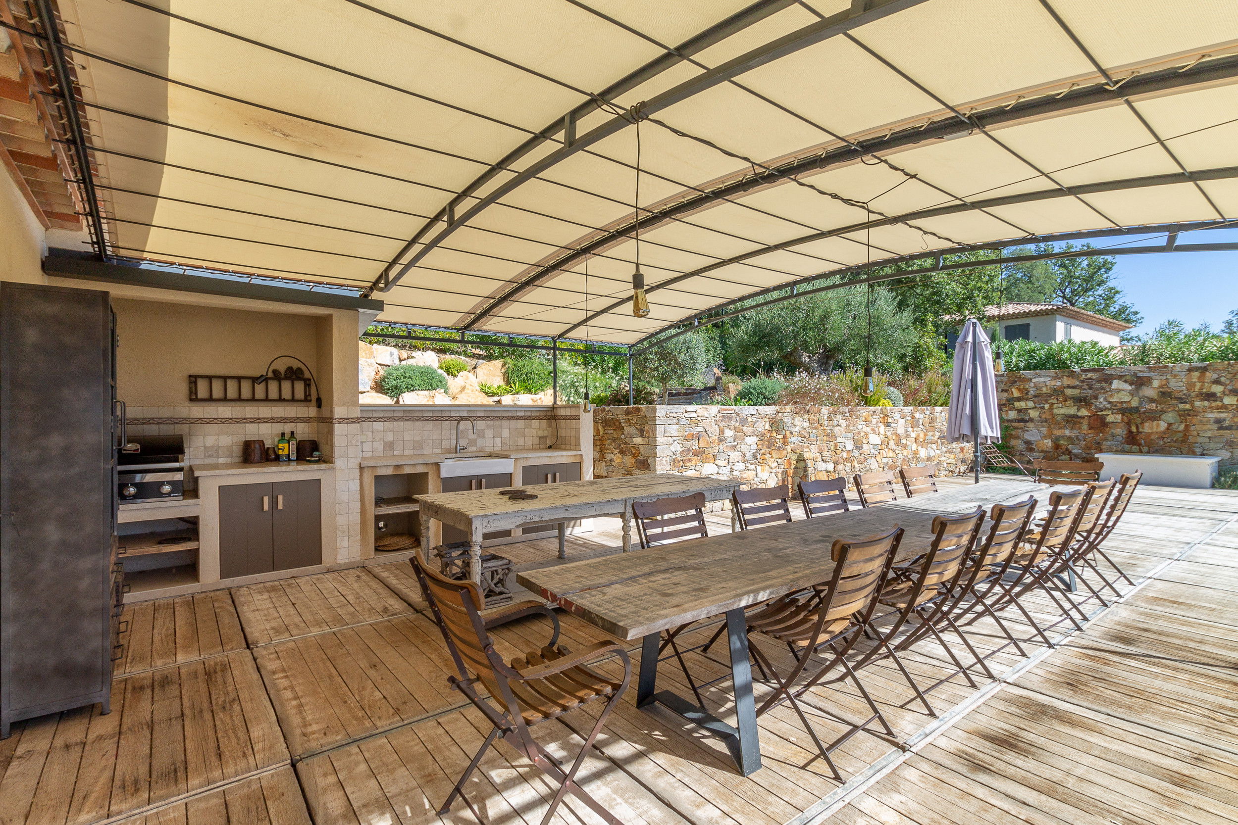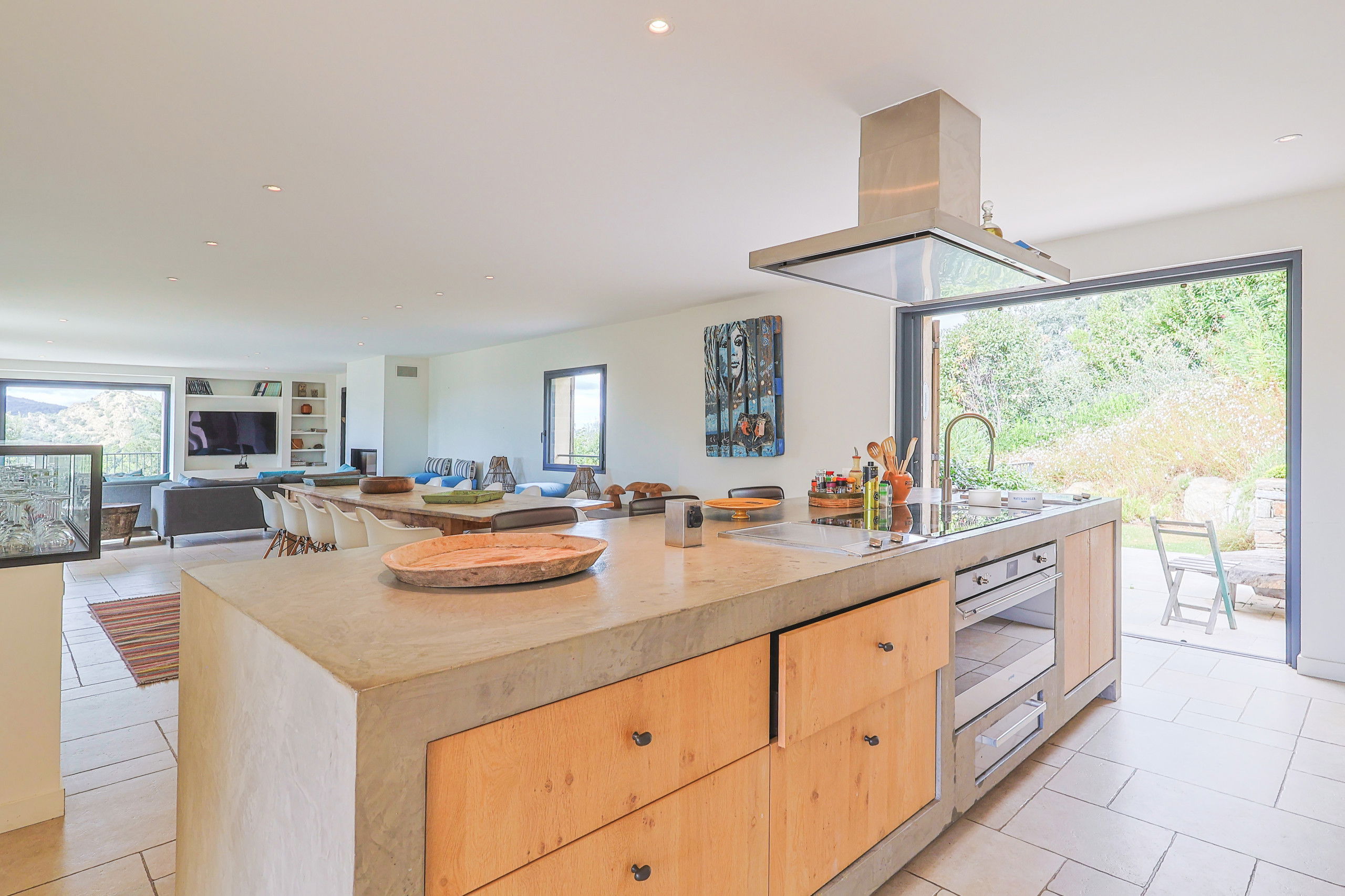 The outdoor kitchen is fully-fitted (barbecue, induction cooker, sink) allowing you to have a lovely dinner at the large table on the covered terrace while enjoying the wonderful view.