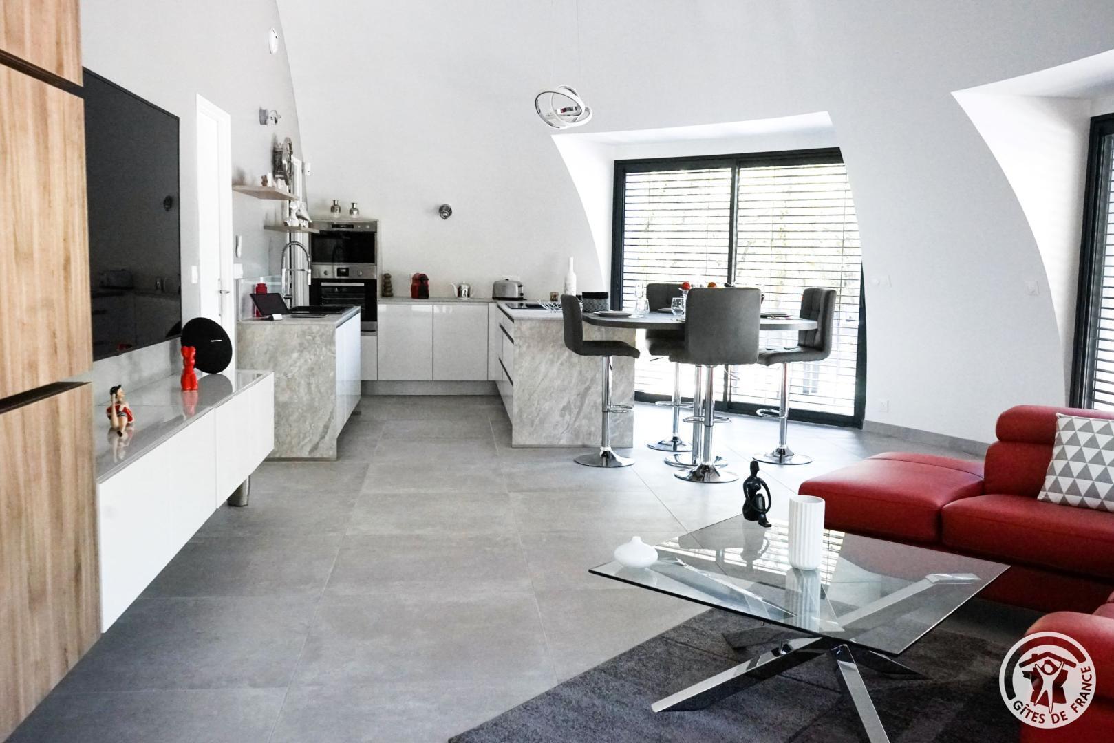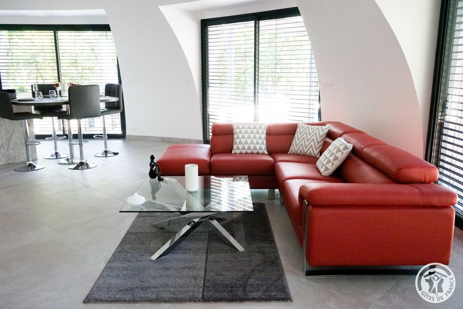The 45m² living room with leather sofa, 190cm TV, Harman Kardon speakers and high-tech kitchen offer a striking contrast: that of space, luxury and design in the heart of nature.